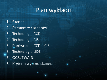 Plan wykładu 1. 2. 3. 4. 5. 6. 7. 8. Skaner Parametry skanerów Technologia CCD Technologia CIS Porównanie CCD i CIS Technologia LiDE OCR, TWAIN Kryteria wyboru skanera Skaner Podstawowe rodzaje skanerów: • Skanery bębnowe (ang. drum scanners) – profesjonalne skanery wykorzystywane w studiach poligraficznych do skanowania przezroczystych materiałów (np. klisz foto) • Skanery płaskie (ang. flatbed scanners) – powszechnie używane w domach i biurach, materiał do skanowania umieszczany jest na poziomej szybie. • Skanery ręczne (ang. handheld scanners) – umożliwia skanowanie tekstu wiersz po wierszu, tuż po skanowaniu uruchamiany jest moduł OCR Parametry skanerów • rozdzielczość optyczna (ang. optical resolution) - wyrażona w dpi, podstawowy i najważniejszy parametr skanera, ponieważ im większa jest rozdzielczość układu optycznego, tym lepsza jest jakość cyfrowego odpowiednika zeskanowanego obrazu. Rozdzielczość optyczna określa rzeczywistą, sprzętową zdolność skanera do odzwierciedlenia obrazu, w przeciwieństwie do rozdzielczości interpolowanej • rozdzielczość interpolowana - wyrażona także w dpi, często podawana przez producentów skanerów w celu przyciągnięcia uwagi kupującego. Jest to zazwyczaj niebotycznie wysoka rozdzielczość obrazu, nie ma jednak nic wspólnego z jakością układu optycznego skanera, bo uzyskiwana jest matematycznie (na gotowym obrazie) poprzez porównywanie kolorów leżących obok siebie pikseli, obliczeniu średniej wartości koloru i wstawieniu dodatkowych, wirtualnych pikseli Parametry skanerów cd. • głębia kolorów (ang. color depth) - standardem we współczesnych skanerach jest możliwość odzwierciedlenia co najmniej 24-bitowej palety barw, co oznacza iż pojedynczy piksel obrazu może przyjąć jeden kolor z 16,8 miliona odcieni (tyle rozróżnia ludzkie oko) • gęstość optyczna (ang. optical density) - wyrażona w jednostce D (Density) określa zdolność skanera do rozróżniania odcieni barw. Skanery profesjonalne powinny się charakteryzować gęstością powyżej 3 D, zaś skanery domowe i półprofesjonalne nie mniejszą niż 2,5 D • możliwość skanowania filmów - niektóre skanery zostały wyposażone w przystawki pozwalające skanować filmy (zarówno negatywy klisz jak i zdjęcia pozytywowe) Technologia CCD W skanerach CCD używa się do oświetlenia skanowanego dokumentu podłużnej, przypominającej świetlówkę lampy z zimną katodą (jej długość odpowiada szerokości obszaru skanowania). Emituje ona intensywne światło, zbliżone barwą do naturalnego. Lampa znajdująca się tuż pod szybą skanera, na której kładzie się materiał do skanowania, jest przymocowana do specjalnego wózka napędzanego silnikiem krokowym. Dzięki temu źródło światła może znaleźć się bezpośrednio pod każdym fragmentem skanowanego dokumentu, zapewniając jego równomierne oświetlenie. Odbite od kartki światło trafia do układu optycznego (zespołu pryzmatów i soczewek), zamocowanego na tym samym wózku, na którym znajduje się lampa. Obraz przetwarzany jest linia po linii – jeden krok silnika przesuwającego lampę wraz z układem optycznym pod kartką odpowiada jednej linii zeskanowanego obrazu. Po przejściu przez soczewki światło niosące informację o obrazie trafia na przetwornik CCD. Tam obraz jest zamieniany na postać cyfrową, a dzięki filtrom RGB (czerwony, zielony, niebieski) – ułożonym naprzemiennie nad czujnikami przetwornika – zyskuje kolory. Technologia CCD cd. Technologia CIS Technologia CIS bazuje na miniaturowych diodach LED emitujących światło w trzech podstawowych kolorach (zielonym, niebieskim oraz czerwonym) i oświetlających skanowaną kartkę. Diody umieszczone są na wspólnej listwie, przesuwającej się pod dokumentem tak jak lampa w skanerach CCD. Tuż obok diod LED na listwie znajdują się elementy światłoczułe, na które trafiają promienie światła odbitego od skanowanego oryginału. W skanerach CIS skanowanie przebiega w skali 1:1. Nie ma też układu optycznego, bo przetworniki obrazu są tuż obok źródła światła. Technologia CIS jest tańsza w produkcji niż CCD – stosunkowo drogą optykę i lampę zastąpiły tanie elementy półprzewodnikowe. Do zasilania listwy półprzewodnikowej nie potrzeba dużo energii, więc skaner CIS może być zasilany przez złącze USB i nie wymaga, tak jak CCD, oddzielnego zasilacza. Korzystając z modeli CIS, nie trzeba też czekać na rozgrzanie się lampy – skaner taki jest od razu gotowy do pracy. Brak lampy sprawia, że skanery CIS mają małe rozmiary i są bardzo lekkie – mogą być niewiele grubsze i niewiele cięższe od typowego zeszytu A4, podczas gdy CCD mają grubość sporej książki i ważą zwykle ponad półtora kilograma, a czasem nawet 5–6 kg. Niestety, skanery CIS mają też poważne wady. Technologia CIS cd. Porównanie CCD i CIS Ze względu na sposób działania i mniejszą czułość zintegrowanych elementów światłoczułych skanery CIS gorzej niż urządzenia CCD odwzorowują barwy – mogą lekko zmieniać kolory skanowanych zdjęć i nie oddają tak dobrze jak skanery CCD delikatnych przejść tonalnych i szczegółów w ciemnych i bardzo jasnych partiach fotografii. Skanery CIS z powodu braku układu optycznego źle skanują dokumenty, które nie przylegają do szyby – wystarczy, że obiekt będzie odstawał o pół milimetra, a powstały po zeskanowaniu obraz już może stracić na ostrości. Trzeba więc dobrze przycisnąć dokument przykrywą. Skanowanie obiektów przestrzennych jest w ogóle niemożliwe. Natomiast za pomocą skanerów CCD bez problemu zrobimy „zdjęcie” jakiegoś przedmiotu, który chcemy np. wystawić na aukcji internetowej. Wystarczy go położyć wprost na szybie skanera. Technologia CIS oferuje gorszą rozdzielczość i gęstość optyczną niż urządzenia CCD. Za pomocą skanerów CIS nie da się skanować slaj