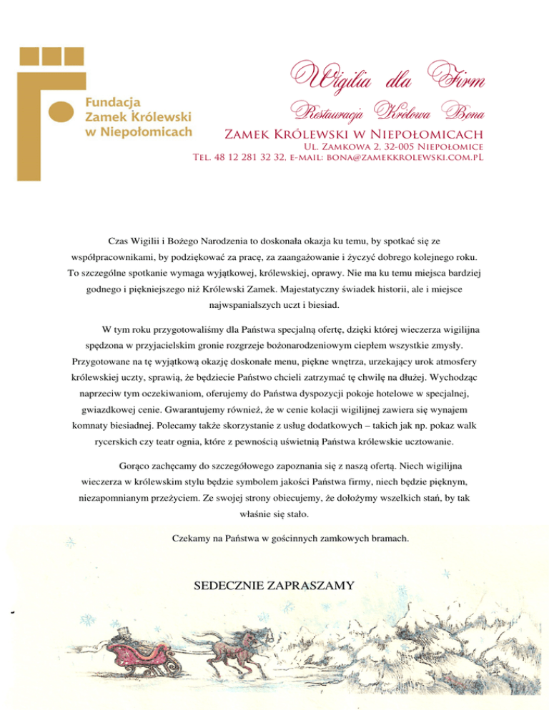 Wigilia dla Firm Restauracja Królowa Bona Zamek Królewski w Niepołomicach Ul. Zamkowa 2, 32-005 Niepołomice Tel. 48 12 281 32 32, e-mail: [email protected] Czas Wigilii i Bożego Narodzenia to doskonała okazja ku temu, by spotkać się ze współpracownikami, by podziękować za pracę, za zaangażowanie i życzyć dobrego kolejnego roku. To szczególne spotkanie wymaga wyjątkowej, królewskiej, oprawy. Nie ma ku temu miejsca bardziej godnego i piękniejszego niż Królewski Zamek. Majestatyczny świadek historii, ale i miejsce najwspanialszych uczt i biesiad. W tym roku przygotowaliśmy dla Państwa specjalną ofertę, dzięki której wieczerza wigilijna spędzona w przyjacielskim gronie rozgrzeje bożonarodzeniowym ciepłem wszystkie zmysły. Przygotowane na tę wyjątkową okazję doskonałe menu, piękne wnętrza, urzekający urok atmosfery królewskiej uczty, sprawią, że będziecie Państwo chcieli zatrzymać tę chwilę na dłużej. Wychodząc naprzeciw tym oczekiwaniom, oferujemy do Państwa dyspozycji pokoje hotelowe w specjalnej, gwiazdkowej cenie. Gwarantujemy również, że w cenie kolacji wigilijnej zawiera się wynajem komnaty biesiadnej. Polecamy także skorzystanie z usług dodatkowych – takich jak np. pokaz walk rycerskich czy teatr ognia, które z pewnością uświetnią Państwa królewskie ucztowanie. Gorąco zachęcamy do szczegółowego zapoznania się z naszą ofertą. Niech wigilijna wieczerza w królewskim stylu będzie symbolem jakości Państwa firmy, niech będzie pięknym, niezapomnianym przeżyciem. Ze swojej strony obiecujemy, że dołożymy wszelkich stań, by tak właśnie się stało. Czekamy na Państwa w gościnnych zamkowych bramach. SEDECZNIE ZAPRASZAMY Wigilia dla Firm Restauracja Królowa Bona Zamek Królewski w Niepołomicach Ul. Zamkowa 2, 32-005 Niepołomice Tel. 48 12 281 32 32, e-mail: [email protected] Menu 1 Zupa Barszcz czerwony z uszkami Danie główne Karp na maśle smażony z ziemniaczkami i kapustą z grzybami Deser Kluski z makiem, rodzynkami i miodem Kompot wigilijny z suszu (200ml/os.) 50,00 zł/ os. Wigilia dla Firm Restauracja Królowa Bona Zamek Królewski w Niepołomicach Ul. Zamkowa 2, 32-005 Niepołomice Tel. 48 12 281 32 32, e-mail: [email protected] Menu 2 Zupa Zupa grzybowa z łazankami Danie główne Karp lub pstrąg smażony na maśle, pierogi z kapustą i grzybami, surówka z czerwonej kapusty Deser Wybór tradycyjnych ciast świątecznych :makowiec, sernik, szarlotka, cwibak Kompot wigilijny z suszu (200ml/) 50,00 zł /os. Wigilia dla Firm Restauracja Królowa Bona Zamek Królewski w Niepołomicach Ul. Zamkowa 2, 32-005 Niepołomice Tel. 48 12 281 32 32, e-mail: [email protected] Menu 3 Przystawka Strudel z kapustą na sosie grzybowym Zupa Barszcz czerwony z uszkami Danie główne Pstrąg filetowany w towarzystwie bukietu warzyw, sosu winnego z ziemniaczkami puree Deser Kutia Wigilijna Lampka wina białe lub czerwone Napoje ciepłe i zimne kawa, herbata, soki owocowe, woda mineralna 65,00 zł /os. Wigilia dla Firm Restauracja Królowa Bona Zamek Królewski w Niepołomicach Ul. Zamkowa 2, 32-005 Niepołomice Tel. 48 12 281 32 32, e-mail: [email protected] Menu 4 Przystawka Duet ryb (łosoś i sandacz) w galarecie Zupa Zupa grzybowa z łazankami Danie główne Karp filetowany, ziemniaczki, surówka z kapusty kiszonej Deser Kutia Wigilijna lampka wina białe lub czerwone Napoje ciepłe i zimne kawa, herbata, soki owocowe, woda mineralna 65,00 zł /os. Wigilia dla Firm Restauracja Królowa Bona Zamek Królewski w Niepołomicach Ul. Zamkowa 2, 32-005 Niepołomice Tel. 48 12 281 32 32, e-mail: [email protected] Menu 5 Przystawka Tymbelik rybny z sosem tatarskim Zupa Barszczyk z uszkami Danie główne Dorsz panierowany z czerwoną kapustą wigilijną i opiekanymi ziemniaczkami w aromacie czosnku i świeżych ziół Deser Kutia Kompot z suszek Lampka wina białe lub czerwone Napoje ciepłe i zimne bez ograniczeń Kawa, herbata, soki owocowe, woda mineralna 65,00 zł / os. Wigilia dla Firm Restauracja Królowa Bona Zamek Królewski w Niepołomicach Ul. Zamkowa 2, 32-005 Niepołomice Tel. 48 12 281 32 32, e-mail: [email protected] Menu 5 Przystawka Warkocz rybny podany na kolorowej sałatce, sos cytrynowy Zupa Zupa grzybowa z łazankami Danie główne Filet z morszczuka duszony w sosie śmietanowym w towarzystwie ziemniaków puree, warzywa gotowane Deser Strudel jabłkowy na sosie waniliowym Kompot z suszek Lampka wina białe lub czerwone Napoje ciepłe i zimne bez ograniczeń Kawa, herbata, soki owocowe, woda mineralna 80,00 zł / os. Wigilia dla Firm Restauracja Królowa Bona Zamek Królewski w Niepołomicach Ul. Zamkowa 2, 32-005 Niepołomice Tel. 48 12 281 32 32, e-mail: [email protected] Przekąski zimne w formie szwedzkiego stołu, mogą być dołączone do kolacji wigilijnej Półmiski pieczonych mięs( schab ze śliwka, karczek szefa kuchni, boczek, pasztet z orzechami, szynka wiejska, kabanoski ) Śledzie w zalewie pieprzowej Ryba po grecku Karp w galarecie Sałatka tradycyjna jarzynowa Sałatka tuńczykowa –nicejska Pomidory przekładane mozzarellą na Rukli Dodatki: pieczywo pszenne i żytnie, masła smakowe, pikle, sosy Ciasta tradycyjne, owoce 55,00 zł /os. Przekąski zimne w formie szwedzkiego stołu, mogą być dołączone do kolacji wigilijnej Półmiski pieczonych mięs( schab ze śliwka, karczek szefa kuchni, boczek, pasztet z orzechami, szynka wiejska, kabanoski) Róże z łososia wędzonego w Pesto Karp po żydowsku Sałatka śledziowa Półmisek jaj z kawiorem Pene z łososiem, fetą i bazylią Dodatki: pieczywo pszenne i żytnie, masła smakowe, pikle, sosy Ciasta tradycyjne, owoce 55,00 zł /os Wigilia dla Firm Restauracja Królowa Bona Zamek Królewski w Niepołomicach Ul. Zamkowa 2, 32-005 Niepołomice Tel. 48 12 281 32 32, e-mail: [email protected] Zimne przekąski – na bufecie Kanapeczki tartinki koreczki sałatka z tuńczykiem sałatka grecka sałatka z owoców morza w sosie koktajlowym ka