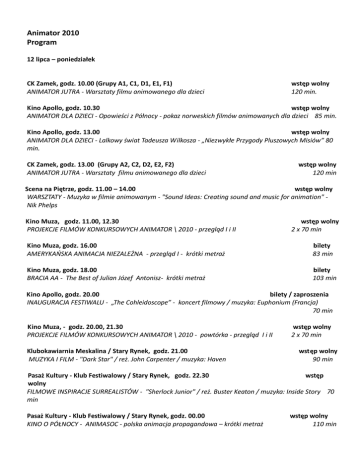 Animator 2010 Program 12 lipca – poniedziałek CK Zamek, godz. 10.00 (Grupy A1, C1, D1, E1, F1) ANIMATOR JUTRA - Warsztaty filmu animowanego dla dzieci wstęp wolny 120 min. Kino Apollo, godz. 10.30 wstęp wolny ANIMATOR DLA DZIECI - Opowieści z Północy - pokaz norweskich filmów animowanych dla dzieci 85 min. Kino Apollo, godz. 13.00 wstęp wolny ANIMATOR DLA DZIECI - Lalkowy świat Tadeusza Wilkosza - „Niezwykłe Przygody Pluszowych Misiów” 80 min. CK Zamek, godz. 13.00 (Grupy A2, C2, D2, E2, F2) ANIMATOR JUTRA - Warsztaty filmu animowanego dla dzieci wstęp wolny 120 min Scena na Piętrze, godz. 11.00 – 14.00 wstęp wolny WARSZTATY - Muzyka w filmie animowanym - "Sound Ideas: Creating sound and music for animation" Nik Phelps Kino Muza, godz. 11.00, 12.30 PROJEKCJE FILMÓW KONKURSOWYCH ANIMATOR \ 2010 - przegląd I i II wstęp wolny 2 x 70 min Kino Muza, godz. 16.00 AMERYKAŃSKA ANIMACJA NIEZALEŻNA - przegląd I - krótki metraż bilety 83 min Kino Muza, godz. 18.00 BRACIA AA - The Best of Julian Józef Antonisz- krótki metraż bilety 103 min Kino Apollo, godz. 20.00 bilety / zaproszenia INAUGURACJA FESTIWALU - „The Cohleidoscope” - koncert filmowy / muzyka: Euphonium (Francja) 70 min Kino Muza, - godz. 20.00, 21.30 PROJEKCJE FILMÓW KONKURSOWYCH ANIMATOR \ 2010 - powtórka - przegląd I i II Klubokawiarnia Meskalina / Stary Rynek, godz. 21.00 MUZYKA I FILM - "Dark Star" / reż. John Carpenter / muzyka: Haven wstęp wolny 2 x 70 min wstęp wolny 90 min Pasaż Kultury - Klub Festiwalowy / Stary Rynek, godz. 22.30 wstęp wolny FILMOWE INSPIRACJE SURREALISTÓW - "Sherlock Junior" / reż. Buster Keaton / muzyka: Inside Story 70 min Pasaż Kultury - Klub Festiwalowy / Stary Rynek, godz. 00.00 KINO O PÓŁNOCY - ANIMASOC - polska animacja propagandowa – krótki metraż wstęp wolny 110 min 13 lipca – wtorek CK Zamek, godz. 10.00 (Grupy A1, B1, C1, D1, E1, F1) wolny ANIMATOR JUTRA - Warsztaty filmu animowanego dla dzieci. wstęp 120 min. Kino Apollo, godz. 10.30 wstęp wolny ANIMATOR DLA DZIECI - Lalkowy świat Tadeusza Wilkosza - „Niezwykłe Przygody Pluszowych Misiów” 80 min. Kino Apollo, godz. 13.00 wstęp wolny ANIMATOR DLA DZIECI - Opowieści z Północy - pokaz norweskich filmów animowanych dla dzieci 85 min. CK Zamek, godz. 13.00 (Grupy A2, C2, D2, E2, F2) ANIMATOR JUTRA - Warsztaty filmu animowanego dla dzieci. wstęp wolny 120 min. Scena na Piętrze, godz. 11.00 – 14.00 wstęp wolny WARSZTATY - Muzyka w filmie animowanym - "Sound Ideas: Creating sound and music for animation" Nik Phelps Kino Muza, godz. 11.00, 12.30 PROJEKCJE FILMÓW KONKURSOWYCH ANIMATOR \ 2010 - przegląd III i IV wstęp wolny 2 x 70 min. Kino Muza, godz. 14.00 ANIMACJA Z IZRAELA - krótki metraż bilety 90 min Kino Muza, godz. 16.00 FESTIWALE - Black Maria Film + Video Festival (USA) - przegląd I - krótki metraż bilety 90 min. Kino Apollo, godz. 17.30 RETROSPEKTYWY MISTRZÓW - Jurij Norstein - krótki metraż bilety 80 min. Kino Muza, godz. 18.00 BRACIA AA - The Best of Richard Antonius - krótki metraż bilety 95 min. Kino Apollo, godz. 20.00 RETROSPEKTYWY MISTRZÓW - György Kovásznai - krótki metraż Kino Muza, godz. 20.00, 21.30 PROJEKCJE FILMÓW KONKURSOWYCH ANIMATOR \ 2010 - powtórka - przegląd III i IV bilety 95 min. wstęp wolny 2 x 70 min. Klubokawiarnia Meskalina / Stary Rynek, godz. 21.00 bilety ANIMACJA I MUZYKA - „Henry Mancini, Nino Rota i inni” - Nik Phelps & The Sprocket Ensemble – koncert jazzowej muzyki filmowej 90 min Pasaż Kultury – Klub Festiwalowy / Stary Rynek, godz. 22.30 wstęp wolny ANIMACJA I MUZYKA - “Heaven And Earth Magic” / reż. Harry Smith / muzyka: Compagnia d’Arte Drummatica (Włochy) 66 min. Pasaż Kultury – Klub Festiwalowy / Stary Rynek, godz. 00.00 wstęp wolny KINO O PÓŁNOCY - Legendy animacji z Chicago - filmy Heather McAdams i Sharon Couzin 65 min. 14 lipca – środa CK Zamek, godz. 10.00 (Grupy A1, B1, C1, D1, E1, F1) ANIMATOR JUTRA - Warsztaty filmu animowanego dla dzieci. CK Zamek, Sala Kameralna, godz. 10.00, 10.45, 11.30, 12.15 ANIMATOR DLA DZIECI - Bajki Dla Najnajmłodszych – Beztroski I wstęp wolny 120 min. wstęp wolny 30 min. Kino Apollo, godz. 10.30 ANIMATOR DLA DZIECI - Lalkowy świat Tadeusza Wilkosza - „Tajemnica Kwiatu Paproci” wstęp wolny 80 min. Kino Apollo, godz. 13.00 ANIMATOR DLA DZIECI - Baśnie Monsieur Ocelota - ”Azur i Asmar” wstęp wolny 100 min. CK Zamek, godz. 13.00 (Grupy A2, B1, C2, D2, E2, F2) ANIMATOR JUTRA - Warsztaty filmu animowanego dla dzieci wstęp wolny 120 min. Klubokawiarnia Meskalina / Stary Rynek, godz. 10.00, 12.00, 14.00 WARSZTATY MŁODEGO ANIMATORA - Szkoła Animacji Toon Boom, Grupy A, B, C wstęp wolny 120 min. Scena na Piętrze, godz. 11.00 – 14.00 wstęp wolny WARSZTATY - Muzyka w filmie animowanym - "Sound Ideas: Creating sound and music for animation" Nik Phelps Scena na Piętrze – Galeria OKO/UCHO, godz. 12.00 WYKŁADY - “Personally different – creating animation as an adventure” - Tsvika Oren Kino Muza, godz. 11.00, 12.30 PROJEKCJE FILMÓW KONKURSOWYCH ANIMATOR \ 2010 – przegląd V i VI wstęp wolny 90 min. wstęp wolny 2 x70 min. Kino Muza, godz. 16.00 AMERYKAŃSKA ANIMACJA NIEZALEŻNA - przegląd II - krótki metraż bilety 80 min. Kino Apollo, godz. 17.30 ANIMACJA I MUZYKA - Filmy z muzyką Włodzimierza Kotońskiego - krótki metraż bilety 80 min. Kino Muza, godz. 18.00 PREMIERA - "Diabelskie Dzieci" / reż. Mariola Brillowska / DOROŚLI bilety 70 min. Kino Apollo, godz. 20.00 PREMIERA - “Luke and Lucy: The Texas Rangers” / reż. Wim Bien i Mark Mertens bilety 80 min. Kino Muza, godz. 20.00, 21.30 PROJEKCJE FILMÓW KONKURSOWYCH ANIMATOR \ 2010 – powtórka - przegląd V i VI wstęp wolny 2 x 70 min Scena na Piętrze, godz.20.30 bilety ANIMACJA I MUZYKA – Live Animation Music / animacja: Mateusz Jarmulski / muzyka: Marcin Oleś, Bartłomiej Brat Oleś / 90 min. Pasaż Kultury – Klub Festiwalowy / Stary Rynek, godz. 21.00 FILMOW