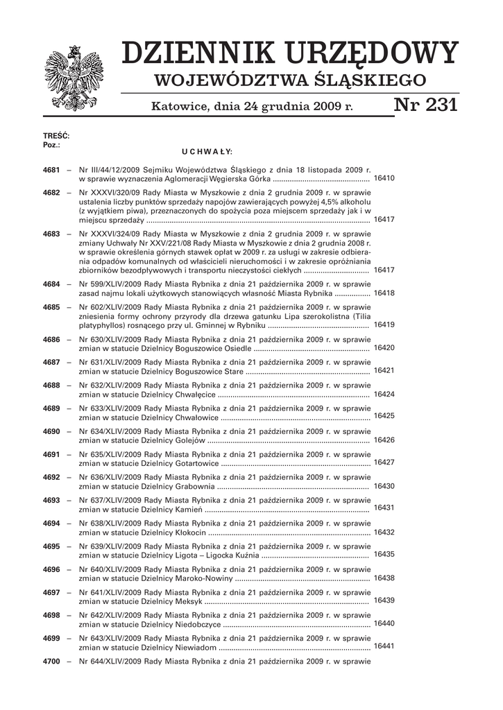 DZIENNIK URZĘDOWY Poz. 938 WOJEWÓDZTWA ŚLĄSKIEGO Katowice, dnia 24 grudnia 2009 r. TREŚĆ: Poz.: Nr 231 U C H W A Ł Y: 4681 – Nr III/44/12/2009 Sejmiku Województwa Śląskiego z dnia 18 listopada 2009 r. w sprawie wyznaczenia Aglomeracji Węgierska Górka .............................................. 16410 4682 – Nr XXXVI/320/09 Rady Miasta w Myszkowie z dnia 2 grudnia 2009 r. w sprawie ustalenia liczby punktów sprzedaży napojów zawierających powyżej 4,5% alkoholu (z wyjątkiem piwa), przeznaczonych do spożycia poza miejscem sprzedaży jak i w miejscu sprzedaży .......................................................................................................... 16417 4683 – Nr XXXVI/324/09 Rady Miasta w Myszkowie z dnia 2 grudnia 2009 r. w sprawie zmiany Uchwały Nr XXV/221/08 Rady Miasta w Myszkowie z dnia 2 grudnia 2008 r. w sprawie określenia górnych stawek opłat w 2009 r. za usługi w zakresie odbierania odpadów komunalnych od właścicieli nieruchomości i w zakresie opróżniania zbiorników bezodpływowych i transportu nieczystości ciekłych ............................... 16417 4684 – Nr 599/XLIV/2009 Rady Miasta Rybnika z dnia 21 października 2009 r. w sprawie zasad najmu lokali użytkowych stanowiących własność Miasta Rybnika ................. 16418 4685 – Nr 602/XLIV/2009 Rady Miasta Rybnika z dnia 21 października 2009 r. w sprawie zniesienia formy ochrony przyrody dla drzewa gatunku Lipa szerokolistna (Tilia platyphyllos) rosnącego przy ul. Gminnej w Rybniku ................................................ 16419 4686 – Nr 630/XLIV/2009 Rady Miasta Rybnika z dnia 21 października 2009 r. w sprawie zmian w statucie Dzielnicy Boguszowice Osiedle ....................................................... 16420 4687 – Nr 631/XLIV/2009 Rady Miasta Rybnika z dnia 21 października 2009 r. w sprawie zmian w statucie Dzielnicy Boguszowice Stare ........................................................... 16421 4688 – Nr 632/XLIV/2009 Rady Miasta Rybnika z dnia 21 października 2009 r. w sprawie zmian w statucie Dzielnicy Chwałęcice ........................................................................ 16424 4689 – Nr 633/XLIV/2009 Rady Miasta Rybnika z dnia 21 października 2009 r. w sprawie zmian w statucie Dzielnicy Chwałowice ....................................................................... 16425 4690 – Nr 634/XLIV/2009 Rady Miasta Rybnika z dnia 21 października 2009 r. w sprawie zmian w statucie Dzielnicy Golejów ............................................................................. 16426 4691 – Nr 635/XLIV/2009 Rady Miasta Rybnika z dnia 21 października 2009 r. w sprawie zmian w statucie Dzielnicy Gotartowice ....................................................................... 16427 4692 – Nr 636/XLIV/2009 Rady Miasta Rybnika z dnia 21 października 2009 r. w sprawie zmian w statucie Dzielnicy Grabownia ........................................................................ 16430 4693 – Nr 637/XLIV/2009 Rady Miasta Rybnika z dnia 21 października 2009 r. w sprawie zmian w statucie Dzielnicy Kamień .............................................................................. 16431 4694 – Nr 638/XLIV/2009 Rady Miasta Rybnika z dnia 21 października 2009 r. w sprawie zmian w statucie Dzielnicy Kłokocin ............................................................................. 16432 4695 – Nr 639/XLIV/2009 Rady Miasta Rybnika z dnia 21 października 2009 r. w sprawie zmian w statucie Dzielnicy Ligota – Ligocka Kuźnia ................................................... 16435 4696 – Nr 640/XLIV/2009 Rady Miasta Rybnika z dnia 21 października 2009 r. w sprawie zmian w statucie Dzielnicy Maroko-Nowiny ................................................................ 16438 4697 – Nr 641/XLIV/2009 Rady Miasta Rybnika z dnia 21 października 2009 r. w sprawie zmian w statucie Dzielnicy Meksyk .............................................................................. 16439 4698 – Nr 642/XLIV/2009 Rady Miasta Rybnika z dnia 21 października 2009 r. w sprawie zmian w statucie Dzielnicy Niedobczyce ...................................................................... 16440 4699 – Nr 643/XLIV/2009 Rady Miasta Rybnika z dnia 21 października 2009 r. w sprawie zmian w statucie Dzielnicy Niewiadom ........................................................................ 16441 4700 – Nr 644/XLIV/2009 Rady Miasta Rybnika z dnia 21 października 2009 r. w sprawie Dziennik Urzêdowy Województwa Œl¹skiego Nr 231 – 16410 – zmian w statucie Dzielnicy Ochojec .............................................................................. 16442 4701 – Nr 645/XLIV/2009 Rady Miasta Rybnika z dnia 21 października 2009 r. w sprawie zmian w statucie Dzielnicy Orzepowice ....................................................................... 16443 4702 – Nr 646/XLIV/2009 Rady Miasta Rybnika z dnia 21 października 2009 r. w sprawie zmian w statucie Dzielnicy Paruszowiec-Piaski ........................................................... 16444 4703 – Nr 647/XLIV/2009 Rady Miasta Rybnika z dnia 21 października 2009 r. w sprawie zmian w statucie Dzielnicy Popielów ............................................................................ 16446 4704 – Nr 648/XLIV/2009 Rady Miasta Rybnika z dnia 21 października 2009 r. w sprawie zmian w statucie Dzielnicy Radziejów .......................................................................... 16447 4705 – Nr 649/XLIV/2009 Rady Miasta Rybnika z dnia 21 października 2009 r. w sprawie zmian w statucie Dzielnicy Rybnicka Kuźnia ................................................................ 16448 4706 – Nr 650/XLIV/2009 Rady Miasta Rybnika z dnia 21 października 2009 r. w sprawie zmian w statucie Dzielnicy Rybnik-Północ ................................................................... 16449 4707 – Nr 651/XLIV/2009 Rady Miasta Rybnika z dni