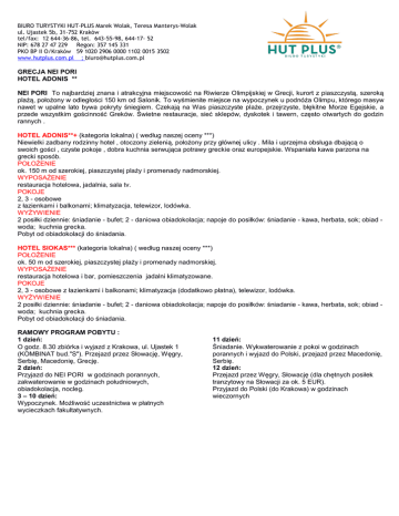 BIURO TURYSTYKI HUT-PLUS Marek Wolak, Teresa Manterys-Wolak ul. Ujastek 5b, 31-752 Kraków tel/fax: 12 644-36-86, tel. 643-55-98, 644-17- 52 NIP: 678 27 47 229 Regon: 357 145 331 PKO BP II O/Kraków 59 1020 2906 0000 1102 0015 3502 www.hutplus.com.pl ; [email protected] GRECJA NEI PORI HOTEL ADONIS ** NEI PORI To najbardziej znana i atrakcyjna miejscowość na Riwierze Olimpijskiej w Grecji, kurort z piaszczystą, szeroką plażą, położony w odległości 150 km od Salonik. To wyśmienite miejsce na wypoczynek u podnóża Olimpu, którego masyw nawet w upalne lato bywa pokryty śniegiem. Czekają na Was piaszczyste plaże, przejrzyste, błękitne Morze Egejskie, a przede wszystkim gościnność Greków. Świetne restauracje, sieć sklepów, dyskotek i tawern, często otwartych do godzin rannych . HOTEL ADONIS**+ (kategoria lokalna) ( według naszej oceny ***) Niewielki zadbany rodzinny hotel , otoczony zielenią, położony przy głównej ulicy . Mila i uprzejma obsługa dbającą o swoich gości , czyste pokoje , dobra kuchnia serwująca potrawy greckie oraz europejskie. Wspaniała kawa parzona na grecki sposób. POŁOŻENIE ok. 150 m od szerokiej, piaszczystej plaży i promenady nadmorskiej. WYPOSAŻENIE restauracja hotelowa, jadalnia, sala tv. POKOJE 2, 3 - osobowe z łazienkami i balkonami; klimatyzacja, telewizor, lodówka. WYŻYWIENIE 2 posiłki dziennie: śniadanie - bufet; 2 - daniowa obiadokolacja; napoje do posiłków: śniadanie - kawa, herbata, sok; obiad woda; kuchnia grecka. Pobyt od obiadokolacji do śniadania. HOTEL SIOKAS*** (kategoria lokalna) ( według naszej oceny ***) POŁOŻENIE ok. 50 m od szerokiej, piaszczystej plaży i promenady nadmorskiej. WYPOSAŻENIE restauracja hotelowa i bar, pomieszczenia jadalni klimatyzowane. POKOJE 2, 3 - osobowe z łazienkami i balkonami; klimatyzacja (dodatkowo płatna), telewizor, lodówka. WYŻYWIENIE 2 posiłki dziennie: śniadanie - bufet; 2 - daniowa obiadokolacja; napoje do posiłków: śniadanie - kawa, herbata, sok; obiad woda; kuchnia grecka. Pobyt od obiadokolacji do śniadania. RAMOWY PROGRAM POBYTU : 1 dzień: O godz. 8.30 zbiórka i wyjazd z Krakowa, ul. Ujastek 1 (KOMBINAT bud."S"). Przejazd przez Słowację, Węgry, Serbię, Macedonię, Grecję. 2 dzień: Przyjazd do NEI PORI w godzinach porannych, zakwaterowanie w godzinach południowych, obiadokolacja, nocleg. 3 – 10 dzień: Wypoczynek. Możliwość uczestnictwa w płatnych wycieczkach fakultatywnych. 11 dzień: Śniadanie. Wykwaterowanie z pokoi w godzinach porannych i wyjazd do Polski, przejazd przez Macedonię, Serbię. 12 dzień: Przejazd przez Węgry, Słowację (dla chętnych posiłek tranzytowy na Słowacji za ok. 5 EUR). Przyjazd do Polski (do Krakowa) w godzinach wieczornych BIURO TURYSTYKI HUT-PLUS Marek Wolak, Teresa Manterys-Wolak ul. Ujastek 5b, 31-752 Kraków tel/fax: 12 644-36-86, tel. 643-55-98, 644-17- 52 NIP: 678 27 47 229 Regon: 357 145 331 PKO BP II O/Kraków 59 1020 2906 0000 1102 0015 3502 www.hutplus.com.pl ; [email protected] TERMINY I CENA : TERMIN I CENA : 01.06-15.06.2017 15.06-30.06.2017 366 zł + 240 EUR razem ok .1.221 zł 366 zł + 240 EUR razem ok 1.221 zł / 9 noclegów , dojazd własny lub samolot / / 9 noclegów , dojazd własny lub samolot / 30.06 -11.07.2017 766 zł + 245 EUR razem ok 1.868 zł 12 dni / 9 noclegów , dojazd autokar z Krakowa 09.07 - 20.07.2017 766 zł + 245 EUR razem ok 1.868 zł 12 dni / 9 noclegów , dojazd autokar z Krakowa 18.07 – 29.07.2017 766 zł + 245 EUR razem ok 1.868 zł 12 dni / 9 noclegów , dojazd autokar z Krakowa 27.07- 07.08.2017 766 zł + 245 EUR razem ok 1.868 zł 12 dni / 9 noclegów , dojazd autokar z Krakowa 05.08-16.08.2017 766 zł + 245 EUR razem ok 1.868 zł 12 dni / 9 noclegów , dojazd autokar z Krakowa 14.08-25.08.2017 766 zł + 245 EUR razem ok 1.868 zł 12 dni / 9 noclegów , dojazd autokar z Krakowa 01.09-15.09.2017 15.09-30.09.2017 366 zł + 240 EUR razem ok .1.221 zł 366 zł + 240 EUR razem ok .1.221 zł / 9 noclegów , dojazd własny lub samolot / / 9 noclegów , dojazd własny lub samolot / Cena imprezy jest równowartością kwoty podanej w EUR przeliczonej wg kursu sprzedaży pieniądza banku PKO BP obowiązującego w dniu dokonania ostatecznej zapłaty + kwota w zł. Wpłata w PLN lub w EUR. Cena "razem około" jest podana orientacyjnie - przyjęto kurs 1 EUR = 4,50 PLN. CENA ZAWIERA : 9 noclegów , wyżywienie 2 x dziennie (śniadania w formie bufetu i obiadokolacje serwowane dania do wyboru), napoje do posiłków zgodnie z ofertą , transport autokarem w wybranych terminach ,opiekę pilota w czasie przejazdu , opiekę przedstawiciela organizatora , ubezpieczenie: KL+ NNW + bagaż , podatek VAT . CENA NIE ZAWIERA : opłaty za przejazd autokarem : 400 zł /osobę / Kraków-Nei Pori - Kraków/, ubezpieczenia od chorób przewlekłych , ubezpieczenia od kosztów rezygnacji z imprezy , dopłaty do połączeń antenowych . WYCIECZKI FAKULTATYWNE Ateny 40 EUR, Meteory 25 EUR, Delfy 35 EUR, Olimp 15 EUR, Skiatos 40 EUR; Wieczór Grecki 20 EUR; Saloniki 25 EUR , Św Góra Athos 40 EUR UWAGA : wycieczki można zakupić w BIURZE TURYSTYKI HUT PLUS UWAGA : WYJAZDY AUTOKARU: Kraków 8.30. zgodnie z rozkładem jazdy DOJAZD SAMOLOT : z Warszawy Modlin do Thesalonik bilet 700-1000 zł / w obie strony/ RYANAIR z Krakowa do Athen z przesiadką do Thesalonik bilet ok 900-1200 zł / w obie strony/ AEGAN AIR Transfer : Thesaloniki – Platamonas ok 50 EUR / auto osobowe 5 pasażerów / BIURO TURYSTYKI HUT-PLUS Marek Wolak, Teresa Manterys-Wolak ul. Ujastek 5b, 31-752 Kraków tel/fax: 12 644-36-86, tel. 643-55-98, 644-17- 52 NIP: 678 27 47 229 Regon: 357 145 331 PKO BP II O/Kraków 59 1020 2906 0000 1102 0015 3502 www.hutplus.com.pl Dojazd własnym autem : trasa ok 1450 km Koszt autostrad w jedną stronę : SŁOWACJA WINETA 12 EUR/ 10 DNI możliwość zalupu w POLSCE WĘGRY WINETA 15 EUR /10 DNI SERBIA opłaty na bramkach 20-25 EUR / za przejazd /auto MACEDONIA opłaty na bramkach 8-10 EUR 