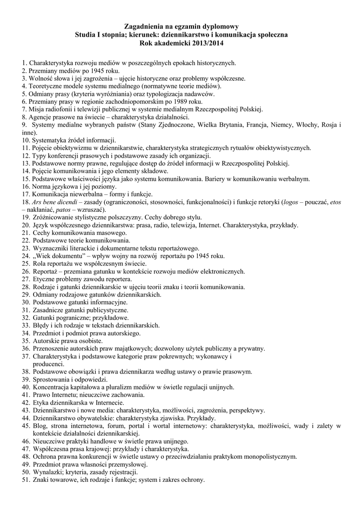 Zagadnienia na egzamin dyplomowy Studia I stopnia; kierunek: dziennikarstwo i komunikacja społeczna Rok akademicki 2013/2014 1. Charakterystyka rozwoju mediów w poszczególnych epokach historycznych. 2. Przemiany mediów po 1945 roku. 3. Wolność słowa i jej zagrożenia – ujęcie historyczne oraz problemy współczesne. 4. Teoretyczne modele systemu medialnego (normatywne teorie mediów). 5. Odmiany prasy (kryteria wyróżniania) oraz typologizacja nadawców. 6. Przemiany prasy w regionie zachodniopomorskim po 1989 roku. 7. Misja radiofonii i telewizji publicznej w systemie medialnym Rzeczpospolitej Polskiej. 8. Agencje prasowe na świecie – charakterystyka działalności. 9. Systemy medialne wybranych państw (Stany Zjednoczone, Wielka Brytania, Francja, Niemcy, Włochy, Rosja i inne). 10. Systematyka źródeł informacji. 11. Pojęcie obiektywizmu w dziennikarstwie, charakterystyka strategicznych rytuałów obiektywistycznych. 12. Typy konferencji prasowych i podstawowe zasady ich organizacji. 13. Podstawowe normy prawne, regulujące dostęp do źródeł informacji w Rzeczpospolitej Polskiej. 14. Pojęcie komunikowania i jego elementy składowe. 15. Podstawowe właściwości języka jako systemu komunikowania. Bariery w komunikowaniu werbalnym. 16. Norma językowa i jej poziomy. 17. Komunikacja niewerbalna – formy i funkcje. 18. Ars bene dicendi – zasady (ograniczoności, stosowności, funkcjonalności) i funkcje retoryki (logos – pouczać, etos – nakłaniać, patos – wzruszać). 19. Zróżnicowanie stylistyczne polszczyzny. Cechy dobrego stylu. 20. Język współczesnego dziennikarstwa: prasa, radio, telewizja, Internet. Charakterystyka, przykłady. 21. Cechy komunikowania masowego. 22. Podstawowe teorie komunikowania. 23. Wyznaczniki literackie i dokumentarne tekstu reportażowego. 24. „Wiek dokumentu” – wpływ wojny na rozwój reportażu po 1945 roku. 25. Rola reportażu we współczesnym świecie. 26. Reportaż – przemiana gatunku w kontekście rozwoju mediów elektronicznych. 27. Etyczne problemy zawodu reportera. 28. Rodzaje i gatunki dziennikarskie w ujęciu teorii znaku i teorii komunikowania. 29. Odmiany rodzajowe gatunków dziennikarskich. 30. Podstawowe gatunki informacyjne. 31. Zasadnicze gatunki publicystyczne. 32. Gatunki pograniczne; przykładowe. 33. Błędy i ich rodzaje w tekstach dziennikarskich. 34. Przedmiot i podmiot prawa autorskiego. 35. Autorskie prawa osobiste. 36. Przenoszenie autorskich praw majątkowych; dozwolony użytek publiczny a prywatny. 37. Charakterystyka i podstawowe kategorie praw pokrewnych; wykonawcy i producenci. 38. Podstawowe obowiązki i prawa dziennikarza według ustawy o prawie prasowym. 39. Sprostowania i odpowiedzi. 40. Koncentracja kapitałowa a pluralizm mediów w świetle regulacji unijnych. 41. Prawo Internetu; nieuczciwe zachowania. 42. Etyka dziennikarska w Internecie. 43. Dziennikarstwo i nowe media: charakterystyka, możliwości, zagrożenia, perspektywy. 44. Dziennikarstwo obywatelskie: charakterystyka zjawiska. Przykłady. 45. Blog, strona internetowa, forum, portal i wortal internetowy: charakterystyka, możliwości, wady i zalety w kontekście działalności dziennikarskiej. 46. Nieuczciwe praktyki handlowe w świetle prawa unijnego. 47. Współczesna prasa krajowej: przykłady i charakterystyka. 48. Ochrona prawna konkurencji w świetle ustawy o przeciwdziałaniu praktykom monopolistycznym. 49. Przedmiot prawa własności przemysłowej. 50. Wynalazki; kryteria, zasady rejestracji. 51. Znaki towarowe, ich rodzaje i funkcje; system i zakres ochrony.