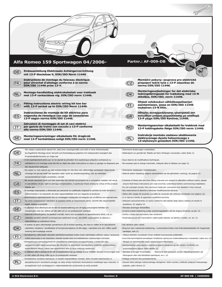Alfa Romeo 159 Sportwagon 04/2006- Partnr.: AF-009-DB DE Einbauanleitung Elektrosatz Anhängervorrichtung mit 13-P Steckdose lt. DIN/ISO Norm 11446 FR Instructions de montage du faisceau électrique pour chrochet d'attelage conforme à la norme DIN/ISO 11446 prise 13-V. CZ Montážní pokyny: souprava pro elektrické propojení tažné tyče s 13-P zásuvkou do normy DIN/ISO 11446. NL Montage-handleiding elektrokabelset voor trekhaak met 13-P contactdoos vlg. DIN/ISO norm 11446. DK Monteringsvejledninger for det elektriske ledningsføringssæt for trækstang med 13-N stikdåse, DIN/ISO, norm 11446. GB Fitting instructions electric wiring kit tow bar with 13-P socket up to DIN/ISO Norm 11446. FI ES Instrucciones de montaje de kit eléctrico para enganche de remolque con caja de conexiones 13-P según norma DIN/ISO 11446. GR Οδηγίες συναρμολόγησης ηλεκτρικού σετ καλωδίων μπάρας ρυμούλκησης με υποδοχή 13-Ρ μέχρι DIN/ISO Κανόνας 11446. IT Istruzioni di montaggio di set di cavi elettrici per gancio da traino con zoccolo a 13-P conforme alla norma DIN/ISO 11446. NO Monteringsanviser elkabelsett for trekkrok med 13-P koblingsboks ifølge DIN/ISO norm 11446. SE Monteringsanvisningar elkabelsats för dragkrok med 13-P kontaktdosa enligt DIN/ISO norm 11446. PL Instrukcje montażu zestawu okablowania elektrycznego dyszla holowniczego z 13-stykowym gniazdem DIN/ISO 11446. DE - Wir weisen ausdrücklich darauf hin, dass eine unsachgemäße und nicht in einer Fachwerkstatt durchgeführte Montage einen Verzicht auf Entschädigung jeglicher Art insbesondere bezüglich des Ohjeet vetokoukun sähkökaapelisarjan asentamiseen, jossa on DIN/ISO 11446 mukainen 13-N liitin. - Technische Änderungen vorbehalten. - Widerstand nur gemäß der Tabelle auf dem Anhänger verwenden, siehe Seite 12. Produkthaftpflichtrechts zur Folge hat - Il est expréssement prévu qu' on ne saurait se prévaloir d'un quelconque préjudice contractuel ou FR rédhibitoire si le montage avait été fait en dépit des dites instructions ou dans un garage ne disposant pas - Sous réserve de modifications techniques. - Ne excessez pas la charge maximale, indiquée dans le tableau sur page 12. des équipments adéquats. - Wij wijzen er met nadruk op, dat ondeskundige en niet door een vakkundige werkplaats uitgevoerde NL montage tot gevolg heeft dat daardoor ieder recht op schadevergoeding, ook op wettelijke - Technische wijzigingen voorbehouden. - Gebruik alleen belasting volgens aansluittabel op het getrokken voertuig, zie pagina 12. aansprakelijkheid inzake produkten, vervalt. - We would expressly point out that assembly not carried out properly by a competent installer will result GB in cancellation of any right to damage compensation, in particular those arising by virtue of the product liability act. ES - El montaje inapropiado y efectuado por personal no cualificado originará la pérdida de todo derecho a indemnización o la expiración de toda responsabilidad civil con respecto al producto. ha come conseguenza il decadere di qualsiasi diritto al risarcimento danni, nonché alla responsabilità - Ci si riserva il diritto di apportare modifiche tecniche. - Utilizzare esclusivamente un carico conforme alla tabella degli allacci relativa al veicolo in questione, cfr. pagina 12. - Vi påpekar med eftertryck att all rätt till skadeersättning och all laglig ansvarighet förfaller om monteringen inte har utförts på rätt sätt och av en professionell verkstad. - Tekniska ändringar förbehålles. - Använd endast belastning enligt anslutningstabellen på det dragna fordonet, se sid. 12. - Výslovně zdůrazňujeme, že jakákoli montáž, která není provedená ve specializované dílně, má za - CZ - Nos reservamos el derecho a efectuar modificaciones técnicas. - Utilice sólo cargas de acuerdo a la tabla de conexión del vehículo remolcado (ver página 12). legale relativa ai prodotti. SE ensure that these instructions are read and fully understood before commencing installation. - Do not overload circuits; the maximum loads per connection are detailed in this manual. - Sottolineiamo espressamente che un montaggio inadeguato ed eseguito da un'officina non specializzata IT - Contents of these kits and their fitting manuals are subject to alteration without notice, please následek odvolání nároků na kompenzaci jakéhokoli druhu, obzvláště vyplývajících ze zákona o - Změny mohou být provedeny bez oznámení. - Používejte pouze při maximálním nabití podle tabulky na tažném vozidle, viz. str. 12. odpovědnosti za způsobené škody. - Vi ønsker at gøre udtrykkeligt opmærksom på at forkert samling, der ikke er udført af et specialiseret DK værksted, resulterer i bortfaldelse af kompenseringskrav af alle slags, i særdeles krav der måtte opstå omkring det lovpligtige ansvar. FI mikäli asennusta ei ole toteutettu oikealla tavalla eikä ammattitaitoisen asiantuntijan toimesta. πραγματοποιηθεί ειδικό εργαστήριο θα οδηγήσει σε αποποίηση των αξιώσεων επιβολής αποζημιώσεων οποιουδήποτε είδους, ειδικά όσα προκύπτουν από το νόμο ευθύνης προϊόντων. NO - Oikeus teknisiin muutoksiin ilman erillistä huomautusta pidätetään. - Kuormita työvirtapiiriä ainoastaan hinattavan ajoneuvon kytkentäkaavion mukaisesti, katso sivu 12. - Μπορεί να τροποποιηθεί χωρίς προηγούμενη ειδοποίηση. - Χρησιμοποιείτε μόνο μέγιστο ηλεκτρικό φορτίο σύμφωνα με τον πίνακα σύνδεσης στο ρυμουλκούμενο όχημα, δείτε σελίδα 12. - Vi påpeker ettertrykkelig at all rett til skadeerstatning og rettslig ansvar forfaller dersom monteringen ikke - Tekniske endringer forbeholdes. - Oversk