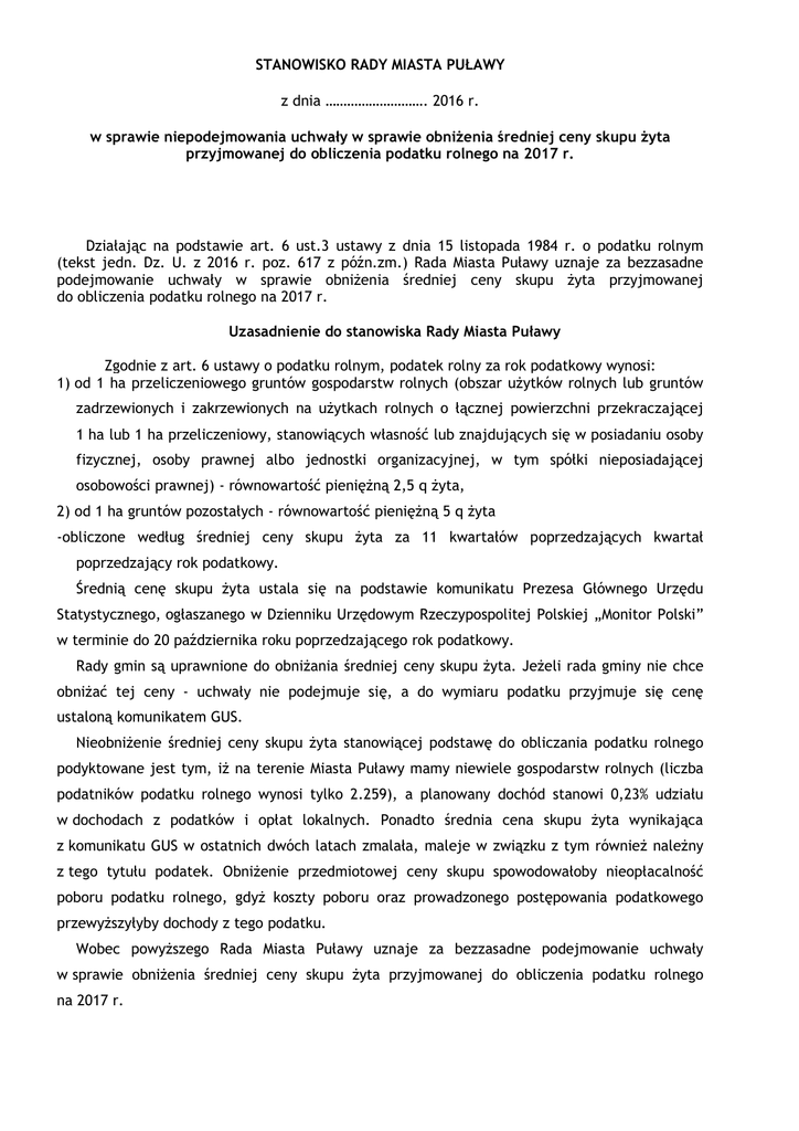 STANOWISKO RADY MIASTA PUŁAWY z dnia ………………………. 2016 r. w sprawie niepodejmowania uchwały w sprawie obniżenia średniej ceny skupu żyta przyjmowanej do obliczenia podatku rolnego na 2017 r. Działając na podstawie art. 6 ust.3 ustawy z dnia 15 listopada 1984 r. o podatku rolnym (tekst jedn. Dz. U. z 2016 r. poz. 617 z późn.zm.) Rada Miasta Puławy uznaje za bezzasadne podejmowanie uchwały w sprawie obniżenia średniej ceny skupu żyta przyjmowanej do obliczenia podatku rolnego na 2017 r. Uzasadnienie do stanowiska Rady Miasta Puławy Zgodnie z art. 6 ustawy o podatku rolnym, podatek rolny za rok podatkowy wynosi: 1) od 1 ha przeliczeniowego gruntów gospodarstw rolnych (obszar użytków rolnych lub gruntów zadrzewionych i zakrzewionych na użytkach rolnych o łącznej powierzchni przekraczającej 1 ha lub 1 ha przeliczeniowy, stanowiących własność lub znajdujących się w posiadaniu osoby fizycznej, osoby prawnej albo jednostki organizacyjnej, w tym spółki nieposiadającej osobowości prawnej) - równowartość pieniężną 2,5 q żyta, 2) od 1 ha gruntów pozostałych - równowartość pieniężną 5 q żyta -obliczone według średniej ceny skupu żyta za 11 kwartałów poprzedzających kwartał poprzedzający rok podatkowy. Średnią cenę skupu żyta ustala się na podstawie komunikatu Prezesa Głównego Urzędu Statystycznego, ogłaszanego w Dzienniku Urzędowym Rzeczypospolitej Polskiej „Monitor Polski” w terminie do 20 października roku poprzedzającego rok podatkowy. Rady gmin są uprawnione do obniżania średniej ceny skupu żyta. Jeżeli rada gminy nie chce obniżać tej ceny - uchwały nie podejmuje się, a do wymiaru podatku przyjmuje się cenę ustaloną komunikatem GUS. Nieobniżenie średniej ceny skupu żyta stanowiącej podstawę do obliczania podatku rolnego podyktowane jest tym, iż na terenie Miasta Puławy mamy niewiele gospodarstw rolnych (liczba podatników podatku rolnego wynosi tylko 2.259), a planowany dochód stanowi 0,23% udziału w dochodach z podatków i opłat lokalnych. Ponadto średnia cena skupu żyta wynikająca z komunikatu GUS w ostatnich dwóch latach zmalała, maleje w związku z tym również należny z tego tytułu podatek. Obniżenie przedmiotowej ceny skupu spowodowałoby nieopłacalność poboru podatku rolnego, gdyż koszty poboru oraz prowadzonego postępowania podatkowego przewyższyłyby dochody z tego podatku. Wobec powyższego Rada Miasta Puławy uznaje za bezzasadne podejmowanie uchwały w sprawie obniżenia średniej ceny skupu żyta przyjmowanej do obliczenia podatku rolnego na 2017 r. UZASADNIENIE do stanowiska rady w sprawie niepodejmowania uchwały w sprawie obniżenia średniej ceny skupu żyta przyjmowanej do obliczenia podatku rolnego na 2017 r. Zgodnie z art. 6 ustawy o podatku rolnym, podatek rolny za rok podatkowy wynosi: 1) od 1 ha przeliczeniowego gruntów gospodarstw rolnych (obszar użytków rolnych lub gruntów zadrzewionych i zakrzewionych na użytkach rolnych o łącznej powierzchni przekraczającej 1 ha lub 1 ha przeliczeniowy, stanowiących własność lub znajdujących się w posiadaniu osoby fizycznej, osoby prawnej albo jednostki organizacyjnej, w tym spółki nieposiadającej osobowości prawnej) - równowartość pieniężną 2,5 q żyta, 2) od 1 ha gruntów pozostałych - równowartość pieniężną 5 q żyta -obliczone według średniej ceny skupu żyta za 11 kwartałów poprzedzających kwartał poprzedzający rok podatkowy. Średnią cenę skupu żyta ustala się na podstawie komunikatu Prezesa Głównego Urzędu Statystycznego, ogłaszanego w Dzienniku Urzędowym Rzeczypospolitej Polskiej „Monitor Polski” w terminie do 20 października roku poprzedzającego rok podatkowy. Średnia cena skupu żyta wynikająca z komunikatu GUS w ostatnich dwóch latach zmalała, maleje w związku z tym również należny z tego tytułu podatek. Wskazane jest, aby propozycja nieobniżania tej ceny poddana została pod obrady rady gminy, dlatego też Prezydent przedkłada propozycję nieobniżania ceny skupu żyta. Jeżeli rada podzieli stanowisko Pana Prezydenta, wówczas zapisuje się je w protokole z sesji rady, ale uchwały o nieobniżaniu ceny żyta nie podejmuje się. Nieobniżenie średniej ceny skupu żyta stanowiącej podstawę do obliczania podatku rolnego podyktowane jest tym, iż na terenie Miasta Puławy mamy niewiele gospodarstw rolnych (liczba podatników podatku rolnego wynosi tylko 2.259), a planowany dochód z tytułu podatku rolnego stanowi 0,23% udziału w dochodach z podatków i opłat lokalnych.