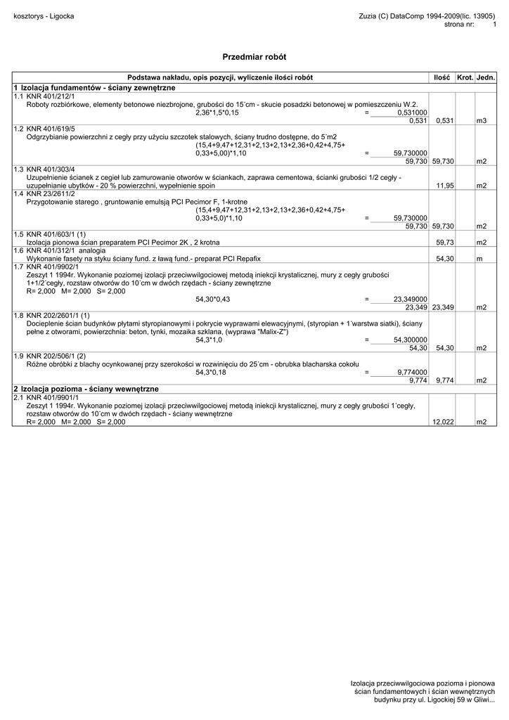 kosztorys - Ligocka Zuzia (C) DataComp 1994-2009(lic. 13905) strona nr: 1 Przedmiar robót Podstawa nakładu, opis pozycji, wyliczenie ilości robót Ilość Krot. Jedn. 1 Izolacja fundamentów - ściany zewnętrzne 1.1 KNR 401/212/1 Roboty rozbiórkowe, elementy betonowe niezbrojone, grubości do 15˙cm - skucie posadzki betonowej w pomieszczeniu W.2. 2,36*1,5*0,15 = 0,531000 0,531 0,531 1.2 KNR 401/619/5 Odgrzybianie powierzchni z cegły przy użyciu szczotek stalowych, ściany trudno dostępne, do 5˙m2 (15,4+9,47+12,31+2,13+2,13+2,36+0,42+4,75+ 0,33+5,00)*1,10 = 59,730000 59,730 59,730 1.3 KNR 401/303/4 Uzupełnienie ścianek z cegieł lub zamurowanie otworów w ściankach, zaprawa cementowa, ścianki grubości 1/2 cegły uzupełnianie ubytków - 20 % powierzchni, wypełnienie spoin 11,95 1.4 KNR 23/2611/2 Przygotowanie starego , gruntowanie emulsją PCI Pecimor F, 1-krotne (15,4+9,47+12,31+2,13+2,13+2,36+0,42+4,75+ 0,33+5,0)*1,10 = 59,730000 59,730 59,730 1.5 KNR 401/603/1 (1) Izolacja pionowa ścian preparatem PCI Pecimor 2K , 2 krotna 59,73 1.6 KNR 401/312/1 analogia Wykonanie fasety na styku ściany fund. z ławą fund.- preparat PCI Repafix 54,30 1.7 KNR 401/9902/1 Zeszyt 1 1994r. Wykonanie poziomej izolacji przeciwwilgociowej metodą iniekcji krystalicznej, mury z cegły grubości 1+1/2˙cegły, rozstaw otworów do 10˙cm w dwóch rzędach - ściany zewnętrzne R= 2,000 M= 2,000 S= 2,000 54,30*0,43 = 23,349000 23,349 23,349 1.8 KNR 202/2601/1 (1) Docieplenie ścian budynków płytami styropianowymi i pokrycie wyprawami elewacyjnymi, (styropian + 1˙warstwa siatki), ściany pełne z otworami, powierzchnia: beton, tynki, mozaika szklana, (wyprawa "Malix-Z") 54,3*1,0 = 54,300000 54,30 54,30 1.9 KNR 202/506/1 (2) Różne obróbki z blachy ocynkowanej przy szerokości w rozwinięciu do 25˙cm - obrubka blacharska cokołu 54,3*0,18 = 9,774000 9,774 9,774 m3 m2 m2 m2 m2 m m2 m2 m2 2 Izolacja pozioma - ściany wewnętrzne 2.1 KNR 401/9901/1 Zeszyt 1 1994r. Wykonanie poziomej izolacji przeciwwilgociowej metodą iniekcji krystalicznej, mury z cegły grubości 1˙cegły, rozstaw otworów do 10˙cm w dwóch rzędach - ściany wewnętrzne R= 2,000 M= 2,000 S= 2,000 12,022 m2 Izolacja przeciwwilgociowa pozioma i pionowa ścian fundamentowych i ścian wewnętrznych budynku przy ul. Ligockiej 59 w Gliwi...