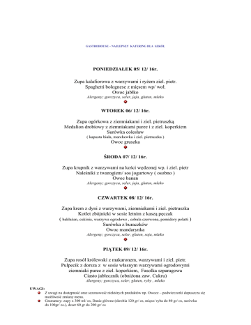 GASTROHOUSE – NAJLEPSZY KATERING DLA SZKÓŁ PONIEDZIAŁEK 05/ 12/ 16r. Zupa kalafiorowa z warzywami i ryżem ziel. pietr. Spaghetti bolognese z mięsem wp/ woł. Owoc jabłko Alergeny; gorczyca, seler, jaja, gluten, mleko WTOREK 06/ 12/ 16r. Zupa ogórkowa z ziemniakami i ziel. pietruszką Medalion drobiowy z ziemniakami puree i z ziel. koperkiem Surówka colesław ( kapusta biała, marchewka i ziel. pietruszka ) Owoc gruszka ŚRODA 07/ 12/ 16r. Zupa krupnik z warzywami na kości wędzonej wp. i ziel. pietr Naleśniki z twarogiem/ sos jogurtowy ( osobno ) Owoc banan Alergeny; gorczyca, seler, jaja, gluten, mleko CZWARTEK 08/ 12/ 16r. Zupa krem z dyni z warzywami, ziemniakami i ziel. pietruszka Kotlet zbójnicki w sosie letnim z kaszą pęczak ( bakłażan, cukinia, warzywa ogrodowe , cebula czerwona, pomidory pelatti ) Surówka z buraczków Owoc mandarynka Alergeny; gorczyca, seler, gluten, soja, mleko PIĄTEK 09/ 12/ 16r. Zupa rosół królewski z makaronem, warzywami i ziel. pietr. Pulpecik z dorsza z w sosie własnym warzywami ogrodowymi ziemniaki puree z ziel. koperkiem, Fasolka szparagowa Ciasto jabłecznik (obniżona zaw. Cukru) Alergeny; gorczyca, seler, gluten, ryby , mleko UWAGI: Z uwagi na dostępność oraz sezonowość niektórych produktów np. Owoce – podwieczorki dopuszcza się możliwość zmiany menu. Gramatury: zupy x 300 ml/ os, Danie główne (skrobia 120 gr/ os, mięso/ ryba do 80 gr/ os, surówka do 100gr/ os.), deser 60 gr do 200 gr/ os GASTROHOUSE – NAJLEPSZY KATERING DLA SZKÓŁ PONIEDZIAŁEK 12/ 12/ 16r. Zupa pomidorowa z zacierką, warzywami i ziel. pietr. Pierożki tortellini z mięsem, brokułami w sosie śmietanowym Owoc jabłko Alergeny; gorczyca, seler, jaja, gluten, mleko WTOREK 13/ 12/ 16r. Zupa barszcz zabielany z warzywami, ziemniakami i ziel. pietruszką. Eskalopki drobiowe z marchewką i groszkiem, ziemniaki puree Surówka z białej kapusty, ogórka św. kukurydzy i ziel. pietruszki Owoc gruszka Alergeny; gorczyca, seler, jaja, gluten, mleko ŚRODA 14/ 12/ 16r. Zupa wiejska z warzywami , ziemniakami mięso miel. wp. groszek i ziel. pietr Kopytka w sosie pieczeniowym, pałka z kurczaka, surówka z tartego kalafiora i marchewki Owoc banan Alergeny; gorczyca, seler, jaja, gluten, mleko CZWARTEK 15/ 12/ 16r. Zupa marchwianka z warzywami, ziemniakami i ziel. pietruszką Pieczona szynka wp. w sosie własnym z kaszą jaglaną, surówka z buraczków Owoc melon Alergeny; gorczyca, seler, gluten, soja, jaja PIĄTEK 16/ 12/ 16r. Zupa szczawiowa z ziemniakami, warzywami got. jajkiem i ziel. pietruszką Medalion z dorsza smażony, ziemniaki puree z koperkiem, Marchewka got. z groszkiem Ciasteczka owsiane Sante z suszonymi owocami i wiśnią ( bez dodatku cukru. ) Alergeny; gorczyca, seler, gluten, ryby, mleko, jaja UWAGI: Z uwagi na dostępność oraz sezonowość niektórych produktów np. Owoce – podwieczorki dopuszcza się możliwość zmiany menu. Gramatury: zupy x 300 ml/ os, Danie główne (skrobia 120 gr/ os, mięso/ ryba do 80 gr/ os, surówka do 100gr/ os.), deser 60 gr do 200 gr/ os GASTROHOUSE – NAJLEPSZY KATERING DLA SZKÓŁ PONIEDZIAŁEK 19/ 12/ 16r. Zupa zacierka babuni na grysiku z warzywami i ziel. pietr. Potrawka z kurczakiem, mięso duszone z warzywami i brązowym ryżem ( kukurydza, groszek, fasolka szparagowa, marchewka ) Owoc jabłko Alergeny; gorczyca, seler, jaja, gluten, mleko WTOREK 20/ 12/ 16r. Delikatny żurek po staropolsku z warzywami, ziemniakami i ziel. Kotlecik pożarski w sosie koperkowym z ziemniakami puree, kasza jaglana, Surówka colesław ( kapusta biała, marchewka i ziel. pietruszka ) Owoc gruszka Alergeny; gorczyca, seler, jaja, gluten, mleko, soja ŚRODA 21/ 12/ 16r. Zupa gulaszowa z warzywami, ziemniakami, mięso mielone drob. groszek i ziel. pietruszka Pierogi z jagodami i twarogiem/ sos jogurtowy ( osobno ) Owoc banan Alergeny; gorczyca, seler, jaja, gluten, mleko CZWARTEK 22/ 12/ 16r. Zupa krem z zielonego groszku z warzywami, makaronem ryżowym i ziel. pietruszką Pieczeń rzymska w sosie własnym z ziemniakami puree Surówka z buraczków Owoc mandarynka Alergeny; gorczyca, gluten, seler, jaja, mleko PIĄTEK 23/ 12/ 16r. Zupa barszcz z uszkami Dorsz po grecku z warzywami ziemniaki puree z ziel. koperkiem Surówka z selera z rodzynkami Ciastko piernik świąteczny ( obniżona zaw. Cukru ) Alergeny; ryby, guma guar, seler, jaja, gluten, mleko UWAGI: Z uwagi na dostępność oraz sezonowość niektórych produktów np. Owoce – podwieczorki dopuszcza się możliwość zmiany menu. Gramatury: zupy x 300 ml/ os, Danie główne (skrobia 120 gr/ os, mięso/ ryba do 80 gr/ os, surówka do 100gr/ os.), deser 60 gr do 200 gr/ os GASTROHOUSE – NAJLEPSZY KATERING DLA SZKÓŁ PONIEDZIAŁEK 26/ 12/ 16r. SWIĘTA BOŻEGO NARODZENIA WTOREK 27/ 12/ 16r. Zupa koperkowa z ryżem, warzywami i ziel. pietr. Pierogi z mięsem, surówka z białej kapusty, kukurydzy i ogórka św. Owoc jabłko Alergeny; gorczyca, seler, gluten, jaja, mleko ŚRODA 28/ 12/ 16r. Zupa rosół królewski z makaronem, warzywami i ziel. pietr. Gołąbek w sosie pomidorowym, ziemniaki puree Owoc gruszka Alergeny; gorczyca, seler, gluten, jaja, mleko CZWARTEK 29/ 12/ 16r. Zupa marchwianka z warzywami, ziemniakami i ziel. pietruszką Pulpecik w sosie koperkowym z ziemniakami puree, Surówka z buraczków Owoc melon Alergeny;, gluten, mleko, seler, jaja PIĄTEK 30/ 12/ 16r. Zupa jarzynowa z fasolką, brokułami, brukselką, kalafiorem, zacierką i zieleniną Paluszki rybne z fileta z mintaja, ziemniaki puree z ziel. koperkiem, Fasolka szparagowa Ciastko marchewkowe ( obniżona zaw. Cukru ) Alergeny; ryby, guma guar, seler, jaja, gluten, mleko UWAGI: Z uwagi na dostępność oraz sezonowość niektórych produktów np. Owoce – podwieczorki dopuszcza się możliwość zmiany menu. Gramatury: zupy x 300 ml/ os, Danie główne (skrobia 120 gr/ os, mięso/ ryba do 80 gr/ os, surówka do 100gr/ os.), deser 60 gr do 200 gr/ os