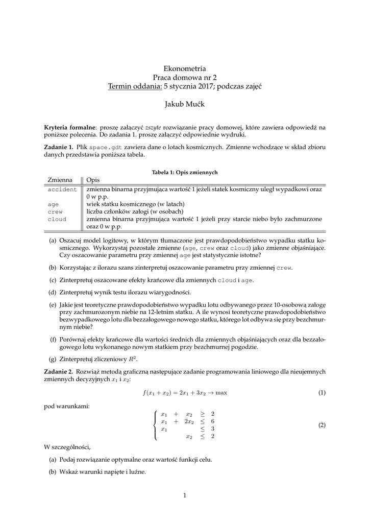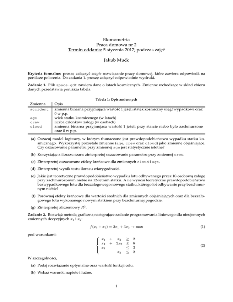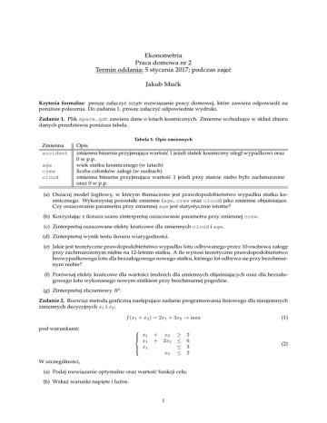 Ekonometria Praca domowa nr 2 Termin oddania: 5 stycznia 2017; podczas zaj˛eć Jakub Mućk Kryteria formalne: prosz˛e załaczyć ˛ zszyte rozwiazanie ˛ pracy domowej, które zawiera odpowiedź na poniższe polecenia. Do zadania 1. prosz˛e załaczyć ˛ odpowiednie wydruki. Zadanie 1. Plik space.gdt zawiera dane o lotach kosmicznych. Zmienne wchodzace ˛ w skład zbioru danych przedstawia poniższa tabela. Tabela 1: Opis zmiennych Zmienna accident age crew cloud Opis zmienna binarna przyjmujaca ˛ wartość 1 jeżeli statek kosmiczny uległ wypadkowi oraz 0 w p.p. wiek statku kosmicznego (w latach) liczba członków załogi (w osobach) zmienna binarna przyjmujaca ˛ wartość 1 jeżeli przy starcie niebo było zachmurzone oraz 0 w p.p. (a) Oszacuj model logitowy, w którym tłumaczone jest prawdopodobieństwo wypadku statku kosmicznego. Wykorzystaj pozostałe zmienne (age, crew oraz cloud) jako zmienne objaśniajace. ˛ Czy oszacowanie parametru przy zmiennej age jest statystycznie istotne? (b) Korzystajac ˛ z ilorazu szans zinterpretuj oszacowanie parametru przy zmiennej crew. (c) Zinterpretuj oszacowane efekty krańcowe dla zmiennych cloud i age. (d) Zinterpretuj wynik testu ilorazu wiarygodności. (e) Jakie jest teoretyczne prawdopodobieństwo wypadku lotu odbywanego przez 10-osobowa˛ załog˛e przy zachmurozonym niebie na 12-letnim statku. A ile wynosi teoretyczne prawdopodobieństwo bezwypadkowego lotu dla bezzałogowego nowego statku, którego lot odbywa si˛e przy bezchmurnym niebie? (f) Porównaj efekty krańcowe dla wartości średnich dla zmiennych objaśniajacych ˛ oraz dla bezzałogowego lotu wykonanego nowym statkiem przy bezchmurnej pogodzie. (g) Zinterpretuj zliczeniowy R2 . Zadanie 2. Rozwia˛ż metoda˛ graficzna˛ nast˛epujace ˛ zadanie programowania liniowego dla nieujemnych zmiennych decyzyjnych x1 i x2 : f (x1 + x2 ) = 2x1 + 3x2 → max (1) pod warunkami: x1 x1 x1 + + x2 2x2 x2 ≥ ≤ ≤ ≤ 2 6 3 2 W szczególności, (a) Podaj rozwiazanie ˛ optymalne oraz wartość funkcji celu. (b) Wskaż warunki napi˛ete i luźne. 1 (2) (c) Przeprowadź analiz˛e postoptymalizacyjna:˛ (i) Określ zakres zmienności współczynników funkcji celu, dla których rozwiazanie ˛ optymalne pozostanie bez zmian. (ii) Określ zakres zmienności wyrazów wolnych, dla których struktura bazowa rozwiazania ˛ optymalnego pozostanie ta sama. Zadanie 3. Przedsi˛ebiorstwo Druidzi nie lubia˛ warzyw zajmuj˛e si˛e produkcja˛ soków wieloowocowych. Produkuje trzy soki: Owocowy Czar, Owocowa˛ Radość oraz Owocowa˛ Magi˛e. Produkty te sa˛ mieszanka˛ soków z cytryn, jabłek, pomarańczy oraz granata. Dost˛epność i cena tych składników zostały zawarte w tabeli 2. Z kolei, cena sprzedaży oraz ilość soku wynikajaca ˛ z kontraktów widnieja˛ w tabeli 3. Tabela 2: Cena sprzedaży i wymagana ilość produktu Wymagana ilość (w litrach) Cena sprzedaży (w PLN) Owocowy Czar 200 11 Owocowa Radość 150 10 Owocowa Magia 100 19 Tabela 3: Cena zakupu i dost˛epna ilość składników Dost˛epna ilość (w litrach) Cena zakupu (w PLN) Cytrynowy 100 4 Pomarańczowy 150 2 Jabłkowy 200 1 Granatowy 40 10 Druidzi nie lubia˛ warzyw chca˛ uzyskać jak najwi˛ekszy zysk. (a) Określ zmienne decyzyjne tego problemu. (b) Zapisz zadanie programowania liniowego opisujace ˛ powyższy problem decyzyjny, tj. funkcj˛e celu, kryterium optymalizacji i warunki ograniczajace. ˛ (c) Rozwia˛ż zadanie problem optymalizacyjny przy pomocy dodatku Solver. Podaj rozwiazanie ˛ optymalne oraz wartość funkcji celu. Jaka˛ ilość poszczególnych soków wyprodukuje przedsi˛ebiorstwo? A jaka ilość poszczególnych soków zostanie wykorzystana do produkcji? (d) Wprowadzono dodatkowo restrykcje na skład produktów, które zostały podsumowane w tabeli 4. Zapisz warunki ograniczajace, ˛ które uwzgl˛edniaja˛ informacje zawarte w tabeli 4. Tabela 4: Restrykcje zwiazane ˛ ze składem produktów cytryny granaty pomarańcze jabłka minimalny udział maksymalny udział minimalny udział maksymalny udział minimalny udział maksymalny udział minimalny udział maksymalny udział Owocowy Czar 0.05 0.40 0.05 0.50 0.20 0.80 0.10 0.60 Owocowa Radość 0.10 0.30 0.02 0.40 0.12 0.65 0.15 0.75 Owocowa Magia 0.15 0.60 0.04 0.50 0.30 0.70 0.30 0.80 (e) Czy po wprowadzeniu warunków ograniczajacych ˛ z ppkt (d) rozwiazanie ˛ optymalne si˛e zmieni? Jak b˛edzie wówczas wartość funkcji celu? Jaka b˛edzie produkcja soków? 2