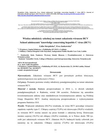 Sierpińska Lidia, Jankowska Ewa. School adolescents’ knowledge concerning hepatitis C virus (HCV). Journal of Education, Health and Sport. 2017;7(1):11-27. eISSN 2391-8306. DOI http://dx.doi.org/10.5281/zenodo.229140 http://ojs.ukw.edu.pl/index.php/johs/article/view/4133 The journal has had 7 points in Ministry of Science and Higher Education parametric evaluation. Part B item 754 (09.12.2016). 754 Journal of Education, Health and Sport eISSN 2391-8306 7 © The Author (s) 2016; This article is published with open access at Licensee Open Journal Systems of Kazimierz Wielki University in Bydgoszcz, Poland Open Access. This article is distributed under the terms of the Creative Commons Attribution Noncommercial License which permits any noncommercial use, distribution, and reproduction in any medium, provided the original author(s) and source are credited. This is an open access article licensed under the terms of the Creative Commons Attribution Non Commercial License (http://creativecommons.org/licenses/by-nc/4.0/) which permits unrestricted, non commercial use, distribution and reproduction in any medium, provided the work is properly cited. This is an open access article licensed under the terms of the Creative Commons Attribution Non Commercial License (http://creativecommons.org/licenses/by-nc/4.0/) which permits unrestricted, non commercial use, distribution and reproduction in any medium, provided the work is properly cited. The authors declare that there is no conflict of interests regarding the publication of this paper. Received: 05.12.2016. Revised 20.12.2016. Accepted: 31.12.2016. Wiedza młodzieży szkolnej na temat zakażenia wirusem HCV School adolescents’ knowledge concerning hepatitis C virus (HCV) Lidia Sierpińska1, Ewa Jankowska2 1 1 Wojskowy Szpital Kliniczny z Polikliniką SP ZOZ w Lublinie 1 Military Clinical Hospital with Polyclinic, Independent Public Health Care Unit, Lublin 2 Studenckie Koło Naukowe Wyższej Szkoły Biznesu i Przedsiębiorczości w Ostrowcu Świętokrzyskim Students’ Scientific Circle, College of Business and Entrepreneurship, Ostrowiec Świętokrzyski Adres do korespondencji: dr n. med. Lidia Sierpińska 1 Wojskowy Szpital Kliniczny z Polikliniką SP ZOZ, Al. Racławickie 23, 20-904 Lublin, Poland tel. 261183297; fax. 261183277 e-mail: [email protected] Streszczenie Wprowadzenie. Zakażenie wirusem HCV jest poważnym problem klinicznym, epidemiologicznym oraz społecznym w Polsce. Cel pracy. Poznanie poziomu wiedzy młodzieży ponadgimnazjalnej na temat zakażenia wirusem HCV. Materiał i metoda. Badanie przeprowadzano w 2016 r., w dwóch szkołach ponadgimnazjalnych w Radomiu, wśród 106 uczniów. Posłużono się autorskim kwestionariuszem ankiety oraz standardowym kwestionariuszem ankiety wg Polskiej Grupy Ekspertów HCV. Analizę statystyczną przeprowadzono z wykorzystaniem programu Statistica 10.0. Wyniki. Większość młodzieży (84,5%) wiedziała, że wirus HCV powoduje wirusowe zapalenie wątroby typu C. Chłopcy częściej (72,0%) niż dziewczęta (50,6%) wiedzieli, że wirusem HCV można zarazić się przez kontakt z zakażoną krwią. Dziewczęta istotnie częściej (54,3%) niż chłopcy (24,0%) wiedziały, że w Polsce około 700 tys. osób jest zakażonych wirusem HCV. Zdaniem 84,1% badanych każdy człowiek jest narażony na to zakażenie. Chłopcy częściej (72,0%) niż dziewczęta (55,6%) 11 prawidłowo podali przykłady sytuacji, w których może dojść do zakażenia. Większość młodzieży (88,5%) wiedziała, że poprzez badanie krwi na obecność przeciwciał antyHCV” można sprawdzić, czy jest się zakażonym wirusem HCV. Połowa badanej młodzieży (50,9%) wiedziała, że nie ma opracowanej szczepionki przeciw wirusowemu zapaleniu wątroby typu C, że jest możliwość wyleczenia osoby zakażonej wirusem HCV. Wnioski. Poziom wiedzy młodzieży na temat zakażenia wirusem HCV był zróżnicowany pod wpływem czynników demograficznych i społecznych. Należy motywować młodzież szkolną do profilaktyki zakażeń, do udziału w programach profilaktycznych, aby ograniczyć ryzyko zachorowań na wirusowe zapalenie wątroby typu C. Słowa kluczowe: zakażenie wirusem HCV, wiedza młodzieży Summary Introduction. Infection with hepatitis C virus (HCV) is a serious clinical, epidemiological and social problem in Poland. Objective. The objective of the study was recognition of knowledge concerning HCV infection among adolescents attending post-secondary schools. Material and method. The study was conducted in 2016, among 106 school adolescents attending two post-secondary schools in Radom, by means of a questionnaire designed by the author and a standardized questionnaire according to the Polish Group of HCV Experts. Statistical analysis was performed using the software Statistica 10.0. Results. The majority of adolescents (84.5%) knew that HCV causes hepatitis C. Boys more frequently than girls knew that the disease spreads by contact with infected blood (72.0% and 50.6%, respectively). Girls significantly more often than boys knew that approximately 700,000 people in Poland are infected with HCV (54.3% and 24.0%, respectively). According to 84.1% of respondents everyone is exposed to this infection. Boys more often than girls (72.0% and 55.6%) correctly provided examples of situations in which the infection may occur. The majority of adolescents (88.5%) knew that the hepatitis C antibody (anti-HCV) blood test indicates whether the person has an infection. A half of the examined adolescents (50.9%) knew that there is currently no vaccine available to protect against hepatitis C, and that it is possible to cure the person infected with HCV. Conclusions. The level of adolescents’ knowledge concerning HCV infection varied according to the demographic and social factors. School adolescents should be provided 12 incentives for prophylaxis of infection and participation in prophylactic programmes, in order to limit 