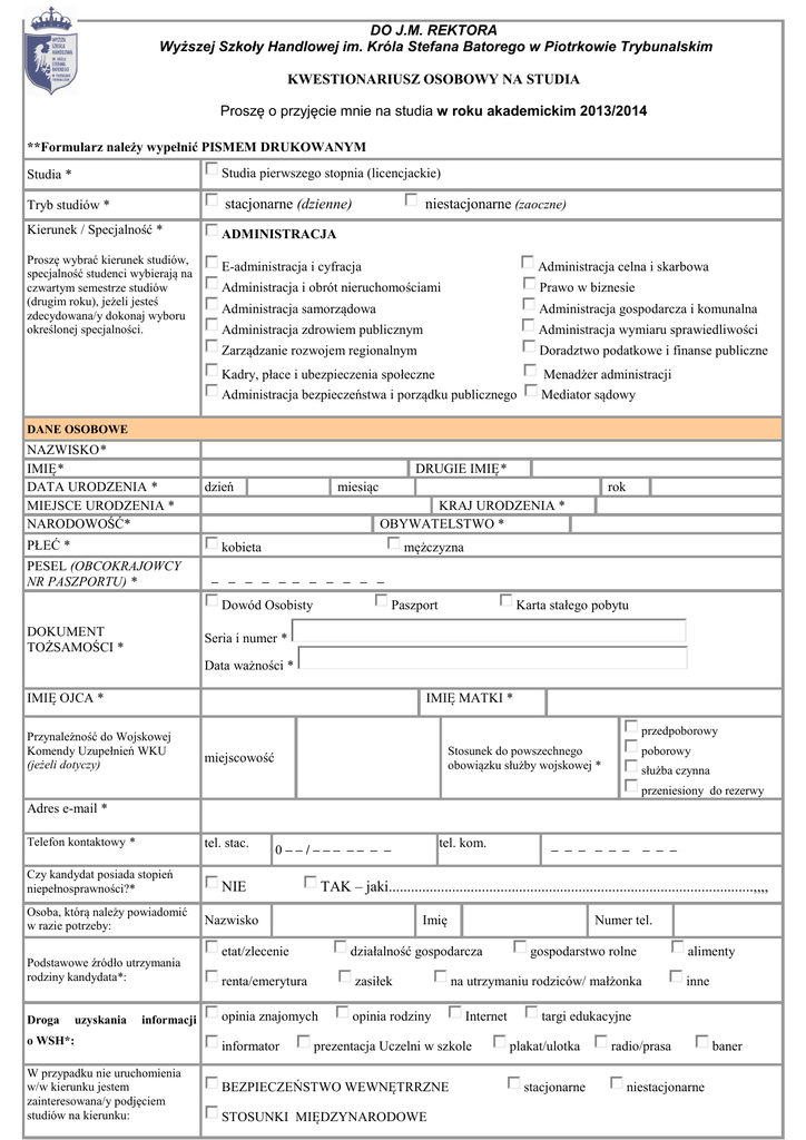 DO J.M. REKTORA Wyższej Szkoły Handlowej im. Króla Stefana Batorego w Piotrkowie Trybunalskim KWESTIONARIUSZ OSOBOWY NA STUDIA Proszę o przyjęcie mnie na studia w roku akademickim 2013/2014 **Formularz należy wypełnić PISMEM DRUKOWANYM Studia * Studia pierwszego stopnia (licencjackie) Tryb studiów * stacjonarne (dzienne) Kierunek / Specjalność * ADMINISTRACJA Proszę wybrać kierunek studiów, specjalność studenci wybierają na czwartym semestrze studiów (drugim roku), jeżeli jesteś zdecydowana/y dokonaj wyboru określonej specjalności. niestacjonarne (zaoczne) E-administracja i cyfracja Administracja celna i skarbowa Administracja i obrót nieruchomościami Prawo w biznesie Administracja samorządowa Administracja gospodarcza i komunalna Administracja zdrowiem publicznym Administracja wymiaru sprawiedliwości Zarządzanie rozwojem regionalnym Doradztwo podatkowe i finanse publiczne Kadry, płace i ubezpieczenia społeczne Administracja bezpieczeństwa i porządku publicznego Menadżer administracji Mediator sądowy DANE OSOBOWE NAZWISKO* IMIĘ* DATA URODZENIA * MIEJSCE URODZENIA * NARODOWOŚĆ* PŁEĆ * DRUGIE IMIĘ* dzień miesiąc rok KRAJ URODZENIA * OBYWATELSTWO * kobieta PESEL (OBCOKRAJOWCY NR PASZPORTU) * mężczyzna – – – – – – – – – – – Dowód Osobisty DOKUMENT TOŻSAMOŚCI * Paszport Karta stałego pobytu Seria i numer * Data ważności * IMIĘ OJCA * IMIĘ MATKI * Przynależność do Wojskowej Komendy Uzupełnień WKU (jeżeli dotyczy) przedpoborowy poborowy Stosunek do powszechnego obowiązku służby wojskowej * miejscowość służba czynna przeniesiony do rezerwy Adres e-mail * Telefon kontaktowy * tel. stac. Czy kandydat posiada stopień niepełnosprawności?* Osoba, którą należy powiadomić w razie potrzeby: Podstawowe źródło utrzymania rodziny kandydata*: Droga uzyskania informacji o WSH*: W przypadku nie uruchomienia w/w kierunku jestem zainteresowana/y podjęciem studiów na kierunku: tel. kom. 0––/––– –– – – NIE – – – TAK – jaki..................................................................................................,,,, Nazwisko Imię etat/zlecenie Numer tel. działalność gospodarcza renta/emerytura zasiłek opinia znajomych opinia rodziny informator – – – – – – na utrzymaniu rodziców/ małżonka Internet prezentacja Uczelni w szkole BEZPIECZEŃSTWO WEWNĘTRRZNE STOSUNKI MIĘDZYNARODOWE gospodarstwo rolne alimenty inne targi edukacyjne plakat/ulotka stacjonarne radio/prasa niestacjonarne baner DANE KONTAKTOWE Ulica ADRES ZAMELDOWANIA * Nr domu/mieszkania Kod pocztowy Miejscowość Rodzaj miejscowości: Miasto Wieś Kraj Województwo Adres korespondencyjny taki sam jak zameldowania Ulica ADRES KORESPONDENCYJNY* Nr domu/mieszkania Kod pocztowy Miejscowość Rodzaj miejscowości: Miasto Wieś Kraj Województwo UKOŃCZONA SZKOŁA ŚREDNIA PEŁNA NAZWA SZKOŁY* KRAJ * NR ŚWIADECTWA DOJRZAŁOŚCI* WYDANE PRZEZ (Z PIECZĄTKI)* RODZAJ MATURY * MIEJSCOWOŚĆ * DATA WYDANIA* nowa stara zagraniczna *- wypełnienie tych danych jest obowiązkowe Prosimy o zweryfikowanie wprowadzonych danych. Uprzedza się o odpowiedzialności karnej za składanie nieprawdziwych danych Oświadczam, ze dane zawarte w kwestionariuszu podałam/em zgodnie ze stanem faktycznym oraz wyrażam zgodę na przetwarzanie i wykorzystanie moich danych osobowych oraz umieszczanie ich w bazie dla potrzeb realizacji procesu rekrutacji zgodnie z Ustawa z dnia 29 sierpnia 1997 r. O Ochronie Danych Osobowych Dz. U. Nr133, poz.883 z późn. zm. Prawidłowość danych zawartych w podaniu stwierdzam własnoręcznym podpisem. Wyrażam zgodę na wykorzystanie i przetwarzanie moich danych osobowych dla potrzeb Wyższej Szkoły Handlowej im. Króla Stefana Batorego w Piotrkowie Trybunalskim zgodnie z ustawą z dnia 29.08.1997r. o ochronie danych osobowych (Dz.U. Nr 133 poz. 883 z późn. zm.). Wyrażam zgodę/nie wyrażam zgody* na otrzymywanie na mój adres e-mail informacji o organizowanych przez WSH kursach, szkoleniach, konferencjach naukowych oraz innych działaniach związanych z działalnością dydaktyczną WSH w Piotrkowie Trybunalskim Piotrków Trybunalski, dnia Podpis kandydata Decyzja Wydziałowej Komisji Rekrutacyjnej: Przyjąć / Nie przyjąć* na kierunek ADMINISTRACJA studia pierwszego stopnia w systemie stacjonarnym / niestacjonarnym*. Piotrków Trybunalski, dnia................................ .............................................................. (Przewodniczący Komisji) ............................................................. (Członkowie) .............................................................. (Członkowie)
