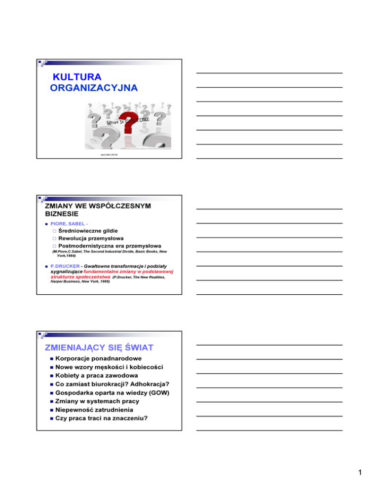 KULTURA ORGANIZACYJNA sem.letni 2014r ZMIANY WE WSPÓŁCZESNYM BIZNESIE PIORE, SABEL Średniowieczne gildie Rewolucja przemysłowa Postmodernistyczna era przemysłowa (M.Piore,C.Sabel, The Second Industrial Divide, Basic Books, New York,1984) P.DRUCKER - Gwałtowne transformacje i podziały sygnalizujące fundamentalne zmiany w podstawowej strukturze społeczeństwa (P.Drucker, The New Realities, Harper Business, New York, 1989) ZMIENIAJĄCY SIĘ ŚWIAT Korporacje ponadnarodowe Nowe wzory męskości i kobiecości Kobiety a praca zawodowa Co zamiast biurokracji? Adhokracja? Gospodarka oparta na wiedzy (GOW) Zmiany w systemach pracy Niepewność zatrudnienia Czy praca traci na znaczeniu? 1 STOSUNKI WŁADZY OPARTE NA PŁCI „SZKLANY SUFIT” PŁEĆ W MIEJSCU PRACY SPOSOBY WYRAŻANIA SEKSUALNOŚCI NOWY MODEL RODZINY MOBBING OPIEKA NAD DZIEĆMI D.Tannen – „płeć wpływa na sposób komunikacji z innymi ludźmi” J.Rossener – „kobiety dowodzą inaczej niż mężczyźni” JAK WYGLĄDA WSPÓŁCZESNE OTOCZENIE PRZEDSIĘBIORSTW? Sieciowość działalności biznesowej (rozproszenie, współpraca z wieloma partnerami biznesowymi) Szybkość działania na rynku, potrzeba szybkiego reagowanie na potrzeby klientów – just in time Duże znaczenie informacji, baz danych klientów – kto ma informację, ten ma przewagę Współczesne przedsiębiorstwo musi być „rerum novarum cupidus” czyli żądne rzeczy nowych /Peter Drucker/ DLACZEGO? Ponieważ otoczenie przedsiębiorstw ulega nieustannym i dynamicznym zmianom KONSEKWENCJE Nowa umowa psychologiczna ???? 2 OBAWY MENEDŻERÓW ZWIĄZANE Z WEJŚCIEM W XXI WIEK ZMIANY WYSZUKIWANIE I ROZWÓJ UTALENTOWANYCH PRACOWNIKÓW KREOWANIE WZROSTU I ZARZĄDZANIE NIM KONTROLOWANIE KOSZTÓW ZARZĄDZANIE PRODUKTYWNOŚCIĄ NACISKI ZWIĄZANE Z USTALANIEM CEN DZIAŁANIE W WARUNKACH REGULACJI NADĄŻANIE ZA ROZWOJEM TECHNOLOGII INNE 21 % 14% 12% 8% 8% 7% 6% 4% 20% Ale: dyrektorzy poświęcają tylko 2,4% energii na budowanie wspólnej przyszłości, a powinni 20-50% (Hamel, Prahalad) PRZYSZŁOŚĆ przygotowywanie się do reakcji na jak największą liczbę możliwych zdarzeń możliwości wyboru, wiedza o tym, kiedy modyfikować pierwotne założenia rola alternatywnych scenariuszy sukces niekoniecznie odniosą te firmy, które dobrze odgadną kierunek zmian, ale te, których elastyczność pozwoli na istnienie w różnych warunkach ( praktyczny przykład teorii chaosu) PYTANIA Komu służy przedsiębiorstwo? W czyim interesie powinno być zarządzane? Kto powinien je kontrolować, a kto podejmować kluczowe decyzje? Kto i za co jest odpowiedzialny? Na jakich zasadach powinna się odbywać redystrybucja wytworzonego w przedsiębiorstwie bogactwa? 3 Kultura organizacyjna Kultura organizacji to konfiguracja norm, wartości, przekonań i zachowań, charakteryzująca sposób w jaki grupy lub jednostki łączą się w celu wykonywania pracy (Eldrige, Crombie) Kultura organizacyjna System nieformalnych zasad, informujących, jak ludzie mają się zwykle zachowywać ( Deal, Kennedy) Powszechnie przyjęte przekonania, postawy i wartości istniejące w organizacji. (E.Schein) „Sposób w jaki działamy” (Furnham, Gunter) KULTURA ORGANIZACYJNA „Systemy wartości, norm, symboli, typowych dla danej organizacji, rozwijających się w danym czasie, w wyniku którego powstają wzory postępowania dla całej instytucji oraz odpowiednia hierarchia wartości” „Zbiór norm społecznych i systemów wartości, które są stymulatorami zachowań członków instytucji istotnych dla realizacji określonego celu” sem.letni 2014r 4 FUNKCJE INTEGRACYJNA DAJE POCZUCIE TOŻSAMOŚCI PERCEPCYJNA SYSTEM ZNACZEŃ ADAPTACYJNA ZMNIEJSZA POCZUCIE NIEPEWNOSCI KONTROLNA KSZTAŁTUJE WSPÓLNE UKŁADY ODNIESIENIA sem.letni 2014r Kultura organizacyjna wg E. H. Scheina ARTEFAKTY WARTOŚCI ZAŁOŻENIA sem.letni 2014r Składniki kultury organizacyjnej Edgar Schein Artefakty/ konwencje Są sztucznym tworem danej kultury. Artefakty są tym, co się widzi, słyszy i czuje, gdy stykamy się z nową grupą Artefakty kulturowe (język, mity, legendy) Artefakty behawioralne (ceremonie, rytuały) Artefakty fizyczne (sztuka, technologia, przedmioty materialne,) sem.letni 2014r 5 Składniki kultury organizacyjnej Wartości Wiążą się z wiarą w to, co jest najlepsze dla organizacji i co powinno się wydarzyć dla jej dobra Im silniejsze wartości, tym większy wpływ wywierają na zachowania Składniki kultury organizacyjnej Normy Niepisane zasady postępowania, reguły stanowiące nieformalne wskazówki jak należy postępować. Są przekazywane w sposób nieformalny i nie są spisane. Zapisane – to procedury Klasyfikacje kultur, np. Harrisona zorientowana na władzę (reagująca bardziej na osobowość niż fachowość) zorientowana na ludzi (jednomyślna, odrzucająca kontrolę ) zorientowana na zadania (skupiająca uwagę na kompetencje, dynamiczna) zorientowana na role (skupia uwagę na postępowaniu zgodnie z prawem, legalność i biurokrację) 6 Typy kultury organizacyjnej Typologia Deala i Kennedy’ego (szybkość informacji z otoczenia oraz stopień ryzyka w działalności) Kultura indywidualistów (wszystko albo nic)– ludzie nastawieni są na szybkie osiąganie sukcesów. Liczą się indywidualne umiejętności i obowiązuje agresywna postawa wobec otoczenia. Ceniona jest szybkość reakcji na sytuację pojawiające się w otoczeniu i łatwość podejmowania ryzykownych decyzji. Kultura hazardzistów (igrzysk i chleba)– wykazuje skłonność do ryzyka, ale ze względu na wolniejsze tempo informacji docierających z otoczenia zawiera ona wzory bardziej systematycznej, wytężonej pracy. W kulturze tej ważne są współpraca i kontakty osobiste między ludźmi. sem.letni 2014r Typy kultury organizacyjnej Typologia Deala i Kennedy’ego (szybkość informacji z otoczenia oraz stopień ryzyka w działalności) Kultura zrównoważona (analityczna)– występuje tam, gdzie ryzyko dział