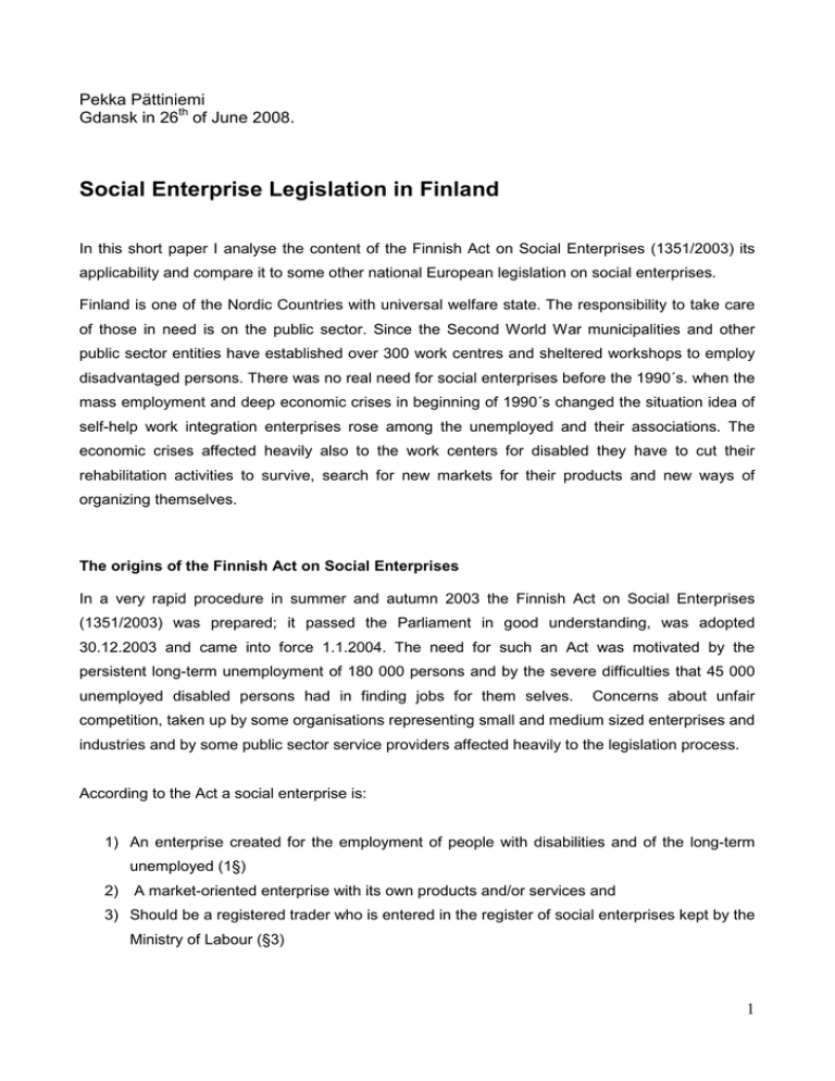 Act on Social Enterprises No. 1351/2003 Issued in Helsinki, December 30, 2003
