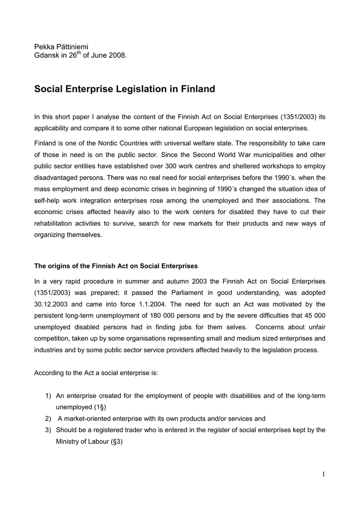 In this short paper I analyse the content of the Finnish Act on Social Enterprises (1351/2003) its