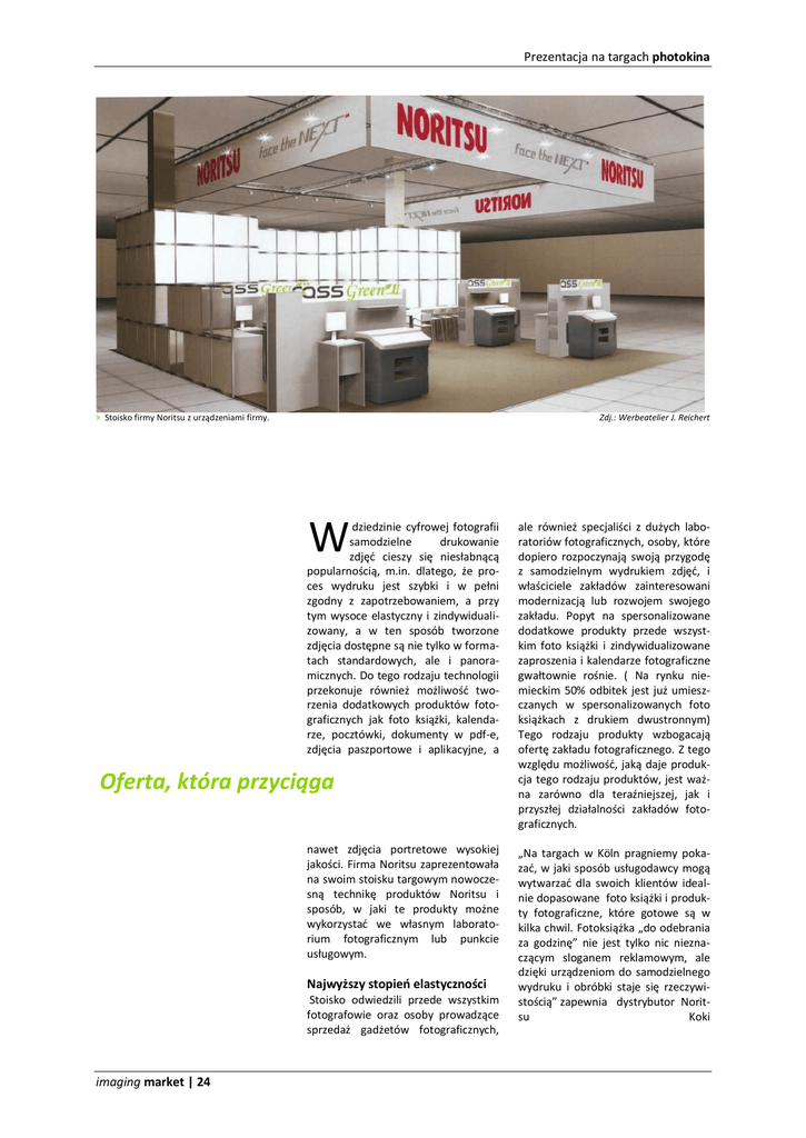 Prezentacja na targach photokina > Stoisko firmy Noritsu z urządzeniami firmy. Zdj.: Werbeatelier J. Reichert W dziedzinie cyfrowej fotografii samodzielne drukowanie zdjęć cieszy się niesłabnącą popularnością, m.in. dlatego, że proces wydruku jest szybki i w pełni zgodny z zapotrzebowaniem, a przy tym wysoce elastyczny i zindywidualizowany, a w ten sposób tworzone zdjęcia dostępne są nie tylko w formatach standardowych, ale i panoramicznych. Do tego rodzaju technologii przekonuje również możliwość tworzenia dodatkowych produktów fotograficznych jak foto książki, kalendarze, pocztówki, dokumenty w pdf-e, zdjęcia paszportowe i aplikacyjne, a Oferta, która przyciąga nawet zdjęcia portretowe wysokiej jakości. Firma Noritsu zaprezentowała na swoim stoisku targowym nowoczesną technikę produktów Noritsu i sposób, w jaki te produkty możne wykorzystać we własnym laboratorium fotograficznym lub punkcie usługowym. Najwyższy stopień elastyczności Stoisko odwiedzili przede wszystkim fotografowie oraz osoby prowadzące sprzedaż gadżetów fotograficznych, imaging market | 24 ale również specjaliści z dużych laboratoriów fotograficznych, osoby, które dopiero rozpoczynają swoją przygodę z samodzielnym wydrukiem zdjęć, i właściciele zakładów zainteresowani modernizacją lub rozwojem swojego zakładu. Popyt na spersonalizowane dodatkowe produkty przede wszystkim foto książki i zindywidualizowane zaproszenia i kalendarze fotograficzne gwałtownie rośnie. ( Na rynku niemieckim 50% odbitek jest już umieszczanych w spersonalizowanych foto książkach z drukiem dwustronnym) Tego rodzaju produkty wzbogacają ofertę zakładu fotograficznego. Z tego względu możliwość, jaką daje produkcja tego rodzaju produktów, jest ważna zarówno dla teraźniejszej, jak i przyszłej działalności zakładów fotograficznych. „Na targach w Köln pragniemy pokazać, w jaki sposób usługodawcy mogą wytwarzać dla swoich klientów idealnie dopasowane foto książki i produkty fotograficzne, które gotowe są w kilka chwil. Fotoksiążka „do odebrania za godzinę” nie jest tylko nic nieznaczącym sloganem reklamowym, ale dzięki urządzeniom do samodzielnego wydruku i obróbki staje się rzeczywistością” zapewnia dystrybutor Noritsu Koki Prezentacja na targach photokina > Minilab QSS Green wyróżnia automatyczny mechanizm odwracania arkuszy, który sprawia, że obsługa dwustronnego wydruku jest wyjątkowo wygodna. Zdj. NK Works Co., Ltd. W dniach od 16 do 21 września 2014 miasto Köln ponownie stała się mekką branży fotograficznej. Stoisko firmy Noritsu i w tym roku przyciągnęło rzeszę fotografów oraz sprzedawców produktów i usług fotograficznych. Dystrybutor urządzeń Noritsu, którego siedziba od początku roku znajduje się w Hünxe, zaprezentował na swoim stoisku w hal i3.1, A20/B-21 najnowszą ofertę urządzeń drukujących Noritsu oraz akcesoriów, np. stacji przyjmujących, systemów do składania książek, oprogramowania i oczywiście zdjęcia i produkty wytworzone za pomocą zaprezentowanych maszyn i rozwiązań. mgr inż. Thomas Mümken. Zalety szybkiej i dopasowanej do indywidualnych potrzeb samodzielnej produkcji zdjęć i produktów fotograficznych dotyczą całego spektrum usługowego: od zdjęć w małych formatach poprzez plakaty do licznych spersonalizowanych książek fotograficznych. Do niewątpliwych zalet tego rodzaju urządzeń drukujących należy ponadto bardzo dobra jakość zdjęć typowa dla wszystkich produktów wytwarzanych przy użyciu suchych minilabów Noritsu. Jakość zdjęć w fotoksiążkach drukowanych na minilabach opartych na suchym procesie firmy Noritsu jest zdecydowanie lepsza od fotoksiążek drukowanych laserowo przez duże laboratoria fotograficzne. Skala barw wydruku opartego na minilabach jest nieporównywalnie lepsza od skali typowej dla papieru fotograficznego. Noritsu przedstawiło na swoim stoisku cały proces produkcyjny oraz roboczy począwszy od złożenia zamówienia na terminalu lub zamówienia dokonanego online bezpośrednio z domu, poprzez produkcję za pomocą urządzeń drukujących aż do wydania zdjęć i ksiązek fotograficznych. W Köln czekały na stoisku na odwiedzających dwa gotowe do eksploatacji minilaby QSS Green II, jeden minilab QSS Green oraz D705 Green (patrz również str. 58) z aktualnej oferty firmy oraz jedno urządzenie drukujące oparte na technologii fotochemicznej QSS-3704 HD. Firma Noritsu jest jedynym producentem oferującym maszyny drukujące wyposażone w funkcję Duplex, które są tym samym jedynymi maszynami „mogącymi stawić czoło przyszłościowym wyzwaniom. Kupując minilab oparty na suchym procesie technologicznym można mieć pewność, iż przez następne lata żadna inwestycja nie będzie już konieczna – zarówno pod względem technicznym, jak i finansowym. Tylko oferowane przez nas modele maszyn drukujących z funkcją Duplex, które drukują zarówno jedno-, jak i dwustronnie, gwarantują fotografom i sprzedawcom produktów fotograficznych najwyższą elastyczność. Dzięki naszym rozwiązaniom można wywoływać zdjęcia standardowe oraz drukować spersonalizowane książki fotograficzne spełniające wszystkie oczekiwania klientów", dodaje Thomas Mümken. Nowoczesny terminal systemowy Noritsu wystawiło na swoim stoisku również trzy kompatybilne stacje przyjmujące HPT niezbędne w procesie przyjmowania zleceń. Terminal, który jest specjalnie dopasowany do oczekiwań konsumentów europejskiego rynku fotograficznego, jest najwyższym osiągnięciem technicznym w dziedzinie tego rodzaju stacji, a przy tym dostępny w bardzo korzystnej cenie. Najważniejszy jego element stanowi komputer stacjonarny DellOptiPlex z procesorem Intel i3, pamięcią operacyjną 4 GB i dyskiem twardym o pojemności 500 GB. Terminal obsługiwany jest za pomocą ekranu dotykowego na podczerwień o przekątnej wynoszącej 23 cale. Specjalna powłoka an