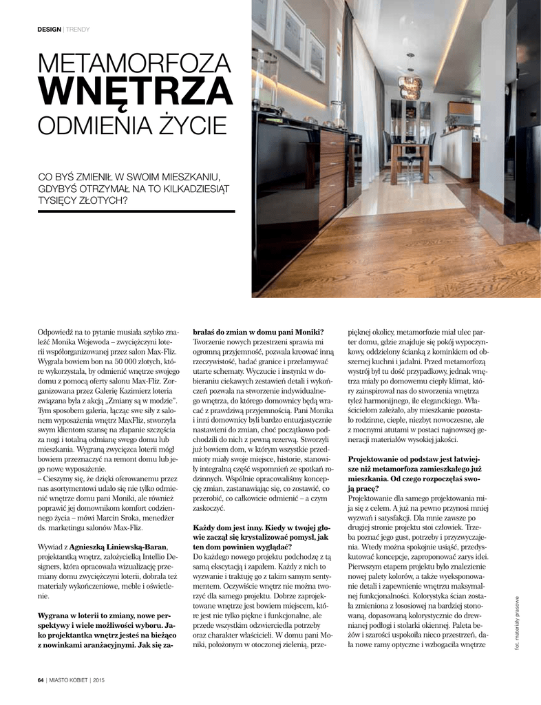design | trendy Metamorfoza wnętrza odmienia życie Co byś zmienił w swoim mieszkaniu, gdybyś otrzymał na to kilkadziesiąt tysięcy złotych? Wywiad z Agnieszką Liniewską-Baran, projektantką wnętrz, założycielką Intellio Designers, która opracowała wizualizację przemiany domu zwyciężczyni loterii, dobrała też materiały wykończeniowe, meble i oświetlenie. Wygrana w loterii to zmiany, nowe perspektywy i wiele możliwości wyboru. Jako projektantka wnętrz jesteś na bieżąco z nowinkami aranżacyjnymi. Jak się za- 64 | Miasto kobiet | 2015 brałaś do zmian w domu pani Moniki? Tworzenie nowych przestrzeni sprawia mi ogromną przyjemność, pozwala kreować inną rzeczywistość, badać granice i przełamywać utarte schematy. Wyczucie i instynkt w dobieraniu ciekawych zestawień detali i wykończeń pozwala na stworzenie indywidualnego wnętrza, do którego domownicy będą wracać z prawdziwą przyjemnością. Pani Monika i inni domownicy byli bardzo entuzjastycznie nastawieni do zmian, choć początkowo podchodzili do nich z pewną rezerwą. Stworzyli już bowiem dom, w którym wszystkie przedmioty miały swoje miejsce, historie, stanowiły integralną część wspomnień ze spotkań rodzinnych. Wspólnie opracowaliśmy koncepcję zmian, zastanawiając się, co zostawić, co przerobić, co całkowicie odmienić – a czym zaskoczyć. Każdy dom jest inny. Kiedy w twojej głowie zaczął się krystalizować pomysł, jak ten dom powinien wyglądać? Do każdego nowego projektu podchodzę z tą samą ekscytacją i zapałem. Każdy z nich to wyzwanie i traktuję go z takim samym sentymentem. Oczywiście wnętrz nie można tworzyć dla samego projektu. Dobrze zaprojektowane wnętrze jest bowiem miejscem, które jest nie tylko piękne i funkcjonalne, ale przede wszystkim odzwierciedla potrzeby oraz charakter właścicieli. W domu pani Moniki, położonym w otoczonej zielenią, prze- pięknej okolicy, metamorfozie miał ulec parter domu, gdzie znajduje się pokój wypoczynkowy, oddzielony ścianką z kominkiem od obszernej kuchni i jadalni. Przed metamorfozą wystrój był tu dość przypadkowy, jednak wnętrza miały po domowemu ciepły klimat, który zainspirował nas do stworzenia wnętrza tyleż harmonijnego, ile eleganckiego. Właścicielom zależało, aby mieszkanie pozostało rodzinne, ciepłe, niezbyt nowoczesne, ale z mocnymi atutami w postaci najnowszej generacji materiałów wysokiej jakości. Projektowanie od podstaw jest łatwiejsze niż metamorfoza zamieszkałego już mieszkania. Od czego rozpoczęłaś swoją pracę? Projektowanie dla samego projektowania mija się z celem. A już na pewno przynosi mniej wyzwań i satysfakcji. Dla mnie zawsze po drugiej stronie projektu stoi człowiek. Trzeba poznać jego gust, potrzeby i przyzwyczajenia. Wtedy można spokojnie usiąść, przedyskutować koncepcje, zaproponować zarys idei. Pierwszym etapem projektu było znalezienie nowej palety kolorów, a także wyeksponowanie detali i zapewnienie wnętrzu maksymalnej funkcjonalności. Kolorystyka ścian została zmieniona z łososiowej na bardziej stonowaną, dopasowaną kolorystycznie do drewnianej podłogi i stolarki okiennej. Paleta beżów i szarości uspokoiła nieco przestrzeń, dała nowe ramy optyczne i wzbogaciła wnętrze fot. materiały prasowe Odpowiedź na to pytanie musiała szybko znaleźć Monika Wojewoda – zwyciężczyni loterii współorganizowanej przez salon Max-Fliz. Wygrała bowiem bon na 50 000 złotych, które wykorzystała, by odmienić wnętrze swojego domu z pomocą oferty salonu Max-Fliz. Zorganizowana przez Galerię Kazimierz loteria związana była z akcją „Zmiany są w modzie”. Tym sposobem galeria, łącząc swe siły z salonem wyposażenia wnętrz MaxFliz, stworzyła swym klientom szansę na złapanie szczęścia za nogi i totalną odmianę swego domu lub mieszkania. Wygraną zwycięzca loterii mógł bowiem przeznaczyć na remont domu lub jego nowe wyposażenie. – Cieszymy się, że dzięki oferowanemu przez nas asortymentowi udało się nie tylko odmienić wnętrze domu pani Moniki, ale również poprawić jej domownikom komfort codziennego życia – mówi Marcin Sroka, menedżer ds. marketingu salonów Max-Fliz. o elegancką przytulność. Subtelna gra kolorów i faktur tworzy teraz wnętrze zupełnie wyjątkowe. lonu włoskiego producenta Maxdivaniego. Zastąpiła ona poprzednią kanapę, utrzymaną w jaskrawej, mocnej kolorystyce. Kiedy już zaczęły się zmiany, nie skończyło się na kolorach, prawda? Oczywiście! (śmiech) Zasadą w projektowaniu dobrych wnętrz jest to, że im mniej, tym lepiej. Salon łatwo jest zagracić zbędnymi tekstyliami, złym doborem kolorów ścian i mebli, nagromadzeniem różnobarwnych przedmiotów, detali, wzorów i faktur. Metamorfoza domu pani Moniki polegała przede wszystkim na uporządkowaniu wnętrza tak, by odzyskało oddech. We wnętrzu znalazły się niektóre elementy starego wystroju – m. in. krzesła w jadalni oraz kominek. Natomiast ścianę obok kominka wyłożyliśmy taflami czarnego szkła, które doskonale odbijają światło i optycznie powiększają przestrzeń salonu. Większość mebli, jakie się znalazły w salonie, została zaprojektowania i wykonana na zamówienie w salonie Max-Fliz, zgodnie z potrzebami domowników i wielką dbałością o proporcje i detale. Komoda, stół w jadalni, szafki wiszące oraz stolik kawowy zyskały dzięki temu ujednoliconą, minimalistyczną formę, idealnie komponującą się z charakterem wnętrza. Połączenie ciepłego drewna i ciemnego szkła okazało się strzałem w dziesiątkę! Perłą salonu jest wygodna, skórzana sofa w kolorze kości słoniowej, pochodząca z sa- Nie wierzę, że wszystko odbyło się tak bezproblemowo. Były momenty zwątpienia? Nigdy! Metamorfozy wnętrz takich jak to dają wiele satysfakcji i pozytywnej energii do działania. Ale przyznaję, nie obyło się bez głębszych przeróbek. Do oświet