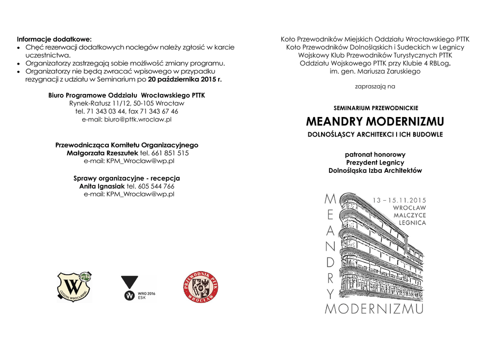Informacje dodatkowe: Chęć rezerwacji dodatkowych noclegów należy zgłosić w karcie uczestnictwa. Organizatorzy zastrzegają sobie możliwość zmiany programu. Organizatorzy nie będą zwracać wpisowego w przypadku rezygnacji z udziału w Seminarium po 20 października 2015 r. Biuro Programowe Oddziału Wrocławskiego PTTK Rynek-Ratusz 11/12, 50-105 Wrocław tel. 71 343 03 44, fax 71 343 67 46 e-mail: [email protected] Koło Przewodników Miejskich Oddziału Wrocławskiego PTTK Koło Przewodników Dolnośląskich i Sudeckich w Legnicy Wojskowy Klub Przewodników Turystycznych PTTK Oddziału Wojskowego PTTK przy Klubie 4 RBLog. im. gen. Mariusza Zaruskiego zapraszają na SEMINARIUM PRZEWODNICKIE MEANDRY MODERNIZMU DOLNOŚLĄSCY ARCHITEKCI I ICH BUDOWLE Przewodnicząca Komitetu Organizacyjnego Małgorzata Rzeszutek tel. 661 851 515 e-mail: [email protected] Sprawy organizacyjne - recepcja Anita Ignasiak tel. 605 544 766 e-mail: [email protected] patronat honorowy Prezydent Legnicy Dolnośląska Izba Architektów 15 listopada 2015 r. (niedziela) PROGRAM SEMINARIUM 13 listopada 2015 r. (piątek) Rejestracja uczestników, Hotel SAVOY, pl. T. Kościuszki 19, Szlakiem modernistycznych kamienic czynszowych spacer po dzielnicy Krzyki, do 15.50 Rejestracja uczestników w Klubie 4. Reg. Bazy Logistycznej, ul. B. Pretficza 24, 16.00 - 18.30 Otwarcie seminarium oraz wykład wprowadzający w tematykę: „Modernizm wrocławski – modernizm europejski”dr inż. arch. Jadwiga Urbanik, ponadto „Spójrzmy w górę, czyli detal w architekturze modernistycznej Wrocławia”mgr Jadwiga Jasińska-Sadura „Modernizm zaproś do domu - wrocławskie domy własne architektów" - kol. Damian Kanclerski 20.00 Kolacja, wieczór z taneczną niespodzianką 8.00 9.00 - 13.00 13.00 14.30 14 listopada 2015 r. (sobota) 7.30 8.15 - 9.30 10.30 - 13.00 13.30 - 17.00 17.00 - 19.00 20.00 Śniadanie - Hotel SAVOY Najciekawsze budowle modernistyczne w centrum Wrocławia na przykładzie wybranych obiektów m.in. domy towarowe E.Mendelsona H. Dernburga, biurowce H.Poelziga, H.Rumpa i innych - spacer poznawczy Sesja krajoznawcza: zwiedzanie unikatowego kościoła w Malczycach, wykłady: „Historia parafii prawosławnej w Malczycach” ks. mitrat Michał Szlaga „Malczyckie dzieło Hansa Poelziga mgr Zdzisław Kurzeja Sesja plenerowa: „Legnickie obiekty budowlane okresu modernizmu” - mgr Zdzisław Kurzeja Panel dyskusyjny, zapowiedz sesji w 2016 r. „Gdynia - Modernistyczny Pomnik Historii” kol. Jarosław Kaczmarczyk, obiadokolacja Wrocław wieczorową porą…widziany ze Sky Tower 13.30 - 14.30 Śniadanie - Hotel SAVOY Panel plenerowo-wykładowy: Początki modernizmu we Wrocławiu prezentacja najciekawszych przykładów wrocławskiego modernizmu, m.in. założenia Hali Stulecia, wystawa wzorowego osiedla WuWA i jej dzisiejsze ślady Obiad, zakończenie seminarium SERDECZNIE ZAPRASZAMY INFORMACJE ORGANIZACYJNE: Koszt uczestnictwa: Przewodnicy PTTK – 290 zł, pozostali uczestnicy – 310 zł. (Dla osób nie korzystających z noclegów: Przewodnicy 160 zł, pozostali uczestnicy 180 zł). W tym: 2 noclegi ze śniadaniem (pokoje 2 - 3 osobowe), posiłek turystyczny w Malczycach, obiad, 2 kolacje, przejazd autokarem na trasie Wrocław – Malczyce - Legnica - Wrocław, obsługa przewodnicka, bilet wstępu oraz bilety MPK, materiały informacyjne, pieczęć okolicznościowa, ubezpieczenie NNW Noclegi: Hotel SAVOY, 50-027 Wrocław, pl. T Kościuszki 19, tel. 71 344 30 71, 71 340 32 19 Kartę Zgłoszenia wraz z kserokopią / skan dowodu wpłaty należy przysłać do dnia 10 października 2015 r. na adres: Oddział Wrocławski PTTK, 50-106 Wrocław, Rynek-Ratusz 11/12 Nr konta: Bank Zachodni WBK S.A. 1 Oddział Wrocław 19 1090 2398 0000 0006 0827 5667 Z informacją na dowodach wpłaty: Meandry Modernizmu