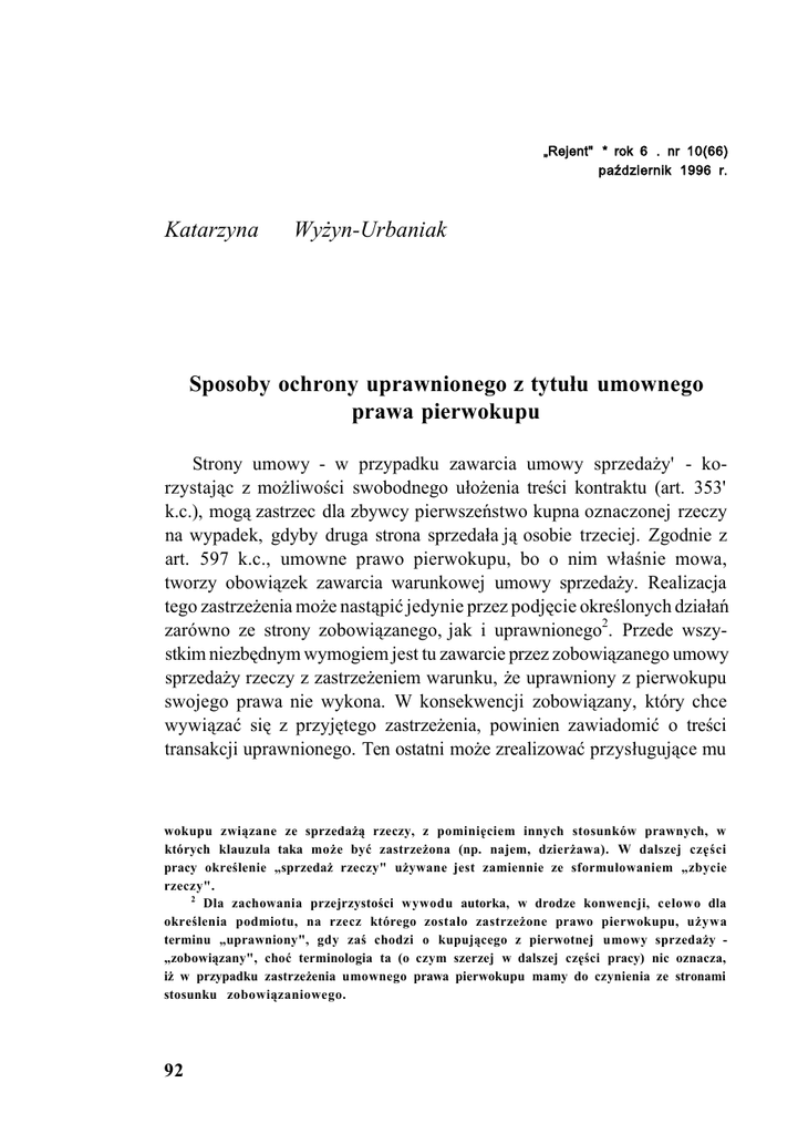 „Rejent" * rok 6 . nr 10(66) październik 1996 r. Katarzyna Wyżyn-Urbaniak Sposoby ochrony uprawnionego z tytułu umownego prawa pierwokupu Strony umowy - w przypadku zawarcia umowy sprzedaży' - korzystając z możliwości swobodnego ułożenia treści kontraktu (art. 353' k.c.), mogą zastrzec dla zbywcy pierwszeństwo kupna oznaczonej rzeczy na wypadek, gdyby druga strona sprzedała ją osobie trzeciej. Zgodnie z art. 597 k.c., umowne prawo pierwokupu, bo o nim właśnie mowa, tworzy obowiązek zawarcia warunkowej umowy sprzedaży. Realizacja tego zastrzeżenia może nastąpić jedynie przez podjęcie określonych działań zarówno ze strony zobowiązanego, jak i uprawnionego2. Przede wszystkim niezbędnym wymogiem jest tu zawarcie przez zobowiązanego umowy sprzedaży rzeczy z zastrzeżeniem warunku, że uprawniony z pierwokupu swojego prawa nie wykona. W konsekwencji zobowiązany, który chce wywiązać się z przyjętego zastrzeżenia, powinien zawiadomić o treści transakcji uprawnionego. Ten ostatni może zrealizować przysługujące mu wokupu związane ze sprzedażą rzeczy, z pominięciem innych stosunków prawnych, w których klauzula taka może być zastrzeżona (np. najem, dzierżawa). W dalszej części pracy określenie „sprzedaż rzeczy" używane jest zamiennie ze sformułowaniem „zbycie rzeczy". 2 Dla zachowania przejrzystości wywodu autorka, w drodze konwencji, celowo dla określenia podmiotu, na rzecz którego zostało zastrzeżone prawo pierwokupu, używa terminu „uprawniony", gdy zaś chodzi o kupującego z pierwotnej umowy sprzedaży „zobowiązany", choć terminologia ta (o czym szerzej w dalszej części pracy) nic oznacza, iż w przypadku zastrzeżenia umownego prawa pierwokupu mamy do czynienia ze stronami stosunku zobowiązaniowego. 92 Sposoby ochrony uprawnionego z tytułu. prawo przez złożenie oświadczenia o wykonaniu prawa pierwokupu3 i tym samym doprowadzić do nawiązania z zobowiązanym umowy sprzedaży rzeczy na warunkach ustalonych wcześniej z osobą trzecią. W razie gdyby zobowiązany zawarł z inną osobą umowę bezwarunkową lub nie zawiadomił uprawnionego o sprzedaży warunkowej albo podał mu do wiadomości istotne postanowienia kontraktu niezgodne z rzeczywistością - ponosi on odpowiedzialność odszkodowawczą, o czym szerzej w dalszej części pracy. Nieco odmiennie instytucję umownego prawa pierwokupu regulował kodeks zobowiązań z 1933 r. Co prawda, także w jego ujęciu, umowa zobowiązanego z osobą trzecią prowadziła do zawarcia warunkowej umowy sprzedaży, tym niemniej uprawnionemu z tytułu prawa pierwokupu służyły szersze środki ochrony. W razie zbycia prawa majątkowego4 osobie trzeciej bezwarunkowo, uprawniony miał bowiem roszczenie odszkodowawcze wobec zobowiązanego, a dodatkowo mógł też wykonać prawo pierwokupu w stosunku do osoby trzeciej, jeżeli tylko wykazał, że w momencie zawierania kontraktu działała ona w złej wierze5. Realizacja tego uprawnienia następowała w taki sam sposób jak wobec zobowiązanego, to znaczy przez złożenie w odpowiednim terminie6 oświadczenia woli skierowanego do wspomnianej osoby. 3 Jeżeli prawo pierwokupu dotyczy nieruchomości, uprawniony może złożyć zobowiązanemu stosowne oświadczenie w ciągu miesiąca, w przypadku zaś innych rzeczy w ciągu tygodnia od dnia otrzymania zawiadomienia o sprzedaży rzeczy. Norma zawarta w art. 598 § 2 k.c. ma jednak charakter ius dispositivum, albowiem strony mogą w umowie ustalić inne terminy. 4 Art. 346 § 1 k.z. wskazywał na możliwość zastrzeżenia w umowie pierwszeństwa w nabyciu p r a w a , stąd też mógł mieć wprost zastosowanie nie tylko do prawa własności i innych praw majątkowych na rzeczy, ale też do takich praw, jak akcje, obligacje, udziały, prawa spadkowe, wierzytelności itd. 5 Aby przyjąć po stronie osoby trzeciej istnienie złej wiary, uprawniony musiał udowodnić okoliczność, że w chwili zawierania umowy sprzedaży z zobowiązanym miała ona świadomość istnienia po stronie uprawnionego prawa pierwokupu lub wiedziała, że do jego wiadomości podano warunki niezgodne z rzeczywistymi. Niewiedza osoby trzeciej w tym przedmiocie, choćby nawet zawiniona, nie uzasadniała przyjęcia po jej stronic złej wiary. W tej mierze zob. J. K o r z o n e k i I. R o s e n b l u t h , Kodeks zobowiązań. Komentarz, Kraków 1936, t. I, s. 763. 6 Zgodnie z art. 346 § 3 k.z., prawo pierwokupu dotyczące nieruchomości można było zrealizować w ciągu miesiąca, co do innych rzeczy w ciągu tygodnia od otrzymania zawiadomienia o zawarciu warunkowej umowy sprzedaży rzeczy. Jednakże jeśli uprawniony 93 Katarzyna Wyżyn-Urbaniak Nowela do kodeksu zobowiązań z dnia 18 lipca 1950 r.7 nie naruszyła zasady warunkowego charakteru umowy sprzedaży wynikającej z zastrzeżenia prawa pierwokupu. Jedyna, acz bardzo istotna, zmiana dotyczyła art. 347 k.z. Zgodnie z jego nowym brzmieniem, w sytuacji gdy zobowiązany - uchybiając swoim obowiązkom - sprzedał prawa majątkowe osobie trzeciej bezwarunkowo bądź nie zawiadomił o nawiązanym kontrakcie uprawnionego albo też podał mu warunki umowy niezgodne z rzeczywistym stanem rzeczy, uprawniony zachowywał jedynie prawo żądania odszkodowania od nielojalnego partnera. Został on natomiast pozbawiony możliwości wykonania umownego prawa pierwokupu wobec osoby trzeciej, i to nawet wówczas, gdy działała ona w złej wierze. Trudno dziś ustalić powody, jakimi kierował się ustawodawca wprowadzając tego typu ograniczenie. Zapewne z jednej strony chodziło o ochronę stabilności powstających więzi prawnych i wzmocnienie pewności obrotu. Z drugiej strony jednak nie można zapominać o dominującej wówczas zasadzie realnego wykonania zobowiązań i prymacie stosunków uspołecznionych nad obrotem dokonującym się w sferze prywatnej, co też musiało odcisnąć swe piętno na przyjętych rozwiązaniach. Do koncepcji przedwojennej, stwarzaj