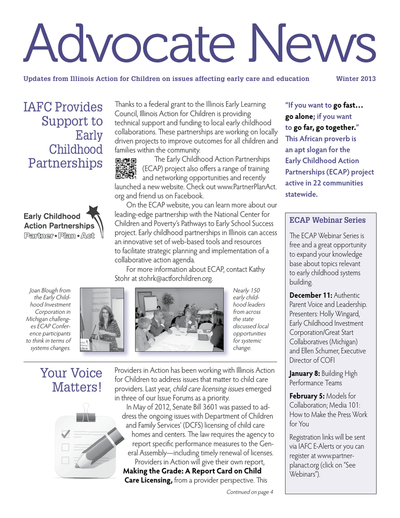 Advocate News Updates from Illinois Action for Children on issues affecting early care and education IAFC Provides Support to Early Childhood Partnerships Joan Blough from the Early Childhood Investment Corporation in Michigan challenges ECAP Conference participants to think in terms of systems changes. Your Voice Matters! Thanks to a federal grant to the Illinois Early Learning Council, Illinois Action for Children is providing technical support and funding to local early childhood collaborations. These partnerships are working on locally driven projects to improve outcomes for all children and families within the community. The Early Childhood Action Partnerships (ECAP) project also offers a range of training and networking opportunities and recently launched a new website. Check out www.PartnerPlanAct. org and friend us on Facebook. On the ECAP website, you can learn more about our leading-edge partnership with the National Center for Children and Poverty’s Pathways to Early School Success project. Early childhood partnerships in Illinois can a ccess an innovative set of web-based tools and resources to facilitate strategic planning and implementation of a collaborative action agenda. For more information about ECAP, contact Kathy Stohr at [email protected]. Nearly 150 early childhood leaders from across the state discussed local opportunities for systemic change. Providers in Action has been working with Illinois Action for Children to address issues that matter to child care providers. Last year, child care licensing issues emerged in three of our Issue Forums as a priority. In May of 2012, Senate Bill 3601 was passed to address the ongoing issues with Department of C hildren and Family Services’ (DCFS) licensing of child care homes and centers. The law r equires the agency to report s pecific performance measures to the General Assembly—including timely renewal of licenses. Providers in Action will give their own report, Making the Grade: A Report Card on Child Care Licensing, from a provider perspective. This Continued on page 4 Winter 2013 “If you want to go fast… go alone; if you want to go far, go together.” This African proverb is an apt slogan for the Early Childhood Action Partnerships (ECAP) project active in 22 communities statewide. ECAP Webinar Series The ECAP Webinar Series is free and a great opportunity to expand your knowledge base about topics relevant to early childhood systems building. December 11: Authentic Parent Voice and Leadership. Presenters: Holly Wingard, Early Childhood Investment Corporation/Great Start Collaboratives (Michigan) and Ellen Schumer, Executive Director of COFI January 8: Building High Performance Teams February 5: Models for Collaboration; Media 101: How to Make the Press Work for You Registration links will be sent via IAFC E-Alerts or you can register at www.partnerplanact.org (click on “See Webinars”). 2 Letter from the President Advocate News Dear Colleagues, When I last wrote in these pages, we were engaged in a fight against state budget cuts that threatened to decimate the Child Care Assistance Program and other critical elements of the human services safety net. Faced with a tremendous uphill battle to restore Child Care Assistance Program funding in Fiscal Year 2012 and mitigate more than $86 million in child care cuts for Fiscal Year 2013, we organized, advocated and demonstrated our power as a community like never before. Funding was restored, some of the most draconian cuts proposed for FY 2013 were defeated and we continued on with our work on behalf of children and families while knowing there are battles yet to come. With that in mind, I am thrilled to share with you the latest on one of our most exciting projects—Early Childhood Action Partnerships (ECAP). This innovative collaboration between Illinois Action for Children and community-based organizations throughout the state follows a simple but powerful capacity-building strategy—Partner, Plan, Act. Through the 22 grants awarded, partners from multiple sectors of the early childhood system will work on issues to solve problems across the early childhood system with a specific focus on improving outcomes for children from birth through kindergarten and their families. These grants are just one way that Illinois Action for Children is working throughout Illinois to maximize the positive impact the early care and education community can have on children and families. It is truly inspiring to know the passion and dedication that you put into your work every day. I am so proud of our efforts during last year’s state budget battle, and I know that together we will embrace the opportunities that allow us to be catalysts for organizing, developing and supporting strong families and powerful communities where children matter most. Sincerely, Maria Whelan, President and CEO, Illinois Action for Children Contents IAFC Provides Support to Early Childhood Partnerships . . . . . . . . . . . . . . . . 1 Your Voice Matters! . . . . . . . . . . . . . . . . . . . . . . . 1 Advocate News is published by Illinois Action for Children, 4753 N. Broadway, Suite 1200, Chicago, IL 60640. Illinois Action for Children is a catalyst for organizing, developing and supporting strong families and powerful communities where children matter most. To get involved, call (773) 697-6137 or e-mail [email protected]. Letter from the President . . . . . . . . . . . . . . . . . . . . . 2 Election Recap . . . . . . . . . . . . . . . . . . . . . . . . . . 3 High Quality Care for Illinois’ Infants and Toddlers: Be a Voice for Babies! . . . . . . . . . . . . . . . . . . . . . 3 Child Care Funding Review . . . . . . . . . . . . . . . . . . . 3 Research Corner: Providers as Resources for Parents . . . . . . . . . . . . . . . . . . . . 4 Advocate Spotlight: Coleen Moore . . . . . . . . . . . . . . 5 Winter 2013 Election Recap 33rd District Representative Marcus Evans reading to a Preschool for Al