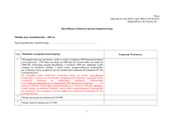 Wzór Załącznik nr 10 do SIWZ, znak: MWZ7-205-08-2015 Załącznik nr 5 do Umowy Nr ... Specyfikacja techniczna sprzętu komputerowego Mobilne kasy konduktorskie – 600 szt. Nazwa producenta i model/wersja: ………………………………………………… L.p. Minimalne wymagania Zamawiającego Propozycja Wykonawcy 1 Wymagania dotyczące procesora: wyniki w testach wydajności SPB Benchmark Indices (www.spb.com) – CPU Index nie mniej niż 3000 pkt, File System Index nie mniej niż 3000 Pkt. Zmawiający przyjął klasyfikację w wysokości 3000 pkt. zakładając wynik ustalany na podstawie średniej z trzech testów przeprowadzanych bezpośrednio po wykonaniu resetu urządzenia oraz bez podłączania urządzenia do komputera PC lub zewnętrznej sieci. W przypadku braku możliwości wykonania testów na stronie www.spb.com Zamawiający wskazuje na równorzędne oprogramowanie dotyczące wykonania testów wydajności procesora na urządzeniach mobilnych VSBenchmark www.mobuware.net/pocket-pc-os/vsbenchmark-2007-ppc-get-free-2258.html – nie mniej niż 3500 pkt, Zamawiający przyjął klasyfikację w wysokości 3500 pkt. zakładając wynik ustalany na podstawie średniej z trzech testów przeprowadzanych bezpośrednio po wykonaniu resetu urządzenia oraz bez podłączania urządzenia do komputera PC lub zewnętrznej sieci. 2 Pamięć operacyjna nie mniejsza niż 256 MB. 3 Pamięć stała nie mniejsza niż 512 MB. 1 4 Ekran dotykowy o wielkość nie mniejszej niż 3,5 cala oraz nie większej niż 4,0 cala. Ekran kolorowy o rozdzielczości nie mniejszej niż QVGA 240x320 lub 320x240 pikseli. 5 Waga nie przekraczająca 850 g wraz z zainstalowaną baterią. 6 Odporność terminala mobilnego na upadek z wysokości 1 m. 7 Odporność na wibracje występujące podczas jazdy pociągu. 8 Stacja dokująca lub zestaw ładowarek do mobilnej kasy konduktorskiej umożliwiająca ładowanie mobilnej kasy konduktorskiej, ładowanie dodatkowego akumulatora nie umieszczonego w mobilnej kasie konduktorskiej oraz umożliwiająca komunikację z komputerem klasy PC np. poprzez złącze USB. Wbudowany w mobilną kasę konduktorską moduł do zdalnego wysyłania danych przez konduktora, moduł co najmniej w standardzie HSDPA lub HSPA+, moduł WLAN oraz moduł Bluetooth w wersji co najmniej 2.0. 9 10 Moduł GPS do obliczania opóźnień pociągu w stosunku do bieżącej pozycji pociągu. Wbudowany i zintegrowany z urządzeniem moduł płatności będący czytnikiem kart magnetycznych oraz kart chipowych. 12 Wbudowany i zintegrowany z urządzeniem moduł lub funkcja modułu RFID/NFC umożliwiający dokonywanie płatności bezgotówkowych na terenie Europy, w tym Polski: 12.1 moduł obsługi kart stykowych - obsługa kart stykowych (chip i pasek magnetyczny) minimum organizacji płatniczych VISA i MasterCard, 12.2 moduł obsługi kart zbliżeniowych - obsługa minimum kart zbliżeniowych Visa payWave i MasterCard PayPass, 13 Wbudowany i zintegrowany z mobilną kasą konduktorską certyfikowany pin-pad, lub funkcja certyfikowanego pin-pada, połączony z urządzeniem np. złączem stykowym lub wbudowany w urządzenie jako wewnętrzna funkcja mobilnej kasy konduktorskiej. 14 czytnik kart zbliżeniowych umożliwiający obsługę kart procesorowych, kart Mifare oraz kart procesorowych z emulacją Mifare. 15 Zakres temperatury pracy w pociągu 0 C + 50 C. 11 16 Wbudowany i zintegrowany z urządzeniem skaner kodów 1D i 2D do odczytu kodów na biletach papierowych i elektronicznych. 2 17 18 Wbudowana w mobilną kasę konduktorską drukarka termiczna (monochromatyczna lub kolorowa) o szerokości wydruku min. 5 cm i max 8,56 cm umożliwiająca wydruk biletów Kolei Mazowieckich w sposób czytelny wraz z kodem 2D lub 1D (wybór dokonywany przez administratora systemu) nadrukowanym na bilecie. Co najmniej 2 sloty karty SAM 19 Co najmniej 1 slot SIM dedykowany do łączności poprzez APN Zamawiającego 20 Wewnętrzny czytnik kart pamięci SD lub miniSD lub microSD wbudowany w mobilną kasę Stanowisko obsługi gniazda konduktorskiego – 8 szt. Nazwa producenta i model/wersja: ………………………………………………… L.p. Parametry 1. W zakresie sprzętowym 1.1 Procesor 1.2 Pamięć RAM 1.3 Dysk twardy 1.4 Karta graficzna 1.5 Karta dźwiękowa Minimalne wymagania Zamawiającego procesor o wydajności nie gorszej niż 6550 pkt. w teście Passmark CPU-Mark (wyniki dostępne na stronie http://www.cpubenchmark.net) min. 4GB w technologii DDR 3 min. pojemność 500GB, 7200 obr./min z interfejsem Serial ATA karta graficzna o wydajności nie gorszej niż 3750 pkt. w teście 3DMark06 wbudowana karta dźwiękowa 3 Propozycja Wykonawcy 1.6 Napęd DVD+/-RW 1.7 Wbudowane porty 1.8 Obudowa min 6szt. USB 2.0 w tym 2szt z przodu obudowy, 4szt. USB 3.0, wejście mikrofonu oraz słuchawek, wyjście VGA oraz HDMI lub DisplayPort, złącze szeregowe Small Form Factor 2. W zakresie komunikacji 2.1 Karta sieciowa 3. W zakresie oprogramowania 3.1 System operacyjny 3.2 Inne 3.3 3.4 3.5 4. Ethernet pracująca w standardzie 10/100/1000 Mbps Gigabit Ethernet System operacyjny Microsoft Windows 7 Professional 64bit PL lub Windows 7 z możliwością upgrade do wersji Windows 8 Microsoft Windows 2012 CAL do podłączenia i pracy w środowisku Active Directory Pakiet biurowy Microsoft Office 2013 PL (Word, Excel, PowerPoint, Outlook) lub w pełni kompatybilny Oprogramowanie antywirusowe współpracujące z aplikacją McAfee ePolicy Orchestrator, subskrypcja minimum 3 lata Sterowniki do wszystkich urządzeń zamontowanych w oferowanym modelu komputera, zapewniając prawidłową ich pracę w środowisku zainstalowanego systemu operacyjnego. W zakresie zasilania 4 4.1 Zasilacz min. 240W o sprawności 90% z aktywnym stabilizatorem PFC Okres gwarancji (miesiące) 36 Inne Zestawy komputerowe musza być fabrycznie nowe 5. 5.1 6. 6.1 Zestawy komputerowe muszą pochodzić od tego samego producenta i być tego samego modelu Każdy zestaw 