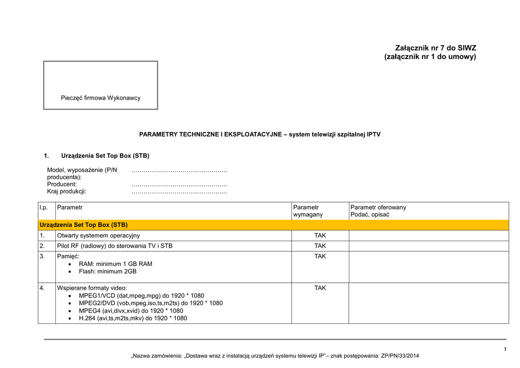 Załącznik nr 7 do SIWZ (załącznik nr 1 do umowy) Pieczęć firmowa Wykonawcy PARAMETRY TECHNICZNE I EKSPLOATACYJNE – system telewizji szpitalnej IPTV 1. Urządzenia Set Top Box (STB) Model, wyposażenie (P/N producenta): Producent: Kraj produkcji: l.p. ……………………………………….. ……………………………………….. ……………………………………….. Parametr Parametr wymagany Parametr oferowany Podać, opisać Urządzenia Set Top Box (STB) 1. Otwarty systemem operacyjny TAK 2. Pilot RF (radiowy) do sterowania TV i STB TAK 3. Pamięć: RAM: minimum 1 GB RAM Flash: minimum 2GB TAK 4. Wspierane formaty video: MPEG1/VCD (dat,mpeg,mpg) do 1920 * 1080 MPEG2/DVD (vob,mpeg,iso,ts,m2ts) do 1920 * 1080 MPEG4 (avi,divx,xvid) do 1920 * 1080 H.264 (avi,ts,m2ts,mkv) do 1920 * 1080 TAK 1 „Nazwa zamówienia: „Dostawa wraz z instalacją urządzeń systemu telewizji IP”– znak postępowania: ZP/PN/33/2014 VC-1/WMV do 1920 * 1080 RV8/9/10(rm, rmvb) do 1280 * 720 5. Wspierane formaty napisów: smi, srt, sub, ssa TAK 6. Wspierane formaty dźwięku: MP3, WMA, WAV, OGG, AAC TAK 7. Wspierane formaty obrazu: JPEG, BMP, GIF, PNG, TIFF TAK 8. Interfejsy wejściowe: IR (sensor podczerwieni) USB Ethernet 10/100M, Standard RJ45 TAK 9. Interfejsy wyjściowe: Audio (Stereo, S/PDIF: Coaxial) Video (HDMI minimum 1.3) TAK 10. Zasilacz w zestawie TAK 11. Musi umożliwiać zarządzanie z poziomu centralnego systemu pozwalające min. na: Ograniczenie głośności w porach nocnych Wysyłanie informacyjnych komunikatów tekstowych Instalowanie łat i uaktualnień oprogramowania Diagnostykę oraz zdalną konfigurację TAK 12. Możliwość montażu STB z tyłu telewizora TAK 2 „Nazwa zamówienia: „Dostawa wraz z instalacją urządzeń systemu telewizji IP”– znak postępowania: ZP/PN/33/2014 2. Cyfrowa stacja czołowa Model, wyposażenie (P/N producenta): Producent: Kraj produkcji: l.p. ……………………………………….. ……………………………………….. ……………………………………….. Parametr Parametr wymagany Parametr oferowany Podać, opisać Cyfrowa stacja czołowa 1. Dostępne gniazda pod karty i moduły: DVB-T DVB-S/S2 CAM TAK 2. Praca w architekturze IP opartej na transmisji unicast i multicast TAK 3. Stacja wyposażona w kartę lub karty DVB-T do odbioru wszystkich niekodowanych kanałów cyfrowej telewizji naziemnej TAK 4. Możliwość rozbudowy stacji o funkcjonalność odbioru kanałów satelitarnych poprzez dołożenie kart DVB-S/S2 (wolne sloty na odpowiednie karty muszą zostać zapewnione) TAK 5. Możliwość odbierania kodowanych kanałów telewizji naziemnej i satelitarnej Poprzez dołożenie modułów CAM (wolne sloty na karty/moduły muszą zostać zapewnione) TAK 6. Stacja czołowa musi mieć możliwość jednoczesnego obsadzenie jej przez karty DVB-T, DVB-S/S2 oraz moduły CAM, tak aby umożliwić jednoczesny odbiór kodowanych kanałów telewizji naziemnej i satelitarnej TAK 7. Obsługa jednocześnie minimum 500 urządzeń końcowych IP STB TAK 8. Oprogramowanie do zarządzania treścią oraz komunikacją z IP STB TAK 9. Obudowa: maks. Rack 19” 4U TAK 3 „Nazwa zamówienia: „Dostawa wraz z instalacją urządzeń systemu telewizji IP”– znak postępowania: ZP/PN/33/2014 3. System IPTV – oprogramowanie middleware Model, wyposażenie (P/N producenta): Producent: Kraj produkcji: l.p. Parametr ……………………………………….. ……………………………………….. ……………………………………….. Parametr wymagany Parametr oferowany Podać, opisać System IPTV – oprogramowanie middleware 1. Cyfrowa telewizja: Obsługa kanałów w jakości HD 1080p Elektroniczny przewodnik po programach (EPG) Płatne pakiety kanałów Obsługa ścieżek dźwiękowych i napisów wielojęzycznych TAK 2. Serwisy informacyjne: Kanał informacyjny o szpitalu Wysyłanie wiadomości do pojedynczego lub grupy STB Wyświetlanie ogłoszeń i reklamy TAK 3. Biblioteka multimedialna: Filmy na życzenie Możliwość stworzenia i udostępnienia biblioteki danych multimedialnych szpitala na wewnętrznych dyskach systemu IPTV lub na zewnętrznej wydzielonej powierzchni dyskowej TAK 4. Aplikacje: Gry (np. Angry Birds, Fruit Ninja) Serwisy społecznościowe (np. Facebook) Youtube, Ipla, TVN Player Radio internetowe Przeglądarka www TAK 5. Odtwarzanie pętli reklamowych, pasków informacyjnych na grupach dekoderów poprzez urządzenia STB TAK 6. Obsługa dodatkowych strumieni multimedialnych (kanał o szpitalu, podgląd z kamer rozmieszczonych na obiekcie, transmisja ważnych wydarzeń odbywających się na obiekcie na wybrane telewizory) TAK 4 „Nazwa zamówienia: „Dostawa wraz z instalacją urządzeń systemu telewizji IP”– znak postępowania: ZP/PN/33/2014 Oprogramowanie Middleware do zarządzania systemem IPTV 7. Musi zostać dostarczone ze wszystkimi niezbędnymi licencjami (jeżeli takie są potrzebne), do uruchomienia wymaganej funkcjonalności TAK 8. Możliwość udzielania sublicencji przez NSzW na korzystanie z aplikacji przez inny podmiot w ramach korzystania z Systemu TAK 9. Możliwość zarządzania kosztami osobno dla funkcjonalności: Telewizja, biblioteka multimedialna (VoD), aplikacje TAK 10. Musi umożliwiać centralne zarządzanie STB z podziałem na grupy, pozwalające min. na: • Ograniczenie głośności w porach nocnych • Wysyłanie informacyjnych komunikatów tekstowych • Instalowanie łat i uaktualnień oprogramowania • Diagnostykę oraz zdalną konfigurację STB TAK 11. Możliwość udostępniania usług w systemie przedpłat (pre-paid) TAK 12. Dostarczyć wraz z serwerem zarządzającym montowanym w szafie RACK 19”, max wysokość 1U. Parametry serwera zgodne z zalecanymi dla oprogramowania Middleware. Uwaga: Dopuszcza się zaoferowanie platformy sprzętowej oprogramowania Middleware bezpośrednio na stacji czołowej TAK 5 „Nazwa zamówienia: „