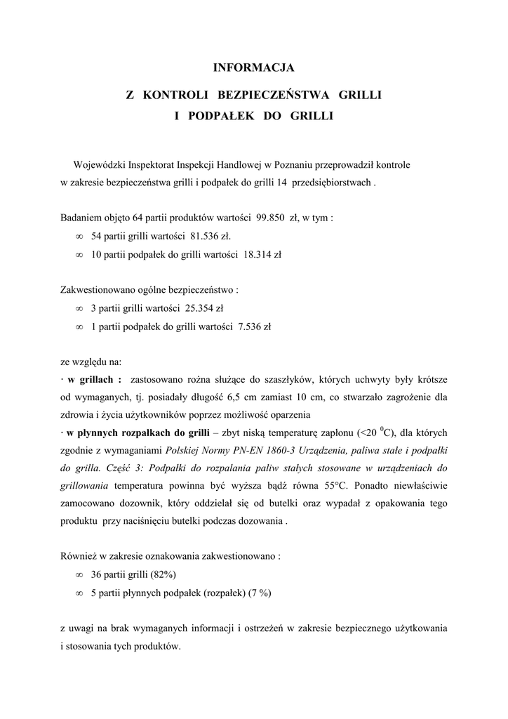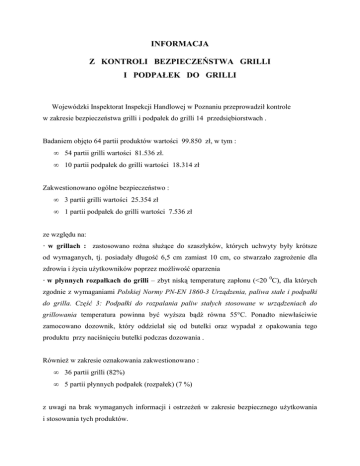 INFORMACJA Z KONTROLI BEZPIECZEŃSTWA GRILLI I PODPAŁEK DO GRILLI Wojewódzki Inspektorat Inspekcji Handlowej w Poznaniu przeprowadził kontrole w zakresie bezpieczeństwa grilli i podpałek do grilli 14 przedsiębiorstwach . Badaniem objęto 64 partii produktów wartości 99.850 zł, w tym : • 54 partii grilli wartości 81.536 zł. • 10 partii podpałek do grilli wartości 18.314 zł Zakwestionowano ogólne bezpieczeństwo : • 3 partii grilli wartości 25.354 zł • 1 partii podpałek do grilli wartości 7.536 zł ze względu na: · w grillach : zastosowano roŜna słuŜące do szaszłyków, których uchwyty były krótsze od wymaganych, tj. posiadały długość 6,5 cm zamiast 10 cm, co stwarzało zagroŜenie dla zdrowia i Ŝycia uŜytkowników poprzez moŜliwość oparzenia · w płynnych rozpałkach do grilli – zbyt niską temperaturę zapłonu (<20 0C), dla których zgodnie z wymaganiami Polskiej Normy PN-EN 1860-3 Urządzenia, paliwa stałe i podpałki do grilla. Część 3: Podpałki do rozpalania paliw stałych stosowane w urządzeniach do grillowania temperatura powinna być wyŜsza bądź równa 55°C. Ponadto niewłaściwie zamocowano dozownik, który oddzielał się od butelki oraz wypadał z opakowania tego produktu przy naciśnięciu butelki podczas dozowania . RównieŜ w zakresie oznakowania zakwestionowano : • 36 partii grilli (82%) • 5 partii płynnych podpałek (rozpałek) (7 %) z uwagi na brak wymaganych informacji i ostrzeŜeń w zakresie bezpiecznego uŜytkowania i stosowania tych produktów. 2 Podmiotowy i przedmiotowy zakres kontroli 1. Ogólne bezpieczeństwo produktów Ocenie w zakresie bezpieczeństwa produktów, w tym sprawdzeniu czy przedsiębiorca dołącza informacje i ostrzeŜenia niezbędne do bezpiecznego korzystania z wyrobu poddano 64 partii. Zakwestionowano 41 partii z tego : • 4 partii ze względu na znaczne prawdopodobieństwo, Ŝe produkty nie są bezpieczne, • 41 partii zł ze względu na brak lub niepełne informacje dotyczące ostrzeŜeń. 1.1. Ogólne bezpieczeństwo produktów - badania organoleptyczne i laboratoryjne A) Oceny bezpieczeństwa grilli Oceny bezpieczeństwa grilli dokonano poprzez przeprowadzenie badań organoleptycznych podczas których sprawdzono takŜe czy przedsiębiorcy dołączyli informacje i ostrzeŜenia niezbędne do bezpiecznego korzystania z tych wyrobów. Badaniem objęto 54 partii grilli kwestionując bezpieczeństwo 3 partii co dotyczyło grilli : • grill Berbeque art. nr 13 • grill Berbeque art. nr 14 • grill Berbeque art. nr 15 Stwierdzono, Ŝe w wyŜ. wym. grillach zastosowano roŜna słuŜące do szaszłyków, których uchwyty były krótsze od wymaganych, tj. posiadały długość 6,5 cm zamiast 10 cm, co stwarzało zagroŜenie dla zdrowia i Ŝycia uŜytkowników poprzez moŜliwość oparzenia. Przedsiębiorca wstrzymał sprzedaŜ kwestionowanych grilli , bowiem istnieje znaczne prawdopodobieństwo, Ŝe wyŜ. wym. produkty nie spełniają wymagań bezpieczeństwa . Pozostałe 51 partii grilli spełniało wymagania bezpieczeństwa, w których stwierdzono: • montaŜ i demontaŜ grilli walizkowych był moŜliwy według opisu podanego w instrukcjach obsługi albo bez pomocy narzędzi, albo za pomocą narzędzi dołączonych do urządzenia , 3 • krawędzie i naroŜa grilli dostępne podczas montaŜu, uŜytkowania i obsługi były gładkie, pozbawione zadziorów , • nakładane ręcznie ruszty na Ŝywność o długości największego boku do 400 mm były wyposaŜone w co najmniej w jeden uchwyt, natomiast ruszty o większych wymiarach (tj. o średnicy lub długości największego boku powyŜej 400 mm) były wyposaŜone w dwa uchwyty. Jeśli połoŜenie rusztu na Ŝywność było regulowane, to regulacja ta była moŜliwa bez bezpośredniego kontaktu ręki obsługującego z rusztem , • roŜna, w które były wyposaŜone grille posiadały końcówki o kształcie ściętego stoŜka o średnicy nie mniejszej niŜ 1,5 mm i nie przekraczającej 3 mm, długość uŜytkowa uchwytów wynosiła co najmniej 100 mm , • paleniska posiadały minimalną głębokość na ponad 80% swej powierzchni uŜytkowej. JeŜeli palenisko mogło pracować w kilku połoŜeniach, to było wyposaŜone w blokady zabezpieczające go w kaŜdym z tych połoŜeń, otwory w płaskiej podstawie paleniska były wyposaŜone w popielniki , • ruchome elementy stojaków składanych posiadały moŜliwość zablokowania w pozycji pracy grilli. Nie było moŜliwości niezamierzonego uruchomienia urządzeń słuŜących do blokowania i odblokowywania elementów ruchomych. Nie zachodziło podejrzenie, by grille uŜytkowane zgodnie z instrukcja obsługi mogły się przewracać lub mogła odpaść z nich jakaś część , • stojaki badanych grilli posiadały 3 lub 4 stabilnie osadzone nóŜki, w przypadku, gdy posiadały kółka przemieszczanie grilla następowało tylko po przyłoŜeniu siły i przy uŜyciu uchwytu, w który wyposaŜono grille tego typu . Nie zachodziła konieczność przeprowadzenia badań laboratoryjnych ocenianych organoleptycznie grilli. B) Ocena bezpieczeństwa płynnych podpałek - badania organoleptyczne i laboratoryjne Badania organoleptyczne Badaniem objęto 10 partii płynnych podpałek (rozpałek) do grilli. W odniesieniu do 9 partii stwierdzono, Ŝe podpałki (rozpałki) do grilli posiadały szczelne, nie uszkodzone opakowania bez śladów wycieku lub nasiąknięć, opakowania posiadały zamknięcia utrudniające ich 4 otwarcie przez dzieci, pojemniki z tworzywa były stabilne po ustawieniu na płaskiej powierzchni. Badania laboratoryjne W celu ustalenia czy płynne podpałki spełniają wymagania bezpieczeństwa w zakresie temperatury zapłonu przekazano 5 próbek o wartości 51 zł do badań w Laboratorium IH w Bydgoszczy. Próbki pobrano z 5 partii następujących podpałek: alkoholowej rozpałki do grilla i kominka 0,5 l , podpałki parafinowej do grilla 1 l piekielnie dobrej rozpałki 1 l piekie