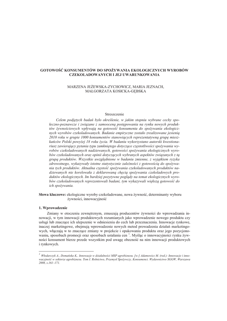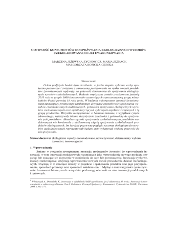 GOTOWO KONSUMENTÓW DO SPOYWANIA EKOLOGICZNYCH WYROBÓW CZEKOLADOWANYCH I JEJ UWARUNKOWANIA MARZENA JEŻEWSKA-ZYCHOWICZ, MARIA JEZNACH, MAŁGORZATA KOSICKA-GĘBSKA Streszczenie Celem podjtych bada było okrelenie, w jakim stopniu wybrane cechy społeczno-poznawcze i zwizane z samoocen postpowania na rynku nowych produktów ywnociowych wpływaj na gotowo konsumenta do spoywania ekologicznych wyrobów czekoladowanych. Badanie empiryczne zostało zrealizowane jesieni 2010 roku w grupie 1000 konsumentów stanowicych reprezentatywn grup mieszkaców Polski powyej 18 roku ycia. W badaniu wykorzystano autorski kwestionariusz zawierajcy pytania typu zamknitego dotyczce czstotliwoci spoywania wyrobów czekoladowanych nadziewanych, gotowoci spoywania ekologicznych wyrobów czekoladowanych oraz opinii dotyczcych wybranych aspektów zwizanych z t grup produktów. Wszystkie uwzgldnione w badaniu zmienne, z wyjtkiem ryzyka zdrowotnego, wykazywały istotne statystycznie zalenoci z gotowoci do spoywania tych produktów. Aktualna czsto spoywania czekoladowanych produktów nadziewanych nie korelowała z deklarowan chci spoywania czekoladowych produktów ekologicznych. Im bardziej pozytywne pogldy na temat ekologicznych wyrobów czekoladowanych reprezentowali badani, tym wykazywali wiksz gotowo do ich spoywania. Słowa kluczowe: ekologiczne wyroby czekoladowane, nowa ywno, determinanty wyboru ywnoci, innowacyjno 1. Wprowadzenie Zmiany w otoczeniu zewntrznym, zmuszaj producentów ywnoci do wprowadzania innowacji, w tym innowacji produktowych rozumianych jako wprowadzenie nowego produktu czy usługi lub znaczce ich ulepszenie w odniesieniu do cech lub przeznaczenia. Innowacje rynkowe, inaczej marketingowe, obejmuj wprowadzenie nowych metod prowadzenia działa marketingowych, włczaj w to znaczce zmiany w projekcie i opakowaniu produktu oraz jego pozycjonowaniu, sposobach promocji oraz sposobach ustalania cen 1. Mylc o innowacyjnoci rynku ywnoci konsument bierze przede wszystkim pod uwag obecno na nim innowacji produktowych i rynkowych. 1 Włodarczyk A., Domaska K,. Innowacje w działalnoci MSP agrobiznesu. [w:] Adamowicz M. (red.): Innowacje i innowacyjno w sektorze agrobiznesu. Tom I. Rolnictwo, Przemysł Spoywczy, Konsumenci. Wydawnictwo SGGW, Warszawa 2008, s.161–171. 232 Marzena Jeewska-Zychowicz, Maria Jeznach, Małgorzata Kosicka-Gbska Gotowo konsumentów do spoywania ekologicznych wyrobów czekoladowanych i jej uwarunkowania Zaangaowanie polskiego przemysłu spoywczego w badania i rozwój jest stosunkowo niedue, stanowi około 3,3% nakładów na t sfer przetwórstwa przemysłowego. W latach 2000–2005 wyroby nowe i zmodernizowane działu produkcja artykułów spoywczych stanowiły około 10% w sprzeday wyrobów ogółem (2000r. – 9,6%; 2005r. 11,1%)2. Niemniej jednak w literaturze przedmiotu mona znale stwierdzenia, e współczesny rynek ywnoci charakteryzuje si wysokim poziomem innowacyjnoci, co jest przede wszystkim konsekwencj rosncych i coraz bardziej zrónicowanych wymaga konsumentów3. Warto pamita, e na krajowym rynku ywnoci znajduj si nie tylko nowe produkty pochodzce z rodzimej produkcji, ale równie produkty z importu, co w istotnym stopniu modyfikuje lokalny rynek ywnoci i sprzyja wzrostowi innowacji na tym rynku. Okrelenie produktu znajdujcego si na rynku jako innowacji budzi szereg wtpliwoci, przede wszystkim ze wzgldu na zrónicowane sposoby definiowania takiego produktu. Za nowy produkt mona uzna taki, który po raz pierwszy jest oferowany na danym rynku i zaspokaja nowe potrzeby konsumentów lub w lepszy, doskonalszy sposób zaspokaja potrzeby ju istniejce. Poniewa produkt w marketingu jest rozumiany jako zbiór korzyci dla konsumenta, to zmiany wyraajce poziom nowoci mog dotyczy zarówno podstawowych funkcji produktu (np. wydajno, funkcjonalno), jak i funkcji dodatkowych (np. wygld, wygoda uytkowania, opakowanie)4. Uwzgldniajc czynnik czasu mona nowy produkt zdefiniowa okrelajc czas jego obecnoci na rynku. Moe to by produkt zupełnie oryginalny, zmodyfikowany bd usprawniony, który charakteryzuje si zmianami techniczno-technologicznymi, konkurencyjnoci oraz w wikszym stopniu zaspokaja dotychczasowe bd nowe potrzeby nabywców, oferowany w kanałach dystrybucji maksymalnie w okresie jednego roku od momentu wprowadzenia na rynek5. W innym ujciu uwzgldniajcym czynnik czasu zalecane jest stosowanie pojcia „nowy” wyłcznie do produktów, które dostpne s w sieci dystrybucji nie dłuej ni przez okres szeciu miesicy od wprowadzenia na rynek6. W definiowaniu nowego produktu wana jest równie perspektywa konsumenta. Zdaniem Kotlera i współpracowników7 nowym produktem jest produkt, który jest postrzegany przez odbiorców jako nowy, za innowacj produktow jest idea, produkt lub element technologii, które opracowuje si i oferuje klientom, uznajcym je za nowe i autorskie. Z subiektywizmu oceny nowoci wynika, e to co producent uwaa za nowe, nie musi znale potwierdzenia w opinii nabywców. Stopie innowacyjnoci produktów ywnociowych moe by zrónicowany. Nowoci na rynku ywnoci mog by tak samo klasyfikowane, jak kada inna grupa produktów. Niemniej jednak ze wzgldu na specyfik potencjalnych kierunków modyfikacji mona wyodrbni pi 2 Baczko T., Puchała-Krzywina E., Piekowska M., Innowacyjno przemysłu spoywczego – wyniki bada. [w:] Adamowicz M. (red.): Innowacje i innowacyjno w sektorze agrobiznesu. Tom I. Rolnictwo, Przemysł Spoywczy, Konsumenci. Wydawnictwo SGGW, Warszawa 2008, s.105–116. 3 Gutkowska K., Ozimek I., Wybrane aspekty zachowa konsumentów na rynku ywnoci – kryteria zrónicowania. Wydawnictwo SGGW, Warszawa 2005. s.12. 4 Matysik-Pejas R., Kształtowanie innowacyjnoci produktów ywnociowych poprzez sposób ich pakowania. Prace Naukowe AE we Wrocławiu. Nr 1116, Wrocław 2007, s.120. 5 Rutkowski I., Rozwój nowego produktu w przedsibiorstwach jako przedmiot bada. Marketing i Rynek, 2004, 5, s. 8. 6 Urbaniak M., Nowy produkt – wymyli czy kupi. Marketing w praktyce, 1999, 