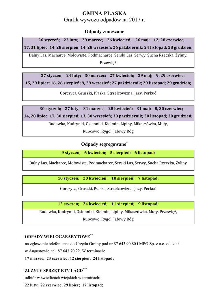 GMINA PŁASKA Grafik wywozu odpadów na 2017 r. Odpady zmieszane 26 styczeń; 23 luty; 29 marzec; 26 kwiecień; 26 maj; 12, 28 czerwiec; 17, 31 lipiec; 14, 28 sierpień; 14, 28 wrzesień; 26 październik; 24 listopad; 28 grudzień; Dalny Las, Macharce, Mołowiste, Podmacharce, Serski Las, Serwy, Sucha Rzeczka, Żyliny, Przewięź 27 styczeń; 24 luty; 30 marzec; 27 kwiecień; 29 maj; 9, 29 czerwiec; 15, 29 lipiec; 16, 26 sierpień; 9, 29 wrzesień; 27 październik; 29 listopad; 29 grudzień; Gorczyca, Gruszki, Płaska, Strzelcowizna, Jazy, Perkuć 30 styczeń; 27 luty; 31 marzec; 28 kwiecień; 31 maj; 8, 30 czerwiec; 14, 28 lipiec; 17, 30 sierpień; 13, 30 wrzesień; 30 październik; 30 listopad; 30 grudzień; Rudawka, Kudrynki, Osienniki, Kielmin, Lipiny, Mikaszówka, Muły, Rubcowo, Rygol, Jałowy Róg Odpady segregowane* 9 styczeń; 6 kwiecień; 5 sierpień; 6 listopad; Dalny Las, Macharce, Mołowiste, Podmacharce, Serski Las, Serwy, Sucha Rzeczka, Żyliny 10 styczeń; 20 kwiecień; 10 sierpień; 7 listopad; Gorczyca, Gruszki, Płaska, Strzelcowizna, Jazy, Perkuć 12 styczeń; 24 kwiecień; 11 sierpień; 9 listopad; Rudawka, Kudrynki, Osienniki, Kielmin, Lipiny, Mikaszówka, Muły, Przewięź, Rubcowo, Rygol, Jałowy Róg ODPADY WIELOGABARYTOWE** na zgłoszenie telefoniczne do Urzędu Gminy pod nr 87 643 90 80 i MPO Sp. z o.o. oddział w Augustowie, tel. 87 643 70 22. W terminach: 17 marzec; 23 czerwiec; 12 sierpień; 24 listopad; ZUŻYTY SPRZĘT RTV I AGD*** odbiór w świetlicach wiejskich w terminach: 22 luty; 22 czerwiec; 29 lipiec; 17 listopad; (* Segregacja odpadów PLASTIK SZKŁO MAKULATURA Należy wrzucać • plastikowe butelki bez nakrętek, • plastikowe opakowania po napojach i żywności • opakowania po kosmetykach, płynach do mycia i chemii gospodarczej • torebki foliowe, folie ze zgrzewek • • szkło opakowaniowe bez zamknięć i nakrętek, • butelki i słoiki po żywności i napojach, • opakowania po kosmetykach, • • • • • gazety i czasopisma, prospekty i katalogi, kartony i tektury, zużyte zeszyty i stare książki, papier biurowy i kserograficzny, • papier pakowny, • koperty, Nie należy wrzucać • • • • • • • • • • • • • • • • • • • opakowań po aerozolach, baterii, puszek po farbach, opakowań po olejach przemysłowych, silnikowych, płynach chłodniczych, styropianu, worków foliowych po śmieciach, ceramiki, porcelany i kryształów, szkła żaroodpornego, szkła okularowego, szkła okiennego, szyb samochodowych, luster, żarówek, świetlówek, lamp neonowych, kartonów po napojach, sokach i mleku, tapet, zabrudzonego, szczególnie zatłuszczonego papieru, pieluch i innych artykułów higienicznych, worków po cemencie, papieru faksowego, (** Do odpadów wielkogabarytowych należą: • • • • • stoły, krzesła i fotele, tapczany i łóżka, materace i pierzyny, szafy i regały oraz inne meble, opony o dopuszczalnej średnicy 90cm Do odpadów wielkogabarytowych nie należą: • • • • • • • • drewniane deski i belki, drzwi i ramy okienne, panele i płytki, wanny i umywalki, muszle toaletowe i spłuczki, grzejniki, odpady remontowe i ogrodowe, części samochodowe, motorowery, kosiarki i pilarki spalinowe, • sprzęt AGD i RTV, (*** Odbiór zużytego sprzętu AGD i RTV w świetlicach wiejskich w kolejności: 1. Dalny Las 8:00, 2. Płaska 8:40, 3. Mołowiste 9:00, 4. Gruszki 9:40, 5. Strzelcowizna 10:00, 6. Rubcowo 10:30, 7. Rudawka 11:00.
