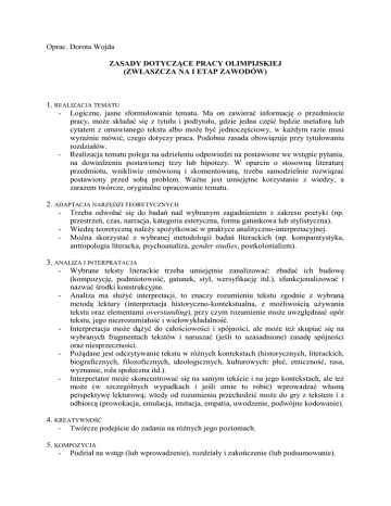 Oprac. Dorota Wojda ZASADY DOTYCZĄCE PRACY OLIMPIJSKIEJ (ZWŁASZCZA NA I ETAP ZAWODÓW) 1. REALIZACJA TEMATU - Logiczne, jasne sformułowanie tematu. Ma on zawierać informację o przedmiocie pracy, może składać się z tytułu i podtytułu, gdzie jedna część będzie metaforą lub cytatem z omawianego tekstu albo może być jednoczęściowy, w każdym razie musi wyraźnie mówić, czego dotyczy praca. Podobna zasada obowiązuje przy tytułowaniu rozdziałów. - Realizacja tematu polega na udzieleniu odpowiedzi na postawione we wstępie pytania, na dowiedzeniu postawionej tezy lub hipotezy. W oparciu o stosowną literaturę przedmiotu, wnikliwie omówioną i skomentowaną, trzeba samodzielnie rozwiązać postawiony przed sobą problem. Ważne jest umiejętne korzystanie z wiedzy, a zarazem twórcze, oryginalne opracowanie tematu. 2. ADAPTACJA NARZĘDZI TEORETYCZNYCH - Trzeba odwołać się do badań nad wybranym zagadnieniem z zakresu poetyki (np. przestrzeń, czas, narracja, kategoria estetyczna, forma gatunkowa lub stylistyczna). - Wiedzę teoretyczną należy spożytkować w praktyce analityczno-interpretacyjnej. - Można skorzystać z wybranej metodologii badań literackich (np. komparatystyka, antropologia literacka, psychoanaliza, gender studies, postkolonializm). 3. ANALIZA I INTERPRATACJA - Wybrane teksty literackie trzeba umiejętnie zanalizować: zbadać ich budowę (kompozycję, podmiotowość, gatunek, styl, wersyfikację itd.), sfunkcjonalizować i nazwać środki konstrukcyjne. - Analiza ma służyć interpretacji, to znaczy rozumieniu tekstu zgodnie z wybraną metodą lektury (interpretacja historyczno-kontekstualna, z możliwością używania tekstu oraz elementami overstanding), przy czym rozumienie może uwzględniać opór tekstu, jego niezrozumiałość i wielowykładalność. - Interpretacja może dążyć do całościowości i spójności, ale może też skupiać się na wybranych fragmentach tekstów i naruszać (jeśli to uzasadnione) zasadę spójności oraz niesprzeczności. - Pożądane jest odczytywanie tekstu w różnych kontekstach (historycznych, literackich, biograficznych, filozoficznych, ideologicznych, kulturowych: płeć, etniczność, rasa, wyznanie, rola społeczna itd.). - Interpretator może skoncentrować się na samym tekście i na jego kontekstach, ale też może (w szczególnych wypadkach i jeśli umie to robić) wprowadzać własną perspektywę lekturową; wtedy od rozumienia przechodzić może do gry z tekstem i z odbiorcą (prowokacja, emulacja, imitacja, empatia, uwodzenie, podwójne kodowanie). 4. KREATYWNOŚĆ - Twórcze podejście do zadania na różnych jego poziomach. 5. KOMPOZYCJA - Podział na wstęp (lub wprowadzenie), rozdziały i zakończenie (lub podsumowanie). - - - - - Zachowanie kompozycji dyskursywnej: teza (lub hipoteza), pytania, argumentacja, wnioskowanie cząstkowe, ostateczne konkluzje. Zachowanie kompozycji łańcuchowej – każdy rozdział kończy się podsumowaniem, z którego wynikają przesłanki do podjęcia takich, a nie innych rozważań w kolejnym rozdziale. Na początku spis treści. Wstęp ma zawierać: sformułowanie, objaśnienie i umotywowanie tematu, definicje kluczowych pojęć, przedstawienie obranej metody lekturowej, charakterystykę stosowanych narzędzi badawczych, rekapitulację dotychczasowych badań nad przedmiotem pracy, sformułowanie tezy (lub hipotezy) i kluczowych pytań, zapowiedź tematyki rozpatrywanej w poszczególnych rozdziałach. Rozdział ma zawierać: wprowadzenie do omawianych w nim treści, analizy oraz interpretacje, wnioski, zapowiedź tematyki kolejnego rozdziału. Zakończenie ma zawierać: zebranie wniosków cząstkowych ze wszystkich rozdziałów, potwierdzenie tezy (lub hipotezy), odpowiedzi na postawione we wstępie pytania, ewentualnie wskazanie otwierających się dalej możliwości badawczych. Bibliografia podzielona na: podmiotową, przedmiotową (tu osobno część zawierająca opracowania dotyczące omawianego pisarza, osobno część z pracami poświęconymi wybranej kategorii poetologicznej) oraz pomocniczą. Poprawne użycie formuł metatekstowych i dyskursywnych (wypada zacząć od; na wstępie przedstawię; przejdę teraz do; w tym rozdziale głównym przedmiotem będzie; zatrzymajmy się jednak przy itd.) 6. LOGIKA - Zachowanie porządku w strukturze argumentacji i wnioskowania. - Poprawne wydzielanie akapitów. - Logiczna, spójna budowa większych całości konstrukcyjnych, okresów zdaniowych oraz poszczególnych sformułowań. - Umotywowane użycie operatorów logicznych (więc, a jednak, ale, przecież, w takim razie, skoro, tym samym, chociaż itd.). - Poprawne użycie formuł dyskursywnych (dlatego za prawomocną uznaję tezę; kolejny argument przedstawia się następująco; można byłoby jednak kontrargumentować; wyprowadziłabym ostatecznie następujące konkluzje itd.) 7. STYL - Zgodny z zasadami dyskursu naukowego (budujący efekt obiektywności, jasny, logiczny, precyzyjny, pozbawiony wykładników emocji i kolokwializmów, zawierający profesjonalizmy, ze zdaniami wielokrotnie złożonymi, ale nie za długimi, zachowujący spójność pomiędzy kolejnymi zdaniami, pozbawiony tautacyzmów, amfibologii, anakolutów). - Poprawne użycie formuł modalnościowych (jestem przekonana, że; wahałabym się jednak, czy; z całą pewnością można więc wnioskować, że; przypuszczałabym raczej, iż itd.). - Poprawne użycie formuł wprowadzających cytaty (na potwierdzenie tej tezy można przytoczyć słowa X; jak czytamy w rozprawie X itd.). - Poprawne użycie formuł nawiązujących do innych wypowiedzi (Z wypowiedzi X wynika, że..., tymczasem..; polemizowałabym z wywodem X itd.). - Poprawne użycie formuł wprowadzających przykłady (oto przykłady potwierdzające postawioną tezę; dla ilustracji przedstawmy jeden z tekstów itd.). Można stosować elementy stylu literackiego, byle w sposób umotywowany, fortunny i w ograniczonym zakresie.