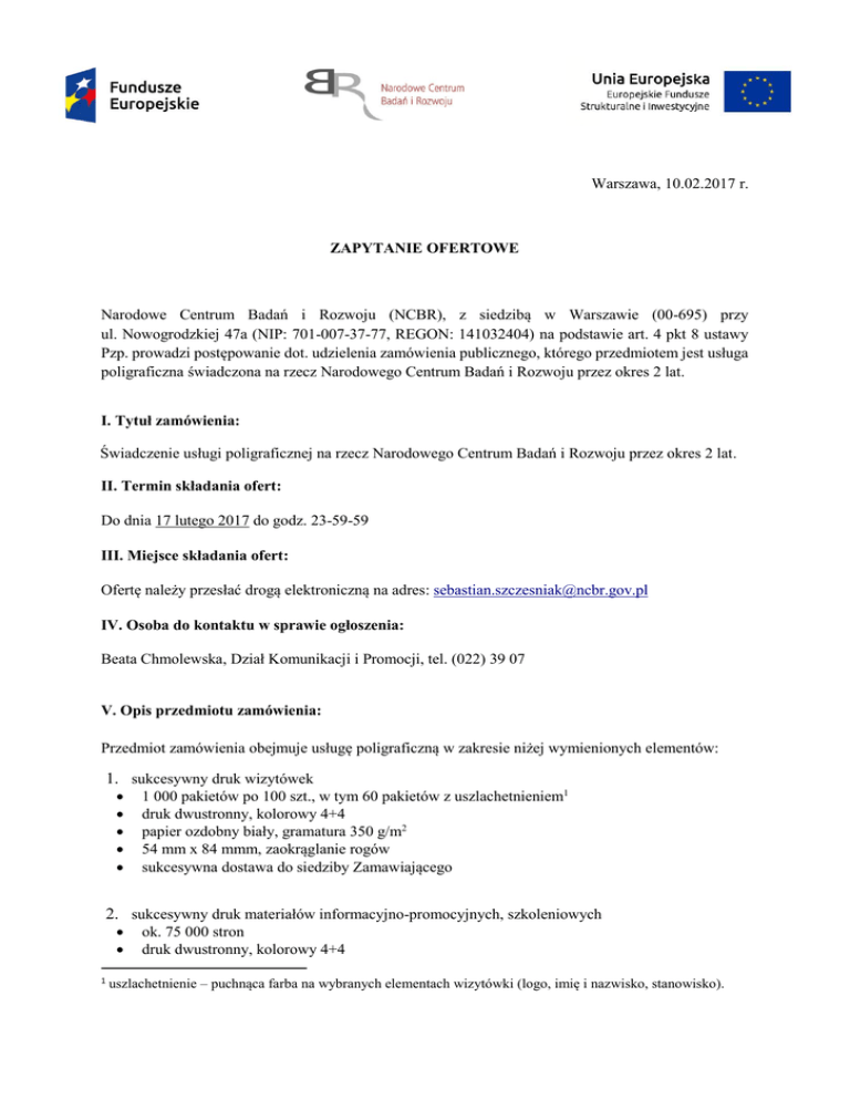 Warszawa, 10.02.2017 r. ZAPYTANIE OFERTOWE Narodowe Centrum Badań i Rozwoju (NCBR), z siedzibą w Warszawie (00-695) przy ul. Nowogrodzkiej 47a (NIP: 701-007-37-77, REGON: 141032404) na podstawie art. 4 pkt 8 ustawy Pzp. prowadzi postępowanie dot. udzielenia zamówienia publicznego, którego przedmiotem jest usługa poligraficzna świadczona na rzecz Narodowego Centrum Badań i Rozwoju przez okres 2 lat. I. Tytuł zamówienia: Świadczenie usługi poligraficznej na rzecz Narodowego Centrum Badań i Rozwoju przez okres 2 lat. II. Termin składania ofert: Do dnia 17 lutego 2017 do godz. 23-59-59 III. Miejsce składania ofert: Ofertę należy przesłać drogą elektroniczną na adres: [email protected] IV. Osoba do kontaktu w sprawie ogłoszenia: Beata Chmolewska, Dział Komunikacji i Promocji, tel. (022) 39 07 V. Opis przedmiotu zamówienia: Przedmiot zamówienia obejmuje usługę poligraficzną w zakresie niżej wymienionych elementów: 1. sukcesywny druk wizytówek 1 000 pakietów po 100 szt., w tym 60 pakietów z uszlachetnieniem1 druk dwustronny, kolorowy 4+4 papier ozdobny biały, gramatura 350 g/m2 54 mm x 84 mmm, zaokrąglanie rogów sukcesywna dostawa do siedziby Zamawiającego 2. sukcesywny druk materiałów informacyjno-promocyjnych, szkoleniowych 1 ok. 75 000 stron druk dwustronny, kolorowy 4+4 uszlachetnienie – puchnąca farba na wybranych elementach wizytówki (logo, imię i nazwisko, stanowisko). papier biały, laserowy 100 g/m2 oprawa klejona (okładka na papierze 250 g/m2, wykończenie folią matową lub błyszczącą) lub bindowanie – ok. 2500 egz. dostawa do wskazanego przez klienta miejsca na terenie centrum Warszawy – ok. 30 razy w czasie trwania umowy. 3. Sukcesywny druk materiałów szkoleniowych – prezentacji ok. 40 000 stron druk dwustronny, kolorowy 4+4 papier biały, laserowy 80 g/m2 zszywanie na 1 zszywkę lub bindowanie – 2 000 egz. dostawa do wskazanego przez klienta miejsca na terenie centrum Warszawy – ok. 20 razy w czasie trwania umowy. 4. sukcesywny druk ulotek, zaproszeń każdy format po 1000 szt. format DL (1/3 A4) A4 bez składania A5 składany do A6 A4 składany do A5 druk dwustronny, kolorowy 4+4 papier biały, kreda 200 g/m2 dostawa do siedziby Zamawiającego – ok. 20 razy w czasie trwania umowy. 5. sukcesywny druk plakatów 60 szt. format B3 (340 x 480) druk jednostronny, kolorowy 4+0 papier biały, kreda min. 170 g/m2 tuba ok. 10 szt. dostawa do siedziby Zamawiającego – ok. 10 razy w czasie trwania umowy. 6. sukcesywny druk bloczków 60 szt. format A6 60 szt. format A5 100 stron każdy + tylna okładka druk jednostronny, kolorowy 4+0 papier biały, 80 g/m2 klejony od góry, krótszy bok + tylna okładka dostawa do siedziby Zamawiającego – ok. 10 razy w czasie trwania umowy. VI. Inne istotne warunki zamówienia: 1. Dostępność wszystkich usług 24h/7, 2. Czas realizacji zamówienia max 24 h. od momentu akceptacji projektu drogą elektroniczną w przypadku druku offsetowego, w przypadku druku cyfrowego po akceptacji wydruku próbnego lub projektu drogą elektroniczną. Odstępstwo od ww. czasu realizacji dopuszczamy jedynie w odniesieniu do wizytówek z uszlachetnieniem oraz plakatów z uwagi na konieczność zakupu tub. Maksymalny termin realizacji wspomnianych zamówień – do 10 dni roboczych. VII. Miejsce realizacji zamówienia: Polska VIII. Cel zamówienia: Przedmiotem niniejszego zamówienia jest sukcesywne świadczenie usług poligraficznych oraz dostawy materiałów informacyjno-promocyjnych, szkoleniowych, ulotek, plakatów konicznych do realizacji Programu Operacyjnego Inteligentny Rozwój, Programu Operacyjnego Wiedza Edukacja Rozwój oraz Programu Operacyjnego Polska Cyfrowa oraz wizytówek i bloczków wykorzystywanych na potrzeby pracowników Narodowego Centrum Badań i Rozwoju. IX. Kod CPV 22000000-0 - Druki i produkty podobne 22100000-1 - Drukowane książki, broszury i ulotki 22458000-5 - Pozostałe druki 22900000-9 - Różne druki 79800000-2 - Usługi drukowania i powiązane 79810000-5 - Usługi drukowania 79811000-2 – Usługi drukowania cyfrowego 79820000-8 - Usługi związane z drukowaniem 79823000-9 - Usługi drukowania i dostawy X. Kryteria oceny ofert i sposób przyznawania punktów: L.p. Kryterium Waga Punkty 1 Cena 90 % 90 2 Kryterium społeczne 10 % 10 Zamawiający oceni oferty, przyznając punkty w ramach poszczególnych kryteriów oceny ofert, przyjmując zasadę, że 1% = 1 punkt. Zamawiający dokona wyliczenia punktów dla danej oferty, za każde kryterium, z dokładnością do dwóch miejsc po przecinku i wybierze ofertę z najwyższą liczbą punktów ogółem, spośród ofert niepodlegających odrzuceniu, stosując poniższe zasady: 1. Punkty za kryterium „Cena” zostaną obliczone dla każdej z ofert wg wzoru: Cena brutto oferty najtanszej × 90 = liczba punktów Cena brutto oferty badanej Wykonawca za kryterium cena może uzyskać maksymalnie 90 punktów. 2. Punkty za kryterium społeczne „Odsetek osób zatrudnionych przez Wykonawcę na umowę o pracę, na dzień składania oferty” 5 pkt – gdy odsetek osób zatrudnionych na umowę o pracę na dzień składania oferty wynosi 33 % ÷ 66% 10 pkt – gdy odsetek osób zatrudnionych na umowę o pracę na dzień składania oferty wynosi 67% ÷ 100 % Wykonawca za powyższe kryterium może uzyskać maksymalnie 10 punktów. Ocena końcowa oferty stanowić będzie sumę z oceny przyznanej w kryterium pozacenowym oraz punktów uzyskanych w kryterium cena. Za najkorzystniejszą zostanie uznana oferta, która uzyska najwyższą liczbę punktów. Punkty ogółem = Punkty za kryterium „Cena” + Punkty za kryterium społeczne „Odsetek osób zatrudnionych przez Wykonawcę na umowę o pracę” Dodatkowe informacje: Cena ma być wyrażona w złotych polskich z uwzględnieniem należnego podatku VAT. Cenę oferty należy podać z dokładnością do dwóch miejsc po przecinku (zł/gr). Cena oferty powinna obejmować pełny zakres prac określonyc