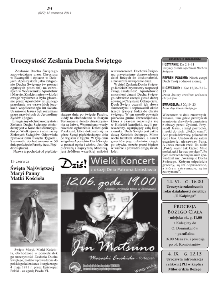 21 1 (527) 12 czerwca 2011 Uroczystość Zesłania Ducha Świętego Zesłanie Ducha Świętego zapowiedziane przez Chrystusa w Ewangelii i opisane w Dziejach Apostolskich jako zstąpienie Ducha Świętego (w postaci ognistych płomieni) na zebranych w Wieczerniku Apostołów i Maryję. Znakiem niezwykłości owego wydarzenia było głoszenie przez Apostołów religijnego przesłania we wszystkich językach współczesnego im świata. Uczniowie Jezusa byli rozumiani przez przybyłych do Jerozolimy Żydów i pogan. Liturgiczny obchód uroczystości Zesłania Ducha Świętego obchodzony jest w Kościele siedem tygodni po Wielkiejnocy i nosi nazwę Zielonych Świątków. Odpowiada żydowskiemu Świętu Tygodni, Szawuoth, obchodzonemu w 50 dniu po święcie Paschy (tzw. Pięćdziesiątnica). Nazwa ta pochodzi od pięćdzie- 13 czerwca Święto Najświętszej Maryi Panny Matki Kościoła siątego dnia po święcie Paschy, kiedy to obchodzono w Starym Testamencie święto dziękczynienia za żniwa. Wspominano wtedy również ogłoszenie Dziesięciu Przykazań, które dokonało się na górze Synaj pięćdziesiątego dnia po wyjściu z Egiptu. W tym dniu zstąpił na Apostołów Duch Święty w postaci ognia i wichru. Jest On pierwszą i najwyższą Miłością, jest źródłem wszelkiej miłości Dziś! w stworzeniach. Duchowi Świętemu przypisujemy doprowadzenie dzieł Bożych do doskonałości, a zwłaszcza uświęcenie dusz. W dzień Zesłania Ducha Świętego Kościół Chrystusowy rozpoczął swoją działalność. Apostołowie umocnieni darami Ducha Świętego odważnie zaczęli głosić dobrą nowinę o Chrystusie Odkupicielu. Duch Święty uczynił ich słowa skutecznymi i doprowadził około trzech tysięcy ludzi do chrztu świętego. W ten sposób powstała pierwsza gmina chrześcijańska, która z czasem rozwinęła się w Kościół katolicki, czyli powszechny, ogarniający całą kulę ziemską. Duch Święty jest jakby duszą Kościoła świętego. Mimo wielu ludzkich słabości, a nawet grzechów jego członków, ciągle go ożywia, strzeże przed błędem w wierze i prowadzi drogą światłości. VIII NIEDZIELA WIELKANOCNA I CZYTANIE: Dz 2,1–11 Wszyscy zostali napełnieni Duchem Świętym REFREN PSALMU: Niech zstąpi Duch Twój i odnowi ziemię. II CZYTANIE: 1 Kor 12,3b–7.12– 13 Duch Święty źródłem jedności chrześcijan EWANGELIA: J 20,19–23 Jezus daje Ducha Świętego Wieczorem w dniu zmartwychwstania, tam gdzie przebywali uczniowie, drzwi były zamknięte z obawy przed Żydami. Przyszedł Jezus, stanął pośrodku, i rzekł do nich: „Pokój wam!”. A to powiedziawszy, pokazał im ręce i bok. Uradowali się zatem uczniowie, ujrzawszy Pana. A Jezus znowu rzeki do nich: „Pokój wam! Jak Ojciec Mnie posłał, tak i Ja was posyłam”. Po tych słowach tchnął na nich i powiedział im: „Weźmijcie Ducha Świętego. Którym odpuścicie grzechy, są im odpuszczone, a którym zatrzymacie, są im zatrzymane”. 14. VI. g. 16.00 Uroczyste zakończenie roku działalności świetlicy „U Kolpinga” Procesja Bożego Ciała - miejska ok. g. 11.00 z Kolegiaty do O. Dominikanów - parafialna 16.00 Msza św. i procesja po oś. Kombatantów Święto Maryi, Matki Kościoła, obchodzone w poniedziałek po uroczystości Zesłania Ducha Świętego, zostało wprowadzone do polskiego kalendarza liturgicznego 4 maja 1971 r. przez Episkopat Polski - za zgodą Pawła VI. 4. IX. g. 12.15 Uroczysta intronizacja relikwii JPII w kaplicy Miłosierdzia Bożego Chrystus Królem Cenne myśli ze Święta Dziękczynienia Radość dla Kościoła Neoprezbiter z parafii NMP Królowej Polski Jan Paweł II i Kard. S. Wyszyński mają nam jeszcze i dziś parę spraw do przekazania. Po pierwsze, że Kościół jest i ma być ojcem dla wszystkich bez utożsamiania się z jakąkolwiek grupą, partią czy orientacją. Jego misją jest przekaz wiary we współczesnej rzeczywistości, którą trzeba przenikać Ewangelią i przykładać jednakową miarę do wszystkiego i wszystkich. Urząd pasterski, to wskazywanie dróg ale i ocena rzeczywistości, przestrzeganie i upominanie. Z niepokojem patrzymy na chorobliwe podziały wśród różnych orientacji. Są one tak dalekie i niepokojące, że znieważa się najwyższe autorytety, że doszło do morderstwa politycznego niewinnego człowieka, ale z drugiej strony także źle jest jeśli brak woli pojednania i nawet obecność w kościele bywa kwalifikowana partyjnie czy politycznie. Niedopuszczalne jest deptanie bohaterów historii i upolitycznianie świętych symboli, choćby krzyża, bo to jest symbol święty i nie wolno się nim posługiwać do uzyskania przewagi nad drugą stroną. Różnica zdań jest dopuszczalna, nienawiść, wrogość - nigdy! Abp Józef Michalik /fragm. kazania/ Rok temu ks. Łukasz Piróg otrzymał święcenia diakonatu a w dniu wczorajszym dostąpił godności prezbitera - czyli katolickiego księdza. Cieszy się parafia NMP Królowej Polski, ale również i nasi parafianie, zwłaszcza ci, którzy pamiętają ks. Łukasza jako wieloletniego animatora i lektora Ruchu Światło-Życie. Polecajmy go w naszych modliNiebawem wyruszy na pątniczy szlak ku Jasnej Górze XXXI Prze- twach. myska Piesza Pielgrzymka. Hasło tegorocznych rekolekcji - „Z Maryją zakorzenieni w Bogu”. Podczas tegorocznej pielgrzymki, wpatrując się w Bożą Miłość, będziemy się starać odnowić lub nawiązać na nowo naszą więź z Bogiem. Pragniemy iść w pielgrzymim trudzie ku Jasnej Górze w świetle nauczania bł. Jana Pawła II. Zapraszamy starszych i młodych do wspólnego przeżycia rekolekcji w drodze. Pielgrzymka odbędzie się w terminie od 4-15 lipca. Na pielgrzymi szlak z Jarosławskiego Opactwa wyruszymy 5 lipca. W czasie pielgrzymki będziemy dziękować także za Jubileusz 50 - lecia kapłaństwa ks. Prałata Mariana Rajchla długoletniego pielgrzyma. Zapisy na pielgrzymkę trwają do 29 czerwca. Każdy pątnik zapisuje się w s