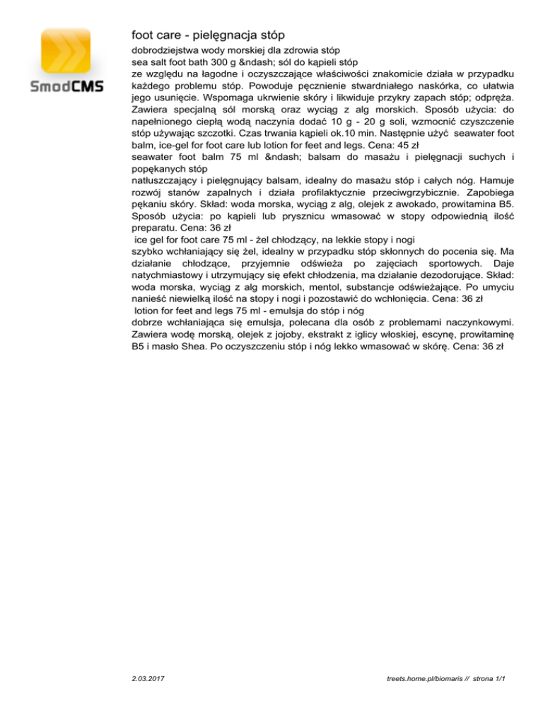 foot care - pielęgnacja stóp dobrodziejstwa wody morskiej dla zdrowia stóp sea salt foot bath 300 g – sól do kąpieli stóp ze względu na łagodne i oczyszczające właściwości znakomicie działa w przypadku każdego problemu stóp. Powoduje pęcznienie stwardniałego naskórka, co ułatwia jego usunięcie. Wspomaga ukrwienie skóry i likwiduje przykry zapach stóp; odpręża. Zawiera specjalną sól morską oraz wyciąg z alg morskich. Sposób użycia: do napełnionego ciepłą wodą naczynia dodać 10 g - 20 g soli, wzmocnić czyszczenie stóp używając szczotki. Czas trwania kąpieli ok.10 min. Następnie użyć seawater foot balm, ice-gel for foot care lub lotion for feet and legs. Cena: 45 zł seawater foot balm 75 ml – balsam do masażu i pielęgnacji suchych i popękanych stóp natłuszczający i pielęgnujący balsam, idealny do masażu stóp i całych nóg. Hamuje rozwój stanów zapalnych i działa profilaktycznie przeciwgrzybicznie. Zapobiega pękaniu skóry. Skład: woda morska, wyciąg z alg, olejek z awokado, prowitamina B5. Sposób użycia: po kąpieli lub prysznicu wmasować w stopy odpowiednią ilość preparatu. Cena: 36 zł ice gel for foot care 75 ml - żel chłodzący, na lekkie stopy i nogi szybko wchłaniający się żel, idealny w przypadku stóp skłonnych do pocenia się. Ma działanie chłodzące, przyjemnie odświeża po zajęciach sportowych. Daje natychmiastowy i utrzymujący się efekt chłodzenia, ma działanie dezodorujące. Skład: woda morska, wyciąg z alg morskich, mentol, substancje odświeżające. Po umyciu nanieść niewielką ilość na stopy i nogi i pozostawić do wchłonięcia. Cena: 36 zł lotion for feet and legs 75 ml - emulsja do stóp i nóg dobrze wchłaniająca się emulsja, polecana dla osób z problemami naczynkowymi. Zawiera wodę morską, olejek z jojoby, ekstrakt z iglicy włoskiej, escynę, prowitaminę B5 i masło Shea. Po oczyszczeniu stóp i nóg lekko wmasować w skórę. Cena: 36 zł 2.03.2017 treets.home.pl/biomaris // strona 1/1