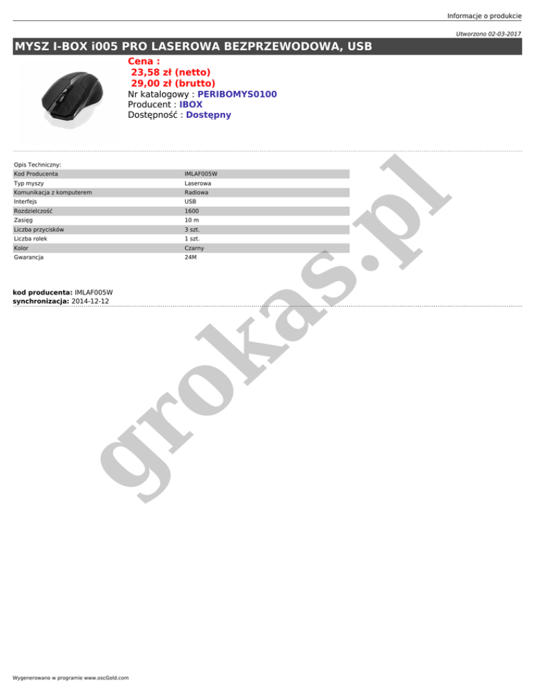 Informacje o produkcie Utworzono 02-03-2017 MYSZ I-BOX i005 PRO LASEROWA BEZPRZEWODOWA, USB Cena : 23,58 zł (netto) 29,00 zł (brutto) Nr katalogowy : PERIBOMYS0100 Producent : IBOX Dostępność : Dostępny IMLAF005W Typ myszy Laserowa Komunikacja z komputerem Radiowa Interfejs USB Rozdzielczość 1600 Zasięg 10 m Liczba przycisków 3 szt. Liczba rolek 1 szt. Kolor Czarny Gwarancja 24M gr ok kod producenta: IMLAF005W synchronizacja: 2014-12-12 as Kod Producenta Wygenerowano w programie www.oscGold.com .p l Opis Techniczny: