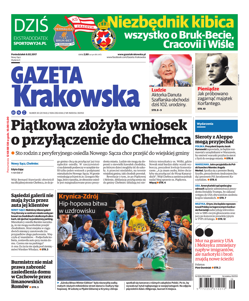 Niezbędnik kibica DZIŚ wszystko o Bruk-Becie, Cracovii i Wiśle EKSTRADODATEK SPORTOWY24.PL Poniedziałek 6.02.2017 cena 2,80 (w tym 8% VAT) www.gazetakrakowska.pl www.facebook.com/Gazeta.Krakowska FOT. ARCHIWUM FOT. BARTOSZ KRUPA/EAST NEWS Nowy Sącz Wydanie E Ludzie Aktorka Danuta Szaflarska obchodzi dziś 102. urodziny. Pieniądze Jak próbowano zagarnąć majątek Korfantego. STR. 8 – 9 STR. 10 Piątkowa złożyła wniosek o przyłączenie do Chełmca Wydarzenia Sieroty z Aleppo mogą przyjechać POLSKA. Prezydent Sopotu Jacek Karnowski zapowiada, że będzie rozmawiał z urzędnikami w Warszawie, by omówić warunki przybycia sierot z Syrii do swojego miasta. a STR. 6 A Sto rodzin z peryferyjnego osiedla Nowego Sącza chce przejść do wiejskiej gminy Nowy Sącz, Chełmiec Edyta Zając [email protected] Wójt Bernard Stawiarski obwieścił na oficjalnej stronie Chełmca, że do je- Sąsiedzi galerii nie mają życia przez auta jej klientów NOWY SĄCZ. Niektórzy klienci galerii Trzy Korony w centrum miasta wolą parkować na chodnikach i okolicznych uliczkach, niż zjechać na podziemny parking. Mieszkańcy osiedla Barskie narzekają, że nie mogą swobodnie przejść chodnikiem. Straż miejska w ciągu dwóch miesięcy zanotowała 214 przypadków złego parkowania. Wręczyła 47 mandatów. – Podjechała kobieta, zostawiła auto przy moim domu. Czemu nie na parkingu? A ona: Za życia nie zjadę pod ziemię – mówi Wiesław Włodarz. a STR. 3 Burmistrz nie miał prawa zabronić zasiedlenia domu w Czchowie przez limanowskich Romów a STR. 5 go gminy chcą się przyłączyć już trzy sądeckie osiedla. W rzeczywistości na dziennik podawczy w urzędzie trafił tylko jeden wniosek z podpisami mieszkańców Nowego Sącza. W gronie wnioskujących jest m.in. Grzegorz Malaga, który narzeka, że obrzeżne osiedle jest marginalizowane przez prezy- denta miasta. Ludzie nie mogą się doprosić o niewielki kawałek chodnika, po którym dzieci mogłyby iść do szkoły. A przecież niedaleko, na terenie wiejskiej gminy, taki chodnik powstał. Rewelacje o tym, że po Piątkowej i Helenie, deklarację przyłączenia się do gminy Chełmiec składają też nie- którzy mieszkańcy os. Wólki, gdzie Nowak miał bardzo słaby wynik wyborczy, prezydent kwituje komentarzem: „A ja znam osoby, które chciałyby się przyłączyć do Wysp Kanaryjskich”. Wójt Chełmca zamierza jednak nadać bieg sprawie os. Piątkowa. Więcej a STR. 4 WARSZAWA. Jutro przyjeżdża do Polski kanclerz Niemiec Angela Merkel. Spotka się z premier Beatą Szydło, prezydentem Andrzejem Dudą i prezesem PiS Jarosławem Kaczyńskim. a STR. 6 USA. Amerykański sąd apelacyjny odrzucił żądanie administracji prezydenta Donalda Trumpa, by zakazać wstępu do USA obywatelom siedmiu krajów islamskich. a STR. 7 Krynica-Zdrój Hip-hopowa bitwa w uzdrowisku MUZYKA. O tym, kto będzie reprezentował Polskę na tegorocznym konkursie Eurowizji zadecydują telewidzowie w SMS-owym głosowaniu oraz jury po koncercie preselekcyjnym w TVP1 18 lutego. a STR. 12 Mur na granicy USA i Meksyku zmniejszy napływ imigrantów, ale narkotyki i broń znajdą nowe ścieżki FOT. KATARZYNA GAJDOSZ Prenumerata 12 68 88 138 w godz. 10.00-15.00 NUMER 30 (20 944) // ISSN 2353-6144 // NR INDEKSU 35015X b „„ Górska Bitwa Winter Edition” była niezwykłą walką małych i dużych miłośników street dance’u i kultury hiphopowej. W sobotę w Pijalni Głównej w Krynicy-Zdroju spotkali się tancerze z różnych zakątków Polski. Po to, by wywalczyć tytuł najlepszego w swojej kategorii. Na zdjęciu pięcioletni Adaś z Biłgoraja, laureat II miejsca. Felieton Piotr Dominiak a STR. 2 Nr ISSN 2353-6144 Nr indeksu 35015X 04// Nowy Sącz Gazeta Krakowska Poniedziałek, 6 lutego 2017 www.gk.pl Miastowi chcieliby do wójta W skrócie A Wójt Chełmca: mieszkańcy 3 sądeckich osiedli chcą przyłączenia do naszej gminy A Prezydent Nowego Sącza, ze śmiechem: znam takich, co chcą do Wysp Kanaryjskich Edyta Zając [email protected] Na linii Chełmiec-Nowy Sącz jest wyczuwalne napięcie. Wójt gminy i prezydent miasta oficjalnie zarzucają sobie błędy i niekompetencję. Wójt Bernard Stawiarski wytyka prezydentowi Ryszardowi Nowakowi, że mieszkańcy granicznych osiedli Nowego Sącza i Chełmca, czyli Heleny i Piątkowej, mają dość jego nieudolnych rządów. Teraz na dziennik podawczy urzędu jego gminy wpłynął oficjalny dokument od mieszkańców os. Piątkowa, którzy chcą przyłączyć się do wsi Piątkowa w Chełmcu. – Jak zatem widać, deklaracje oderwania osiedla nie była tylko chwilową sensacją medialną. Niemal setka mieszkańców, podając swoje imię nazwisko, jednoznacznie się zadeklarowała – podkreśla Stawiarski. Dodaje, że rozumie desperację ludzi; również jego zdaniem Nowak rządzi nieudolnie. Gotowy do „przeprowadzki” na wieś jest Grzegorz Mala- W mieście mamy wioskę Ci, którzy podpisali się pod dokumentem narzekają, że żyją jak w średniowieczu. W granicznej części osiedla, po miejskiej stronie, nie ma wody, ani kanalizacji. – Musieliśmy wywiercić sobie studnie. Nie marzy nam się nie wiadomo co, chodzi o podstawowe inwestycje, żebyśmy mogli godnie żyć! – domaga się Adam Szołdrowski. Tomasz Fałowski, sołtys Piątkowej przypomina, że niedawno Ryszard Nowak zapraszał do miejskich szkół zwol- Prezydent chce zadbać o dzieci z Chełmca? Niech najpierw zadba o te z Nowego Sącza REKLAMA 017099379 najpopularniejszy WIEC 2016 SPORTO Mieszkańcy bloku przy ul. Limanowskiego zdążyli przed przyjazdem strażaków wydostać z zadymionego mieszkania ok. 30-letnią kobietę. Trafiła do szpitala. W jej mieszkaniu wybuchł pożar. Z mieszkania znajdującego się nad pomieszczeniem, w którym pojawił się ogień, strażacy musieli ewakuować trzy osoby, w tym dziecko. Pozostali lokatorzy bloku sami opuścili mieszkania. Prawdopodobną przyczyną pojawienia się ognia było zwarcie in