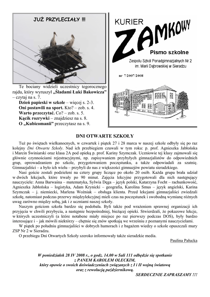 JUŻ PRZYLECIAŁY !!! Te bociany widzieli uczestnicy tegorocznego rajdu, który wyruszył „Śladami Łuki Bakowicza” – czytaj na s. 7. Dzień papieski w szkole – więcej s. 2-3. Oni postawili na sport. Kto? – zob. s. 4. Warto przeczytać. Co? – zob. s. 5. Kącik rozrywki – znajdziesz na s. 8. O „Kubicomanii” przeczytasz na s. 9. DNI OTWARTE SZKOŁY Tuż po świętach wielkanocnych, w czwartek i piątek 27 i 28 marca w naszej szkole odbyły się po raz kolejny Dni Otwarte Szkoły. Nad ich przebiegiem czuwali w tym roku: p. prof. Agnieszka Jabłońska i Marcin Świniarski oraz klasa 2A pod opieką p. prof. Kariny Szymczak. Uczniowie tej klasy zajmowali się głównie czynnościami rejestracyjnymi, np. zapisywaniem przybyłych gimnazjalistów do odpowiednich grup, oprowadzaniem po szkole, przygotowaniem poczęstunku, a także odpowiadali za szatnię. Gimnazjaliści – a było ich wielu – przybyli do nas z większości gimnazjów powiatu sieradzkiego. Nasi goście zostali podzieleni na cztery grupy liczące po około 20 osób. Każda grupa brała udział w dwóch lekcjach, które trwały po 90 minut. Zajęcia lekcyjne przygotowali dla nich następujący nauczyciele: Anna Barwaśna – matematyka, Sylwia Dęga – język polski, Katarzyna Focht – rachunkowość, Agnieszka Jabłońska – logistyka, Adam Krynicki – geografia, Karolina Smus – język angielski, Karina Szymczak – j. niemiecki, Marlena Woźniak – obsługa klienta. Przed lekcjami gimnazjaliści zwiedzali szkołę, natomiast podczas przerwy międzylekcyjnej mieli czas na poczęstunek i swobodną wymianę różnych uwag zarówno między sobą, jak i z uczniami naszej szkoły. Naszym gościom szkoła bardzo się podobała. Byli także pod wrażeniem sprawnej organizacji ich przyjęcia w chwili przybycia, a następnie bezpośredniej, bieżącej opieki. Stwierdzali, że pokazowe lekcje, w których uczestniczyli (a które notabene miały miejsce po raz pierwszy podczas DOS), były bardzo interesujące i – jak mówili niektórzy – chętnie się znów spotkają we wrześniu z poznanymi nauczycielami. W piątek po południu gimnazjaliści w dobrych humorach i z bagażem wiedzy o szkole opuszczali mury ZSP Nr 2 w Sieradzu. O przebiegu Dni Otwartych Szkoły szeroko informowały także sieradzkie media. Paulina Pałucka W poniedziałek 28 IV 2008 r., o godz. 14.00 w Sali 111 odbędzie się spotkanie z PANEM KAROLEM OLECKIM, który opowie o swoich doświadczeniach związanych z I i II wojną światową oraz z rewolucją październikową. SERDECZNIE ZAPRASZAMY !!! 2 „Kurier Zamkowy” nr 7/2007/2008 „Człowiek jest wielki nie przez to, co posiada, lecz przez to, kim jest; nie przez to, co ma, lecz przez to, czym dzieli się z innymi.” Jan Paweł II – Encyklika „Veritatis splendor” W środę 2 IV 2008 r. obchodziliśmy uroczyście Dzień Papieski. Młodzież zgromadzona na sali gimnastycznej wzięła udział w uroczystym apelu poświęconym 3. rocznicy śmierci Jana Pawła II. Pierwsza grupa młodzieży uczestniczyła w nim o godz. 10.30 (klasy: 2A, 3A, 3B, 1D, 1F, 1L, 2F, 3E, 4F), druga grupa – o godz. 12.20 (klasy: 1A, 1B, 1U, 2U, 3U, 3C, 4D, 4E, 2L, 3L, 1a, 1b). Apel o godz. 10.30 rozpoczął się od podziękowań przekazanych przez Kapitułę i Stypendystów „Stypendium Pokolenie JP II” ofiarodawcom, którzy od października 2007 r. przekazywali środki pieniężne na stypendia dla dziesięciu wybranych wówczas uczniów ZSP Nr 2 w Sieradzu. Okolicznościowymi dyplomami zostali uhonorowani: Urszula Aleksandrowicz-Nawrocka, Katarzyna Błażejewska, Stanisław Bronka, Ignacja Buda, Janina Ciapa, Elżbieta Czyż, Jolanta Dudczak, Janina Fiwek, Regina Fryzińska, Maria Gauza, Cecylia Janczak, Eleonora Kałuzińska, Krystyna Komza, Iwona Konieczna, Halina Korbaczyńska, Elżbieta Korbel, Marianna Krawczyk, Zdzisława Kulesza, Anna Łacina, Katarzyna Ługowska, Halina Marciniak, Barbara Olejnik, Teresa Podsiadła, Janina Radkiewicz, Janina Radkowska, Zdzisław Radomski, Regina Roman, Maria Ryl, Grażyna Szczepanik, Jan Świątek, Janina Świątek, Zofia Świniarska, Teresa Tęsiorowska, Anna Tomczyk, Teresa Wacławek, Roman Wenclawiak, Eugeniusz Witkowski, Bronisława Zabłotna, Irena Zalc, Izabela i Edward Ziemieśkiewicz oraz 26 nauczycieli i pracowników naszej szkoły. Po zakończeniu pierwszej, oficjalnej części apelu, uczniowie wzięli udział w programie okolicznościowym, poświęconym 3. rocznicy śmierci Jana Pawła II, Program ten przygotowali pod kierunkiem p. prof. Iwony Bednarek, Dariusza Danielewskiego i Katarzyny Pilc-Vinci nast. uczniowie: – Katarzyna Podsiadła, Justyna Prus, Barbara Skowron, Julita Stachura, Natalia Stachura i Marlena Wojtysiak (1A), Agnieszka Kirsz i Paulina Rosłan (1B), Joanna Pawlak (1D), Katarzyna Zalewska (2A), Bartłomiej Rosłan (2B), Małgorzata Stefaniak (3A), Joanna Czyż (3D), Przemysław Pawlak (4E), Kamil Grzyb (4F) – grupa muzyczna; – Sebastian Góźdź i Dominika Szczepańska (1B), Natalia Łukomska (1D), Aneta Piejak i Kamila Sibińska (1U), Mariola Buda, Weronika Ciapa i Paulina Pałucka (2A), Sara Cybulska, Joanna Maślak i Michał Michalski (2B), Kamila Banasiak (3D) – recytatorzy. Po zakończeniu apelu ofiarodawcy „Stypendium Pokolenie JP II” spotkali się w bibliotece szkolnej z dyrekcją i panem Waldemarem Sucherskim, wizytatorem Delegatury Kuratorium Oświaty w Łodzi na poczęstunku. Z okazji trzeciej rocznicy śmierci papieża-Polaka biblioteka szkolna przygotowała okolicznościową ekspozycję. Program ten w dniu 2 IV 2008 r. został zaprezentowany trzy razy: w szkole podczas obu apeli oraz o godz. 15.00 w Domu Opieki Społecznej „Bankowiec”. Krypta Jana Pawła II w podziemiach bazyliki św. Piotra w Watykanie. ⇒ „Kurier Zamkowy” nr 7/2007/2008 2 IV 2008 – DZIEŃ PAPIESKI (fot. Przemysław Grela) 3 „Kurier Zamkowy” nr 7/2007/2008 4 Nie popadajcie w przeciętność… Jan Paweł II MATEUSZ, TOMASZ I ŁUKA