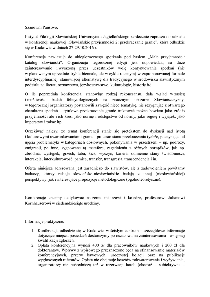 Szanowni Państwo, Instytut Filologii Słowiańskiej Uniwersytetu Jagiellońskiego serdecznie zaprasza do udziału w konferencji naukowej „Słowiańskie przyjemności 2: przekraczanie granic”, która odbędzie się w Krakowie w dniach 27-29.10.2016 r. Konferencja nawiązuje do ubiegłorocznego spotkania pod hasłem „Małe przyjemności: katalog słowiański”. Organizacja tegorocznej edycji jest odpowiedzią na duże zainteresowanie i wyrażoną przez uczestników wolę kontynuowania spotkań (nie w planowanym uprzednio trybie biennale, ale w cyklu rocznym) w zaproponowanej formule interdyscyplinarnej, stanowiącej alternatywę dla tradycyjnego w środowisku slawistycznym podziału na literaturoznawstwo, językoznawstwo, kulturologię, historię itd. O ile poprzednia konferencja, stanowiąc rodzaj rekonesansu, dała wgląd w zasięg i możliwości badań felicytologicznych na znacznym obszarze Słowiańszczyzny, w tegorocznej organizatorzy postanowili zawęzić nieco tematykę, nie rezygnując z otwartego charakteru spotkań – tytułowe przekraczanie granic traktować można bowiem jako źródło przyjemności ale i ich kres, jako normę i odstępstwo od normy, jako regułę i wyjątek, jako imperatyw i zakaz itp. Oczekiwać należy, że temat konferencji stanie się pretekstem do dyskusji nad istotą i kulturowymi uwarunkowaniami granic i procesu/ stanu przekraczania tychże, poczynając od ujęcia problematyki w kategoriach dosłownych, pokonywania w przestrzeni – np. podróży, emigracji, po inne, sygnowane tą metaforą, zagadnienia z różnych porządków, jak np. zbrodnia, występek, grzech, tabu, kicz, wyczyn, kariera, odmienne stany świadomości, interakcja, interkulturowość, pamięć, transfer, transgresja, transcendencja i in. Oferta niniejsza adresowana jest zasadniczo do slawistów, ale z zadowoleniem powitamy badaczy, którzy relacje słowiańsko-niesłowiańskie badają z innej (niesłowiańskiej) perspektywy, jak i interesujące propozycje metodologiczne (ogólnoteoretyczne). Konferencję chcemy dedykować naszemu mistrzowi i koledze, profesorowi Julianowi Kornhauserowi w siedemdziesiąte urodziny. Informacje praktyczne: 1. Konferencja odbędzie się w Krakowie, w ścisłym centrum – szczegółowe informacje dotyczące miejsca posiedzeń dostarczymy po oszacowaniu zainteresowania i wstępnej kwalifikacji zgłoszeń. 2. Opłata konferencyjna wynosi 400 zł dla pracowników naukowych i 200 zł dla doktorantów. Wpływy z wpisowego przeznaczone będą na sfinansowanie materiałów konferencyjnych, przerw kawowych, uroczystej kolacji oraz na publikację wygłoszonych referatów. Opłata nie obejmuje kosztów zakwaterowania i wyżywienia, organizatorzy nie pośredniczą też w rezerwacji hoteli (chociaż – subiektywna – 3. 4. 5. 6. 7. informacja o bazie noclegowej będzie wkrótce podana). Szczegóły dotyczące numeru konta i terminu wpłaty prześlemy po wstępnej akceptacji zgłoszonych tematów. Na zgłoszenia oczekujemy do końca sierpnia 2016 r. Wypełnione formularze prosimy przesyłać drogą elektroniczną na adres [email protected] Zgłoszenia od doktorantów będą przyjmowane pod warunkiem dostarczenia rekomendacji opiekuna naukowego (wystarczy parafka – akceptujemy skany, względnie e-mail od promotora). Języki konferencji: wszystkie języki słowiańskie oraz język angielski. Czas wystąpienia: 15-20 minut (+ dyskusja) W przypadku materiałów pokonferencyjnych organizatorzy zastrzegają sobie prawo odmowy druku prac niespełniających warunków edytorskich, nadesłanych po terminie lub ocenionych negatywnie przez recenzentów. Z wyrazami szacunku, organizatorzy: Elżbieta Solak Barbara Popiołek Bojana Todorović