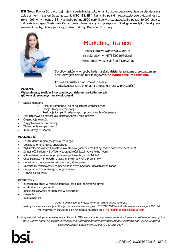 BSI Group Polska Sp. z o.o. zajmuje się certyfikacją, szkoleniami oraz oprogramowaniem wspierającym z zakresu norm i systemów zarządzania (ISO, BS, EN). Na rynku polskim rozpoczęło swoją działalność w roku 1999; w tym czasie BSI wystawiło ponad 2500 certyfikatów oraz przeszkoliło ponad 30,000 osób w zakresie wymagań Systemów Zarządzania i towarzyszących przepisów. Obsługuje nie tylko Polskę, ale również Czechy, Słowację, Litwę, Łotwę, Estonię, Bułgarię i Rumunię. Marketing Trainee Miejsce pracy: Warszawa Centrum Nr referencyjny: MT/BSI0716/Poland Oferty prosimy przesyłać do 31.08.2016 Do obowiązków ww. osoby będą należały działania związane z prowadzeniem oraz rozwojem działań marketingowych na rynku polskim i czeskim. Forma zatrudnienia: umowa zlecenie (z możliwością zatrudnienia na umowę o pracę w przyszłości) ZADANIA Wsparcie przy realizacji następujących działań marketingowych głównie skierowanych na rynek czeski: • • • • • • Digital marketing o Obsługa komunikacji na portalach społecznościowych o Edycja strony internetowej o Realizacja kampanii reklamowych i promocyjnych w Internecie Przygotowywanie materiałów informacyjnych i reklamowych Organizacja eventów Przygotowywanie prezentacji Tłumaczenia na język czeski Komunikacja z klientami WYMAGANIA • Bardzo dobra znajomość języka czeskiego • Dobra znajomość języka angielskiego • Wykształcenie wyższe lub ostatni rok studiów (kierunek marketing będzie dodatkowym atutem) • Znajomość Pakietu MS Office, w szczególności Excel, PowerPoint, Word • Mile widziana znajomość programów graficznych (pakiet Adobe) • Chęć poznawania nowych narzędzi marketingowych / programów • Umiejętność redagowania tekstów tzw. „lekkie pióro” • Rzetelność, terminowość i samodzielność w wykonywaniu powierzonych zadań • Umiejętności komunikacyjne i organizacyjne • Motywacja do pracy OFERUJEMY • interesującą pracę w międzynarodowej, stabilnej i rozwojowej firmie • atrakcyjne wynagrodzenie • możliwość rozwoju i zatrudnienia w przyszłości • szkolenia • miłą atmosferę Osoby spełniające powyższe kryteria i zainteresowane ofertą prosimy by kierowały swoje aplikacje z numerem referencyjnym MT/BSI0716/Poland w temacie, zawierające CV i list motywacyjny w języku polskim wyłącznie na adres email [email protected] Prosimy również o dopisanie następującej klauzuli: "Wyrażam zgodę na przetwarzanie moich danych osobowych zawartych w mojej ofercie pracy dla potrzeb niezbędnych do realizacji procesu rekrutacji (zgodnie z ustawą z dn. 29.08.97 roku o Ochronie Danych Osobowych Dz. Ust Nr 133 poz. 883)".