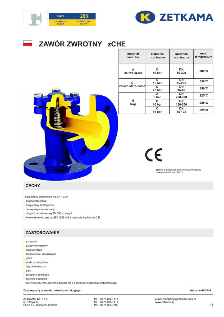figura 288 przyłącza kształt kołnierzowe kątowy ZAWÓR ZWROTNY zCHE materiał kadłuba ciśnienie nominalne średnica nominalna max. temperatura A żeliwo szare C 16 bar DN 15-300 300°C C 16 bar D 25 bar A 6 bar B 10 bar C 16 bar DN 15-200 DN 15-80 DN 250-300 DN 150-200 DN 15-125 C żeliwo sferoidalne E brąz 350°C 350°C 225°C 225°C 225°C zgodnie z dyrektywą ciśnieniową 2014/68/UE znakowanie CE dla DN≥32 CECHY szczelność zamknięcia wg EN 12334 zwarta zabudowa bezpieczny ekologicznie nie wymaga konserwacji długość zabudowy wg EN 588 szereg 8 kołnierze owiercone wg EN 1092-2 dla materiału kadłuba A,C,E ZASTOSOWANIE przemysł przemysł okrętowy ciepłownictwo chłodnictwo i klimatyzacje glikol woda przemysłowa olej diatermiczny para sprężone powietrze czynniki neutralne *nie wszystkie zastosowania nadają się do każdego wykonania materiałowego Zastrzega się prawo do zmian konstrukcyjnych. ZETKAMA Sp. z o.o. ul. 3 Maja 12 PL 57-410 Ścinawka Średnia Wydanie 06/2016 tel. +48 74 8652 174 tel. +48 74 8652 111 fax +48 74 8652 199 e-mail [email protected] www.zetkama.pl 1/6 figura 288 przyłącza kształt kołnierzowe kątowy MATERIAŁY wykonanie 38* 8 5 2 3 6 PTFE 5 7 3 4 1 materiał kadłuba A wykonanie C A 31; 41 C E 33,43 32 1 kadłub EN – GJL-250 5.1301(ex.JL1040) EN – GJS-400-18 5.1303 (ex.JS 1025) EN – GJL-250 5.1301(ex.JL1040) EN – GJS-400-18 5.1303 (ex.JS 1025) CuSn5Zn5Pb5-C 2 pokrywa EN – GJL-250 5.1301(ex.JL1040) EN – GJS-400-18 5.1303 (ex.JS 1025) EN – GJL-250 5.1301(ex.JL1040) EN – GJS-400-18 5.1303 (ex.JS 1025) CuSn5Zn5Pb5-C 3 grzyb X20Cr13 1.4021 CuSn10 DN15-32 CuZn35Ni DN40-300 CuSn5Zn5Pb5-C 4 pierścień kadłuba X12Cr13 1.4006 CuSn10 CuSn5Zn5Pb5-C 5 trzpień X20Cr13 1.4021 CuSn10 DN15-32 CuZn35Ni DN40-300 CuSn5Zn5Pb5-C 6 uszczelka 7 sprężyna 8 śruba z łbem 6k FA1 grafit CrNi max. temperatura X17CrNi16-2 1.4057 CuSn6 8.8 A2A A2-70 8.8 A2A 300oC 350oC - 225oC * na zapytanie max. temperatura 200°C Zastrzega się prawo do zmian konstrukcyjnych. ZETKAMA Sp. z o.o. ul. 3 Maja 12 PL 57-410 Ścinawka Średnia Wydanie 06/2016 tel. +48 74 8652 174 tel. +48 74 8652 111 fax +48 74 8652 199 e-mail [email protected] www.zetkama.pl 2/6 figura 288 przyłącza kształt kołnierzowe kątowy WYMIARY DN PN 16 PN 25 L PN 16 D d PN 16 PN 25 PN 25 K nxdo D d K nxdo A, C E H mm kg 15 90 95 46 65 4x14 95 46 65 4x14 140 2,1 2,3 20 95 105 56 75 4x14 105 56 75 4x14 142 2,7 3,5 25 100 115 65 85 4x14 115 65 85 4x14 157 3,8 4,0 32 105 140 76 100 4x19 140 76 100 4x19 165 5,5 5,0 40 115 150 84 110 4x19 150 84 110 4x19 185 7,4 7,5 50 125 165 99 125 4x19 165 99 125 4x19 198 9,5 10,0 65 145 185 118 145 4x19 185 118 145 8x19 224 15,0 14,0 80 155 200 132 160 8x19 200 132 160 8x19 237 20,0 17,0 100 175 220 156 180 8x19 - - - - 292 29,0 20,0 125 200 250 184 210 8x19 - - - - 329 41,0 30,0 150 225 285 211 240 8x23 - - - - 363 66,0 40,0 - - - 452 111 80 200 275 340 266 295 12x23 - 250 325 405 319 355 12x28 - - - - 535 196 130 300 375 460 370 410 12x28 - - - - 635 302 180 Zastrzega się prawo do zmian konstrukcyjnych. ZETKAMA Sp. z o.o. ul. 3 Maja 12 PL 57-410 Ścinawka Średnia Wydanie 06/2016 tel. +48 74 8652 174 tel. +48 74 8652 111 fax +48 74 8652 199 e-mail [email protected] www.zetkama.pl 3/6 figura 288 przyłącza kształt kołnierzowe kątowy ZALEŻNOŚĆ TEMPERATURY OD CIŚNIENIA 18 16 16 16 14,4 14 13,4 12,8 12 Obszar dopuszczalnych parametrów pracy PN 16 EN-GJL-250 11,8 11,2 Ciśnienie (bar) 10 9,6 8 6 4 2 0 -10 120 150 180 200 230 250 300 o Temperatura ( C) 18 16 16 16 15,5 14,7 14 13,9 Ciśnienie (bar) 12 12,8 11,2 Obszar dopuszczalnych parametrów pracy PN 16 EN-GJS-400-18-LT 10 8 6 4 2 0 -10 120 150 200 250 300 350 o Temperatura ( C) 30 25 25 25 24,3 23 20 21,8 20 Ciśnienie (bar) 17,5 Obszar dopuszczalnych parametrów pracy PN 25 EN-GJS-400-18-LT 15 10 5 0 -10 120 150 200 250 300 350 o Temperatura ( C) Zastrzega się prawo do zmian konstrukcyjnych. ZETKAMA Sp. z o.o. ul. 3 Maja 12 PL 57-410 Ścinawka Średnia Wydanie 06/2016 tel. +48 74 8652 174 tel. +48 74 8652 111 fax +48 74 8652 199 e-mail [email protected] www.zetkama.pl 4/6 figura 288 przyłącza kształt kołnierzowe kątowy WYKONANIA figura 288 ciśnienie nominalne PN materiał kadłuba średnica nominalna DN A 15-300 C mm 16bar żeliwo szare EN-GJL-250 C żeliwo sferoidalne EN-GJS-400-18LT C żeliwo sferoidalne EN-GJS-400-18LT 15-300 C mm 16bar 15-300 C mm 16bar 15-300 C mm 16bar 15-150 C mm 16bar 15-200 C mm 16bar 15-200 C mm 16bar 15-200 C mm 16bar 15-200 C mm 16bar 15-150 C mm 16bar 15-80 D mm 25bar 15-80 D mm 25bar 15-80 D mm 25bar 15-80 D mm 25bar 15-80 D mm 25bar wykonanie 31 luźny grzyb ze sprężyną 41 luźny grzyb bez sprężyny Tmax 300 °C trzpień, grzyb i pierścień kadłuba stal nierdzewna 33 luźny grzyb ze sprężyną Tmax 225 °C trzpień, grzyb i pierścień kadłuba brąz 43 luźny grzyb bez sprężyny Tmax 225 °C trzpień, grzyb i pierścień kadłuba brąz 38 Tmax 120 °C luźny grzyb ze sprężyną trzpień, grzyb i pierścień kadłuba stal nierdzewna uszczelka grzyba PTFE luźny grzyb ze sprężyną trzpień, grzyb i pierścień kadłuba stal nierdzewna 31 Tmax 350 °C 41 luźny grzyb bez sprężyny Tmax 350 °C trzpień, grzyb i pierścień kadłuba stal nierdzewna 33 luźny grzyb ze sprężyną Tmax 225 °C trzpień, grzyb i pierścień kadłuba brąz 43 luźny grzyb bez sprężyny Tmax 225 °C trzpień, grzyb i pierścień kadłuba brąz 38 Tmax 120 °C luźny grzyb ze sprężyną trzpień, grzyb i pierścień kadłuba stal nierdzewna uszczelka grzyba PTFE luźny grzyb ze sprężyną trzpień, grzyb i pierścień kadłuba stal nierdzewna 31 Tmax 350 °C 41 luźny grzyb bez sprężyny Tmax 350 °C trzpień, grzyb i pierścień kadłuba stal nierdzewna 33 luźny grzyb ze sprężyną Tmax 225 °C trzpień, grzyb i pierścień kadłuba brąz 43 luźny grzyb bez sprężyny Tmax 225 °C trzpień, grzyb i pierścień kadłuba brąz 38 luźny grzyb ze sprężyną Zastrze