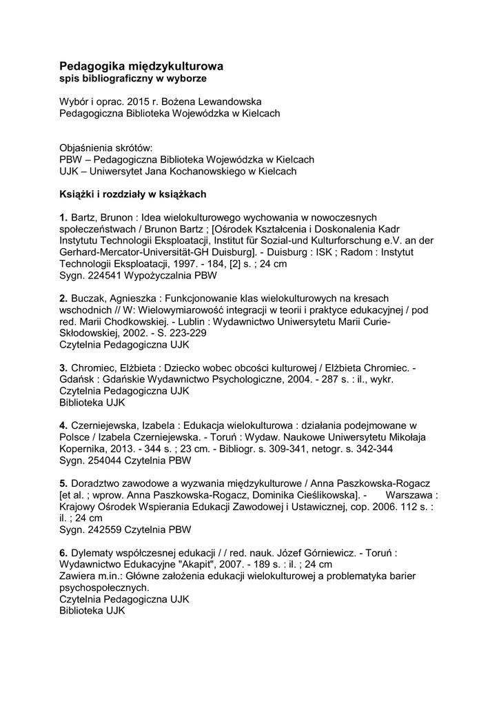 Pedagogika międzykulturowa spis bibliograficzny w wyborze Wybór i oprac. 2015 r. Bożena Lewandowska Pedagogiczna Biblioteka Wojewódzka w Kielcach Objaśnienia skrótów: PBW – Pedagogiczna Biblioteka Wojewódzka w Kielcach UJK – Uniwersytet Jana Kochanowskiego w Kielcach Książki i rozdziały w książkach 1. Bartz, Brunon : Idea wielokulturowego wychowania w nowoczesnych społeczeństwach / Brunon Bartz ; [Ośrodek Kształcenia i Doskonalenia Kadr Instytutu Technologii Eksploatacji, Institut für Sozial-und Kulturforschung e.V. an der Gerhard-Mercator-Universität-GH Duisburg]. - Duisburg : ISK ; Radom : Instytut Technologii Eksploatacji, 1997. - 184, [2] s. ; 24 cm Sygn. 224541 Wypożyczalnia PBW 2. Buczak, Agnieszka : Funkcjonowanie klas wielokulturowych na kresach wschodnich // W: Wielowymiarowość integracji w teorii i praktyce edukacyjnej / pod red. Marii Chodkowskiej. - Lublin : Wydawnictwo Uniwersytetu Marii CurieSkłodowskiej, 2002. - S. 223-229 Czytelnia Pedagogiczna UJK 3. Chromiec, Elżbieta : Dziecko wobec obcości kulturowej / Elżbieta Chromiec. Gdańsk : Gdańskie Wydawnictwo Psychologiczne, 2004. - 287 s. : il., wykr. Czytelnia Pedagogiczna UJK Biblioteka UJK 4. Czerniejewska, Izabela : Edukacja wielokulturowa : działania podejmowane w Polsce / Izabela Czerniejewska. - Toruń : Wydaw. Naukowe Uniwersytetu Mikołaja Kopernika, 2013. - 344 s. ; 23 cm. - Bibliogr. s. 309-341, netogr. s. 342-344 Sygn. 254044 Czytelnia PBW 5. Doradztwo zawodowe a wyzwania międzykulturowe / Anna Paszkowska-Rogacz [et al. ; wprow. Anna Paszkowska-Rogacz, Dominika Cieślikowska]. Warszawa : Krajowy Ośrodek Wspierania Edukacji Zawodowej i Ustawicznej, cop. 2006. 112 s. : il. ; 24 cm Sygn. 242559 Czytelnia PBW 6. Dylematy współczesnej edukacji / / red. nauk. Józef Górniewicz. - Toruń : Wydawnictwo Edukacyjne "Akapit", 2007. - 189 s. : il. ; 24 cm Zawiera m.in.: Główne założenia edukacji wielokulturowej a problematyka barier psychospołecznych. Czytelnia Pedagogiczna UJK Biblioteka UJK 7. Dzieci i młodzież w procesie kształtowania postaw kulturowych : przewodnik po ścieżkach edukacji regionalnej, wielo- i międzykulturowej : (materiały dla nauczycieli gimnazjów i szkół ponadgimnazjalnych) : praca zbiorowa / pod red. Tadeusza Lewowickiego i Jolanty Suchodolskiej. - Cieszyn [etc.] : Wydział Etnologii i Nauk o Edukacji Uniwersytetu Śląskiego [etc.], 2012. - 207 s. : il. ; 24 cm Sygn. 254183 Czytelnia PBW 8. Edukacja dzieci i młodzieży w środowiskach zróżnicowanych kulturowo / red. nauk. Tadeusz Lewowicki, Barbara Chojnacka-Synaszko, Gabriela PiechaczekOgierman ; Wydział Etnologii i Nauk o Edukacji Uniwersytetu Śląskiego w Katowicach, Wyższa Szkoła Pedagogiczna ZNP w Warszawie, Stowarzyszenie Wspierania Edukacji Międzykulturowej. - Toruń : Wydawnictwo Adam Marszałek, 2014. - 286 s. : il. ; 23 cm Czytelnia Pedagogiczna UJK Biblioteka UJK 9. Edukacja międzykulturowa : w kręgu potrzeb, oczekiwań i stereotypów : [I Międzynarodowa Konferencja Naukowa, Ciechanowiec, 25-28. 05. 1994] / pod red. Jerzego Nikitorowicza. - Białystok : "Trans Humana", 1995. - 462 s. : rys., wykr. ; 21 cm. – Bibliogr. Sygn. 220269 Czytelnia PBW 10. Edukacja międzykulturowa : poradnik dla nauczyciela / praca zbiorowa pod redakcją Anny Klimowicz. - Warszawa : Wydawnictwo Centralnego Ośrodka Doskonalenia Nauczycieli , 2004. - 340 s. : rys., tab.; 30 cm Sygn. 241838 Czytelnia PBW 11. Edukacja międzykulturowa w wymiarze instytucjonalnym / pod red. Jerzego Nikitorowicza i Mirosława Sobeckiego. - Białystok : "Trans Humana", 1999. - 355 s. : tab., wykr. ; 25 cm. - Bibliogr. przy rozdz. Sygn. 230623 Czytelnia PBW 12. Edukacja wobec ładu globalnego / red. nauk. Tadeusz Lewowicki [et al.] ; Wyższa Szkoła Pedagogiczna Związku Nauczycielstwa Polskiego. - Warszawa : Wydawnictwo Akademickie "Żak", cop. 2002. - 452, [1] s. : il. Czytelnia Pedagogiczna UJK Biblioteka UJK 13. Grzybowski, Przemysław : Edukacja europejska - od wielokulturowości ku międzykulturowości : koncepcje edukacji wielokulturowej i międzykulturowej w kontekście europejskim ze szczególnym uwzględnieniem środowiska frankofońskiego / Przemysław Paweł Grzybowski. - Kraków : Oficyna Wydawnicza "Impuls", 2007. - 471 s. ; 24 cm. - Bibliogr. s. 417-442 Sygn. 246051 Czytelnia PBW Sygn. 244618 Wypożyczalnia PBW 14. Grzybowski, Przemysław : Edukacja międzykulturowa - przewodnik : pojęcia, literatura, adresy / Przemysław Paweł Grzybowski. - Kraków : Oficyna Wydawnicza "Impuls", 2008. - 165, [1] s. : il. ; 24 cm. - Bibliogr. s. 119-131, 139-165 Sygn. 244610 Wypożyczalnia PBW 15. Idea wielokulturowości w edukacji / pod red. Kazimierza Rędzińskiego, Bogdana Snocha i Józefa Żurawia ; Wyższa Szkoła Pedagogiczna w Częstochowie. - Częstochowa : Wydawnictwo WSP, 2003. - 227, [1] s. : wykr., err. ; 24 cm Czytelnia Pedagogiczna UJK 16. Kamińska, Krystyna : W stronę wielokulturowości w edukacji przedszkolnej / Krystyna Kamińska. - Warszawa : Wydawnictwa Szkolne i Pedagogiczne, cop. 2005. - 207, [1] s. ; 24 cm Sygn. 247326 Czytelnia PBW 17. Kowalska, Ewa : Kształcenie międzykulturowe jako próba odpowiedzi pedagogiki na problemy współczesnego społeczeństwa wielokulturowego //W: Nauki pedagogiczne w teorii i praktyce edukacyjnej. T. 2 / pod red. Józefa Kuźmy i Janusza Morbitzera. - Kraków : Wydawnictwo Naukowe Akademii Pedagogicznej, 2003. - S. 12-17 Czytelnia Pedagogiczna UJK 18. Krawiec, Beata : Pedagogika wielokulturowości a bariery komunikacyjne // W: Wartości w komunikacji różnych grup społecznych / red. nauk. Marzena Baryluk, Mirosława Wawrzak-Chodaczek. - Toruń : Wydawnictwo Adam Marszałek, 2009. - S. 362-368 Czytelnia Pedagogiczna UJK Biblioteka UJK 19. Kształcenie nauczycieli : modele, tendencje, wyzwania wielokulturowej rzeczywistości : praca zbiorowa / pod red. nauk. Ewy Żmijewskiej. - Kraków : Wydawnictwo Naukowe Uniwersytetu Pedagogicznego, 2012. - 350 s. : il. (gł. kolo