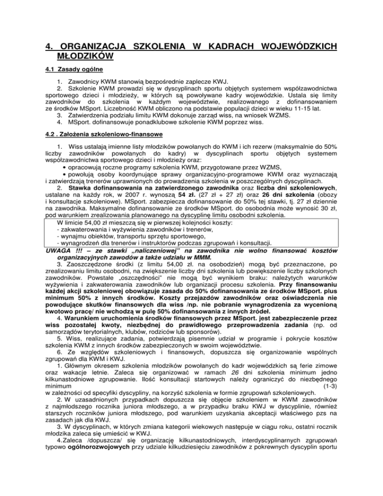 4. ORGANIZACJA SZKOLENIA W KADRACH WOJEWÓDZKICH MŁODZIKÓW 4.1 Zasady ogólne 1. Zawodnicy KWM stanowią bezpośrednie zaplecze KWJ. 2. Szkolenie KWM prowadzi się w dyscyplinach sportu objętych systemem współzawodnictwa sportowego dzieci i młodzieży, w których są powoływane kadry wojewódzkie. Ustala się limity zawodników do szkolenia w każdym województwie, realizowanego z dofinansowaniem ze środków MSport. Liczebność KWM obliczono na podstawie populacji dzieci w wieku 11-15 lat. 3. Zatwierdzenia podziału limitu KWM dokonuje zarząd wiss, na wniosek WZMS. 4. MSport. dofinansowuje ponadklubowe szkolenie KWM poprzez wiss. 4.2 . Założenia szkoleniowo-finansowe 1. Wiss ustalają imienne listy młodzików powołanych do KWM i ich rezerw (maksymalnie do 50% liczby zawodników powołanych do kadry) w dyscyplinach sportu objętych systemem współzawodnictwa sportowego dzieci i młodzieży oraz: • opracowują roczne programy szkolenia KWM, przygotowane przez WZMS, • powołują osoby koordynujące sprawy organizacyjno-programowe KWM oraz wyznaczają i zatwierdzają trenerów uprawnionych do prowadzenia szkolenia w poszczególnych dyscyplinach. 2. Stawka dofinansowania na zatwierdzonego zawodnika oraz liczba dni szkoleniowych, ustalane na każdy rok, w 2007 r. wynoszą 54 zł. (27 zł + 27 zł) oraz 26 dni szkolenia (obozy i konsultacje szkoleniowe). MSport. zabezpiecza dofinansowanie do 50% tej stawki, tj. 27 zł dziennie na zawodnika. Maksymalne dofinansowanie ze środków MSport. do osobodnia może wynosić 30 zł, pod warunkiem zrealizowania planowanego na dyscyplinę limitu osobodni szkolenia. W limicie 54,00 zł mieszczą się w pierwszej kolejności koszty: - zakwaterowania i wyżywienia zawodników i trenerów, - wynajmu obiektów, transportu sprzętu sportowego, - wynagrodzeń dla trenerów i instruktorów podczas zgrupowań i konsultacji. UWAGA !!! – ze stawki „naliczeniowej” na zawodnika nie wolno finansować kosztów organizacyjnych zawodów a także udziału w MMM. 3. Zaoszczędzone środki (z limitu 54,00 zł. na osobodzień) mogą być przeznaczone, po zrealizowaniu limitu osobodni, na zwiększenie liczby dni szkolenia lub powiększenie liczby szkolonych zawodników. Powstałe „oszczędności” nie mogą być wynikiem braku: należytych warunków wyżywienia i zakwaterowania zawodników lub organizacji procesu szkolenia. Przy finansowaniu każdej akcji szkoleniowej obowiązuje zasada do 50% dofinansowania ze środków MSport. plus minimum 50% z innych środków. Koszty przejazdów zawodników oraz oświadczenia nie powodujące skutków finansowych dla wiss /np. nie pobranie wynagrodzenia za wycenioną kwotowo pracę/ nie wchodzą w pulę 50% dofinansowania z innych źródeł. 4. Warunkiem uruchomienia środków finansowych przez MSport. jest zabezpieczenie przez wiss pozostałej kwoty, niezbędnej do prawidłowego przeprowadzenia zadania (np. od samorządów terytorialnych, klubów, rodziców lub sponsorów). 5. Wiss, realizujące zadania, potwierdzają pisemnie udział w programie i pokrycie kosztów szkolenia KWM z innych środków zabezpieczonych w swoim województwie. 6. Ze względów szkoleniowych i finansowych, dopuszcza się organizowanie wspólnych zgrupowań dla KWM i KWJ. 1. Głównym okresem szkolenia młodzików powołanych do kadr wojewódzkich są ferie zimowe oraz wakacje letnie. Zaleca się organizować w ramach 26 dni szkolenia minimum jedno kilkunastodniowe zgrupowanie. Ilość konsultacji startowych należy ograniczyć do niezbędnego minimum (1-3) w zależności od specyfiki dyscypliny, na korzyść szkolenia w formie zgrupowań szkoleniowych. 2. W uzasadnionych przypadkach dopuszcza się objęcie szkoleniem w KWM zawodników z najmłodszego rocznika juniora młodszego, a w przypadku braku KWJ w dyscyplinie, również starszych roczników juniora młodszego, pod warunkiem uzyskania akceptacji właściwego pzs na zasadach jak dla KWJ. 3. W dyscyplinach, w których zmiana kategorii wiekowych następuje w ciągu roku, ostatni rocznik młodzika zaleca się umieścić w KWJ. 4. Zaleca /dopuszcza/ się organizację kilkunastodniowych, interdyscyplinarnych zgrupowań typowo ogólnorozwojowych przy udziale kilkudziesięciu zawodników z pokrewnych dyscyplin sportu /np. sporty walki, zimowe, wodne lub gry/, kierownika obozu, trenera gimnastyki, lekkiej atletyki z wykorzystaniem najlepszej bazy treningowej / np. dawne MROS-y/. załącznik A Limity kadry wojewódzkiej juniorów na 2007 rok w dyscyplinach indywidualnych w kategorii juniora i juniora młodszego pięciobój nowoczesny pływanie pływanie synchroniczne podnoszenie ciężarów saneczkarstwo 16 3 11 11 7 16 1 3 2 7 15 7 20 21 13 8 short track wioślarstwo zapasy kobiet zapasy klasyczne zapasy wolne żeglarstwo dyscypliny dodatkowe RAZEM INDYW ŁDZ triathlon LUB tenis stołowy LBU tenis KPM taekwondo WTF ILOŚC WLP ZPM ŚWI WM ŚL POM 150 30 31 1 230 60 1 1 15 4 9 10 62 3 1 6 6 35 35 59 7 18 15 30 30 110 170 220 30 8 7 55 3 13 69 31 1 3 5 3 11 9 3 2 8 9 36 5 15 2 8 12 7 34 4 11 12 600 100 30 60 5 40 3 100 2 5 15 12 2 3 1 10 48 11 250 4 140 15 2 2 10 60 3 7 7 9 2 65 4 3 12 10 6 13 12 12 38 12 25 3 6 6 9 2 16 12 20 5 2 3 22 10 2 8 4 2 1 2 1 6 6 2 1 2 3 4 5 5 5 4 4 4 1 0 2 10 15 15 10 6 9 13 2 5 9 9 4 1 11 74 4 43 3 5 18 7 2 15 5 15 1 1 1 1 3 17 23 11 15 10 2 5 5 19 14 13 11 18 9 8 12 5 7 2 17 2 8 2 3 31 2 4 30 3 138 98 69 67 97 191 109 39 47 51 101 156 521 435 255 236 319 777 418 143 216 183 392 649 DŚL taekwondo ITF 4 26 8 13 6 6 23 46 11 14 17 21 snowboard szermierka 3 2 2 skoki do wody strzelectwo 35 4 45 7 3 2 3 5 5 8 100 20 6 2 1 3 1 1 29 90 2 18 2 45 8 1 1 2 15 24 19 14 2 4 8 11 4 11 3 5 34 8 18 6 1 3 14 4 17 8 13 15 28 12 164 65 79 611 270 283 30 180 240 50 100 90 150 30 200 80 140 140 140 1500 5798 ILOŚC narciarstwo klasyczne 7 8 3 1 13 2 ZPM narciarstwo alpejskie 5 9 4 2 18 1 20 66 9 11 14 3 8 16 48 2 5 1 3 110 4 WM łyżwiarstwo szybkie 7 19 38 12 3 12 3 1 1 15 5 WLP ł