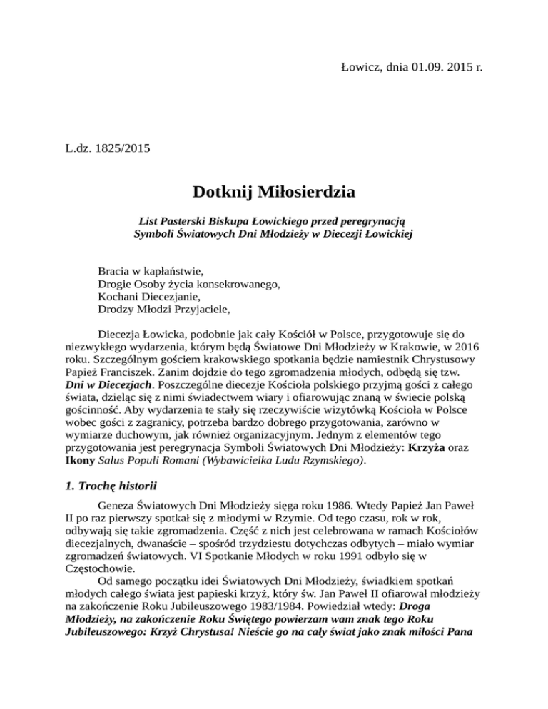 Łowicz, dnia 01.09. 2015 r. L.dz. 1825/2015 Dotknij Miłosierdzia List Pasterski Biskupa Łowickiego przed peregrynacją Symboli Światowych Dni Młodzieży w Diecezji Łowickiej Bracia w kapłaństwie, Drogie Osoby życia konsekrowanego, Kochani Diecezjanie, Drodzy Młodzi Przyjaciele, Diecezja Łowicka, podobnie jak cały Kościół w Polsce, przygotowuje się do niezwykłego wydarzenia, którym będą Światowe Dni Młodzieży w Krakowie, w 2016 roku. Szczególnym gościem krakowskiego spotkania będzie namiestnik Chrystusowy Papież Franciszek. Zanim dojdzie do tego zgromadzenia młodych, odbędą się tzw. Dni w Diecezjach. Poszczególne diecezje Kościoła polskiego przyjmą gości z całego świata, dzieląc się z nimi świadectwem wiary i ofiarowując znaną w świecie polską gościnność. Aby wydarzenia te stały się rzeczywiście wizytówką Kościoła w Polsce wobec gości z zagranicy, potrzeba bardzo dobrego przygotowania, zarówno w wymiarze duchowym, jak również organizacyjnym. Jednym z elementów tego przygotowania jest peregrynacja Symboli Światowych Dni Młodzieży: Krzyża oraz Ikony Salus Populi Romani (Wybawicielka Ludu Rzymskiego). 1. Trochę historii Geneza Światowych Dni Młodzieży sięga roku 1986. Wtedy Papież Jan Paweł II po raz pierwszy spotkał się z młodymi w Rzymie. Od tego czasu, rok w rok, odbywają się takie zgromadzenia. Część z nich jest celebrowana w ramach Kościołów diecezjalnych, dwanaście – spośród trzydziestu dotychczas odbytych – miało wymiar zgromadzeń światowych. VI Spotkanie Młodych w roku 1991 odbyło się w Częstochowie. Od samego początku idei Światowych Dni Młodzieży, świadkiem spotkań młodych całego świata jest papieski krzyż, który św. Jan Paweł II ofiarował młodzieży na zakończenie Roku Jubileuszowego 1983/1984. Powiedział wtedy: Droga Młodzieży, na zakończenie Roku Świętego powierzam wam znak tego Roku Jubileuszowego: Krzyż Chrystusa! Nieście go na cały świat jako znak miłości Pana Jezusa do ludzkości i głoście wszystkim, że tylko w Chrystusie umarłym i zmartwychwstałym jest zbawienie i odkupienie. W 2003 roku Papież Jan Paweł II podarował młodzieży drugi symbol: Ikonę Salus Populi Romani mówiąc: Dzisiaj powierzam wam ikonę Maryi. Od teraz będzie razem z Krzyżem towarzyszyć Światowym Dniom Młodzieży. Kontemplujcie waszą Matkę! Ikona będzie znakiem matczynej obecności Maryi bliskiej młodym, którzy jak apostoł Jan zostali wezwani, aby przyjąć ją do swojego życia. Po ostatnim spotkaniu młodych w Rio de Janeiro, w Brazylii – Papież Franciszek ogłosił, że kolejne zgromadzenie odbędzie się w Polsce, w 2016 roku w Krakowie. Od roku 2013 nasza diecezja przygotowuje się do tego spotkania. Diecezję łowicką podzielono na siedem rejonów: kutnowski, łęczycki, łowicki, skierniewicki, sochaczewski, rawski i żyrardowski. Została powołana grupa kapłanów odpowiedzialnych za przygotowania na poziomie diecezjalnym, jak również w poszczególnych rejonach. Stworzono środowisko młodych zaangażowanych w przygotowania Światowych Dni Młodzieży. Odbywa się formacja ambasadorów oraz wolontariuszy tego wydarzenia. Zadbano, aby spotkanie krakowskie, jak również przygotowania do niego, obecne były w przestrzeni medialnej… Przebyliśmy długą, trudną, pracowitą, ale owocną drogę. Można śmiało stwierdzić, że obecnie znajdujemy się na jej finiszu. 2. Wyzwania teraźniejszości Dnia 28 sierpnia br. Symbole Światowych Dni Młodzieży: Krzyż oraz Ikona Salus Populi Romani, zawitały do naszej diecezji, do Jaktorowa, Międzyborowa i Żyrardowa, a uwieńczeniem była wieczorna celebracja przed kościołem i w świątyni Matki Bożej Pocieszenia w Żyrardowie. Łącznie – podczas jednego dnia – z Krzyżem i Ikoną spotkało się ok. 2000 osób, zawierzając Chrystusowi i Jego Matce swoje życie, łącząc świadomie trudy i cierpienia ze znakiem miłości, przez który stało się zbawienie dla całego świata (por. Ef 2, 16; 2 Kor 1, 17-18). Przed nami dalsza peregrynacja Symboli Światowych Dni Młodzieży, która odbędzie się w dniach 20 września – 02 października br. Został ustalony plan pielgrzymiej drogi Symboli – począwszy od kościoła Świętej Trójcy w Piątku po uroczystą Eucharystię w Bazylice Katedralnej w Łowiczu. Można powiedzieć, że wszystko od strony logistycznej jest zaplanowane co do minuty, kilometra, miejsca oraz formy… Całe przygotowania, choćby najlepsze, pozostaną jednak martwą formą, jeśli zabraknie ludzkiego zaangażowania i serca, które ją ożywią. Zwracam się z ogromną prośbą do: kapłanów, osób życia konsekrowanego, wiernych świeckich diecezji łowickiej o zaangażowanie i współpracę. Proszę przede wszystkim o obecność na pielgrzymim szlaku Symboli. Możliwość zetknięcia się z nimi w Polsce, w diecezji łowickiej, może się już nie powtórzyć w naszym życiu. A przecież spotkanie z Krzyżem oraz Ikoną to nie tylko dotknięcie jakiegoś krzyża, czy jakiegoś obrazu Matki Bożej, ale to spotkanie z samym Chrystusem i Maryją, to możliwość świadomego zaproszenia Ich w nasze życie, to szansa uczynienia z naszej codziennej życiowej chaotycznej szarpaniny świadomego podjęcia krzyża na wzór Chrystusa i Tej, która jest pierwszą uczennicą w Jego szkole – Maryi. Wykorzystajmy łaskę, jaką daje nam Bóg. 3. Jeśli kto chce pójść za Mną (…) niech weźmie krzyż swój i niech Mnie naśladuje (Mk 8, 34) Dzisiejsza liturgia słowa tak pięknie prowadzi nas do głębszego zrozumienia peregrynacji Symboli Światowych Dni Młodzieży po naszej diecezji łowickiej. Jezus, w usłyszanym przez nas fragmencie Ewangelii, ukazuje konieczność obecności krzyża w życiu jego uczniów. Dlatego to On sam przychodzi do każdego i każdej z nas, razem ze swoją Matką szuka nas, mówi: Nie bój się! Nie zostawię cię samego w dźwiganiu życiowych cię