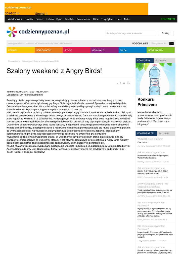 codziennypoznan.pl 30-09-2014 Wiadomości Strona: 1 Osiedla Biznes Kultura Sport Lifestyle Kalendarium Ulice Turystyka Dzieci Moto KONTAKT24 Szukaj wyrazów, artykułów, konkursów Dzisiaj jest wtorek 30 września 2014, Imieniny obchodzą: Wera, Zofia, Honoriusz POZNAŃ STARE MIASTO JEŻYCE Dzisiaj deszcz, 19°C / 13°C GRUNWALD WILDA NOWE MIASTO KONKURSY Strona główna / Kalendarium / Szalony weekend z Angry Birds! Pozostałe Szalony weekend z Angry Birds! A A A Termin: 05.10.2014 10:00 - 06.10.2014 Lokalizacja: CH Auchan Komorniki Potrafiący nieźle przyspieszyć żółty zwierzak, eksplodujący czarny bohater, a może klasyczny, lecący po łuku czerwony ptak - którą postacią kultowej gry Angry Birds najlepiej trafia się do celu? Sprawdzą to najmłodsi goście Centrum Handlowego Auchan Komorniki, którzy w najbliższy weekend będą mogli zdobyć cenne punkty, niszcząc drewniane konstrukcje za pomocą pluszowych, rozsierdzonych ptaszyn. Mali, ale niezwykle niszczycielscy bohaterowie najpopularniejszej gry na smartfony oraz ich zaciekła walka z zielonymi prosiakami przeniesie się z wirtualnego świata do wydzielonej w pasażu Centrum Handlowego Auchan Komorniki strefy już w najbliższy weekend 5 i 6 października. Na specjalnym torze amatorzy Angry Birds będą mogli ustawić wymyślne konstrukcje z drewnianych klocków, aby następnie dokonać ich destrukcji przy użyciu pluszowych, wściekłych ptaszyn. Dwudniowej zabawie towarzyszyć będą liczne konkursy z nagrodami. Gracze będą musieli między innymi zbudować wyższą od siebie wieżę, a następnie strącić z niej świnkę na najwyżej punktowane pole czy rzucić pluszowym ptakiem do wyznaczonego celu. Na wszystkich, którzy zdecydują się spróbować swoich sił w zabawie, czekają karty kolekcjonerskie Angry Birds. Najlepsi uczestnicy mogą zaś liczyć na atrakcyjne gry planszowe. Wydarzenie będzie również wspaniałą okazją, by w rodzinnym czy przyjacielskim gronie przetestować inne gry planszowe i zręcznościowe ze wściekłymi ptakami w roli głównej. Dodatkowo swoje spotkanie z Angry Birds maluchy będą mogły upamiętnić dzięki specjalnej sesji zdjęciowej z wielkim pluszowym bohaterem gry. Wielkie rzucanie wściekłymi stworzeniami odbędzie się w sobotę i niedzielę 5 i 6 października w Centrum Handlowym Auchan Komorniki przy ulicy Głogowskiej 432 w Poznaniu. Do zabawy można się przyłączyć w godzinach 10.00 18.00. Udział w akcji jest bezpłatny! Konkurs Primavera Mamy dla was konkurs sponsorowany przez producenta wody Primavera, tegorocznego partnera akcji "Poznań zrzuca kilogramy". KOMENTARZE Pozostałe WSNHiD znika z miasta! Powodzenia AUTOR, Dodano: 2014-09-30 17:46:23 Jak wodniacy żegnali lato Brawo nasi! Wreszcie coś się dzieje na Warcie! Tylko tak dalej! Pawel, Dodano: 2014-09-30 15:26:35 Jak wodniacy żegnali lato KAJAK TURYSTYCZNY DAJE RADĘ, PRAWDZIWY WODNIAK! KIBIC, Dodano: 2014-09-30 10:54:14 Znów nielegalne plakaty - na szczęście już znikają Teraz zwalają winę na kogoś innego ale są jak najbardziej odpowiedzialni za ten syf. AUTOR, Dodano: 2014-09-30 10:44:13 Kto zostanie prezydentem Poznania? Wydaje mi się, że wyniki absolutnie nie są reprezentatywne! Sondaż telefoniczny to znaczy, że dzwonili na telefony stacjonarne. A kto dziś takie ma i z nich... Gabi, Dodano: 2014-09-30 08:46:18 Kto zostanie prezydentem Poznania? Lewandowski? A kto go zna? Powinien się przyłożyć do kampanii, żeby ludzie coś o nim wiedzieli. Teo, Dodano: 2014-09-30 08:34:24 Jak wodniacy żegnali lato Heniek, a zagrodzony brzeg przez Wechtę jakoś ci nie przeszkadza. Czyżbys był tubą codziennypoznan.pl 30-09-2014 Strona: 2 dewelopera? Jass, Dodano: 2014-09-30 08:22:39 Dzielnice MENU WIĘCEJ POZNAŃ Osiedla Redakcja STARE MIASTO Biznes Oferta reklamowa JEŻYCE Kultura Kontakt GRUNWALD Sport Polityka prywatności WILDA Lifestyle Google+ NOWE MIASTO Kalendarium Przewiń do góry Ulice Turystyka Dzieci Moto INFORMACJA Poznańska Telewizja ONTV Sp. z o.o. zastrzega, że dalsze rozpowszechnianie materiałów opublikowanych na serwisie internetowym www.codziennypoznan.pl jest zabronione bez zachowania warunków korzystania z treści. Podstawa prawna: art. 25 ust. 1 pkt 1 b ustawy z dnia 4 lutego 1994 r. o prawie autorskim i prawach pokrewnych.