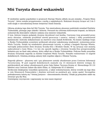 Miś Turysta dawał wskazówki W niedzielne upalne popołudnie w granicach Starego Miasta odbyła się gra miejska „Tropem Misia Turysty”, która została przygotowana z myślą o najmłodszych. Rodzinne drużyny liczące od 2 do 5 osób mogły w niecodziennej formie świętować Dzień Dziecka. Główną atrakcją tego dnia był Miś Turysta. Ten niestrudzony pluszowy podróżnik zwiedzał Piotrków Trybunalski, poznając jego zabytki i historię. Poruszał się czterema kolorowymi tropami, na których zostawiał dla dzieciaków ciekawe zadania oraz misiowe wskazówki. O tym, którym tropem podążały drużyny decydował rzut kostką. Czerwony trop prowadził przez mury obronne, niebieski przybliżył zawód garncarza i szewca, zielony i żółty przedstawiał kamieniczki i kościoły zlokalizowane na starówce oraz Zamek Królewski. Na koniec każdego tropu w Rynku Trybunalskim uczestnicy próbowali odczytać zakodowaną wiadomość, zostawioną przez Misia Turystę. Dzięki tej wiadomości pluszowego turystę, w jednej z knajpek Starego Miasta, wytropiły jednocześnie dwie drużyny Scooby-Doo i Brodate Smoki. W tej sytuacji rzut monetą zadecydował o losie Misia. I w ten oto sposób Agatka z drużyny Scooby-Doo przyprowadziła bohatera gry na finał całej zabawy, który odbył się w Rynku Trybunalskim. Podczas finału wszystkie drużyny otrzymały nagrody za dzielne tropienie Misia Turysty. Ponadto rozlosowano 15 nagród dodatkowych. Ostatnią atrakcją zabawy było wspólne zdjęcie z Misiem Turystą. Nagrody główne – pluszowy miś i gry planszowe zostały ufundowane przez Centrum Informacji Turystycznej. W puli nagród dodatkowych znalazło się 15 dziennych biletów wstępu do piotrkowskich sal zabaw ufundowanych przez Salę Zabaw Tęczowa Kraina ul. Słowackiego 93 (10 biletów) oraz Centrum Zabaw dla dzieci Edan, ul. Sulejowska 45 (5 biletów). Serdecznie dziękujemy wszystkim sponsorom, a także wolontariuszom, którzy wcielili się tego dnia w role Misiowych Pomocników i dzielnie wytrwali na punktach gry, mimo upału! Szczególne podziękowania należą się 7-letniej Justynce – nieocenionemu doradcy. Dzięki jej pomysłom udało się stworzyć grę dla Was. Gratulujemy zwycięzcom i zapraszamy na inne nasze imprezy!