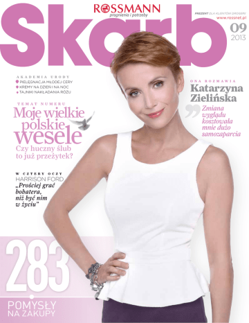 prezent dla klientów drogerii www.rossnet.pl 09 2013 A K A D EMIA URO D Y ielęgnacja młodej cery p kremy na dzień i na noc tajniki nakładania różu temat numeru Moje wielkie polskie wesele Czy huczny ślub to już przeżytek? W c z t e r y o c z y harrison ford „Prościej grać bohatera, niż być nim w życiu” 283 • pomysŁy na zakupy o n a r o z m aw i a Katarzyna Zielińska Zmiana wyglądu kosztowała mnie dużo samozaparcia Czas pięknych kobiet zdjęcie: East News P Agata Młynar s ka redakt o r nac zelna iękna jak panna młoda – słyszymy czasem wyrazy zachwytu – i oby to było... o nas! W tym numerze gościmy Kasię Zielińską, której ślub stał się wydarzeniem letniego sezonu. Kasia opowiada o pracy nad sobą, kryzysach, przemianach i sile, o otwieraniu nowych rozdziałów życia. Jest zakochaną żoną i spełnioną kobietą, ale los nie podarował jej wszystkiego w prezencie. Bo o miłość trzeba zawalczyć. Pokazuje to Sława – bohaterka reportażu, który przekona Was, że prawdziwe uczucie można znaleźć także po pięćdziesiątce. Tylko trzeba być na nie otwartym. Jestem pod wrażeniem i urokiem Sławy – wielu uważa, że kobiety „50 plus” tracą prawo do miłości, nowych przedsięwzięć, życia „na maksa”. Ona udowadnia, że twórczą panią swojego losu i piękną panną młodą można być właśnie w tym wieku. A uroda i blask kobiety wypływają przede wszystkim z jej wnętrza i bogactwa doświadczeń. W tym numerze także o tym, jak dopieścić piękno zewnętrzne, by – niezależenie od metryki – usłyszeć ów entuzjastyczny okrzyk z pierwszego zdania. Niech tak o nas mówią, niech nas doceniają i kochają – zasługujemy na to. Przyszłym mamom dedykujemy tekst, z którego dowiedzą się, jak skompletować wyprawkę dla niemowlęcia, a mamom dzieci nieco starszych pomagamy wybierać zabawki edukacyjne. Czas odrobić lekcje po lecie i zadbać np. o zmęczone, zniszczone słońcem włosy. No, i o skórę, która potrzebuje teraz szczególnej opieki – w tym „Skarbie” znajdziecie bogactwo informacji, które Wam w tym pomogą. Wam, a także Waszym nastoletnim córkom i siostrom – dla nich napisaliśmy o sposobach pielęgnacji młodej skóry. Polecam też artykuł o kremach na dzień i na noc – warto przejmować się tym rozróżnieniem? Przekonacie się, że warto. Przecież wchodzimy w nową porę roku pełne odnowionej energii. Koniecznie uśmiechnięte, z wypiętą piersią. Właśnie – bardzo zależy mi na przekonaniu Was do wspieranej przez „Skarb” akcji organizowanej w dniach 16 września – 31 października przez łódzką klinikę Salve Medica. Odbywa się pod hasłem „Łączy nas kobiecość”. W jej ramach będzie można wykonać bezpłatne badanie mammograficzne, a także spotkać się ze specjalistami i porozmawiać o profilaktyce nowotworów piersi. A także o tym, co możemy dla siebie zrobić, by oddychać piersią pełną i zdrową. Nie ma wagarów od takich starań. I jeszcze à propos słowa „kobiecość” – zachęcam Was do zastanowienia się: czym ta kobiecość jest dla mnie, jak o nią dbam, czy ją celebruję. Zapytałam o to kilka kobiet w mojej osobistej sondzie. Jesteście ciekawe wyników? Czytajcie „Skarb” – od deski do deski. A jeśli chodzi o otwieranie nowych życiowych rozdziałów, to i u mnie nadszedł czas na zmiany! Od września będę się z Wami spotykać nie tylko w „Skarbie”, ale także na antenie TVP1. Jesień to czas ciekawych wyzwań i możliwości! 3 ⁄ spis treści ⁄ t e m at n u m e r u Moje wielkie polskie wesele felieton Michał Ogórek p r aw n i k r a d z i Moje, twoje, nasze 6 14 40 Do zakochani@ jeden klik 20 A ka d e m i a u r o dy Niech żyje róż 21 Piękne 9 miesięcy Mimozami jesień się zaczyna o n a r o z m aw i a Mam focha na doła – wywiad Agaty Młynarskiej felieton Hanna Bakuła moje hobby Piątka z wuefu Wywiad z gwiazdą Wytrwałość jest najważniejsza Moja historia Dojrzałe szczęście we dwoje Do zakochani@ jeden klik 22 Zdrowie 26 P y ta n i a d o s p e c j a l i s t y 28 w mojej kuchni Wytworny kapelusznik Wytrwałość jest najważniejsza 32 uroda Teściowa: wróg czy przyjaciółka?44 Zanim się urodzi Słodkich snów Zręczne rączki, mądra główka Szczerbaty uśmiech Ginekolog położnik 36 40 56 60 64 68 90 94 Podkreśl kobiecość 32 p syc h o lo g i a m oj e dz i e c ko 88 uroda Gwiżdż na pryszcz Akcja reaktywacja Smaruj, balsamu nie żałuj a ka d e m i a u r o dy S.O.S. dla włosów uroda mój dom Rodzinne sprzątanie Do serca przytul psa 70 74 76 78 Nocna zmiana, dzienna warta 80 Piękna na ślub 84 ROZRYWKA Krzyżówka 28 96 100 102 104 108 114 Piątka z wuefu 14 96 Moje wielkie polskie wesele Podkreśl kobiecość 78 S.O.S. dla włosów 4 face to face/REPORTER (1), Olivia Konicka (1) Muzyka, filmy, książki, koncerty zdjęcie okładka: Tatiana Jachyr a /For um; Fotolia (2), East News (2), k u lt u r a ⁄ kultura ⁄ muzyka • film • kino • książki • koncerty muzyka książki kino babyshambles 1 kate morton – strażnik tajemnic c d Szesnastoletnia Laurel Nicolson wymyka się z przyjęcia, aby spędzić czas w sekretnym domku na drzewie, gdzie oddaje się marzeniom o przyszłości. Odkrywa, że nie ona jedna uciekła z rodzinnej uroczystości. Na drodze dostrzega swoją matkę rozmawiającą z nieznajomym. Zanim wieczór się skończy, dziewczyna stanie się świadkiem morderstwa, które wstrząśnie całym jej życiem. Piętnaście lat później, już jako sławna aktorka, Laurel postanawia wrócić na wieś i poznać prawdę o tajemnicach z dzieciństwa. Trzeci album w dyskografii brytyjskiego zespołu. Znalazło się na nim 12 nowych kompozycji. Jak zapewnia Peter Doherty: – Zrobiliśmy coś świetnego. • Parlophone Music Poland Wydawnictwo Albatros kobiety ze skłonnością do depresji w „Królową ludzkich serc”, zaangażowaną w pomoc ubogim, zarażonym wirusem HIV i ofiar