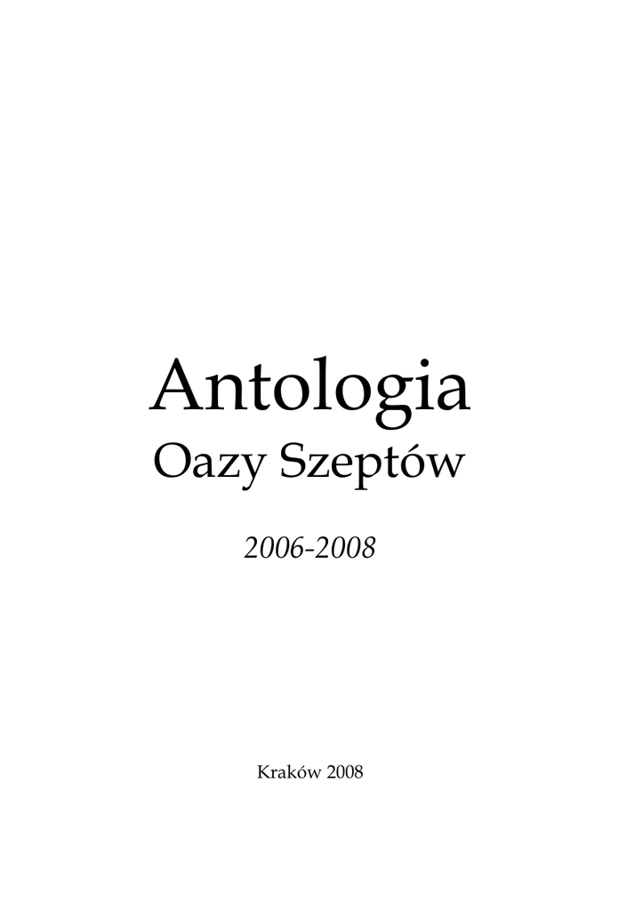 Antologia Oazy Szeptów 2006-2008 Kraków 2008 Wstęp Poezja to przemiana krwi w atrament. Thomas S. Eliot Oaza Szeptów jest portalem literackim założonym 20 maja 2006 roku w celu promowania słowa pisanego tych twórców, którzy jeszcze do niedawna nie mieli możliwości podzielenia się swoim dorobkiem pisarskim z miłośnikami literatury będącymi w podobnej sytuacji. Forum skupia autorów, którzy publikując własne wiersze oraz utwory prozatorskie, poddają je jednocześnie pod lupę wnikliwej analizy ze strony innych oraz sami piszą recenzje zamieszczanych utworów. Komentarze, jakimi opatrywane są poszczególne wiersze, pisane są z poszanowaniem osobowości autorów i ich poetyckiej odrębności. Poeci, którzy już zdobyli uznanie w poetyckim środowisku, nie szczędzą fachowych porad i wskazówek tym, którzy stosunkowo niedawno odkryli przyjemność parania się piórem. Przyjazna, wręcz niepowtarzalna atmosfera wzajemnej pomocy i życzliwości w poszukiwaniu właściwego słowa jest znakomitą wizytówką Forum, do którego przybywa coraz więcej osób pragnących doskonalić literacki warsztat. Dość powiedzieć, że liczba nowo zarejestrowanych użytkowników systematycznie się powiększa, co jest widocznym potwierdzeniem estymy, jaką cieszy się Portal. Po dwóch latach działalności, w trakcie której Oaza Szeptów zdobyła sobie miano jednego z najciekawszych polskich portali literackich, zaistniała wola przeglądu utworów –3– opublikowanych na Portalu w formie wydania „papierowego”. Tak oto narodził się pomysł przedstawienia oazowej twórczości w formie „Antologii Oazy Szeptów”, którą niniejszym mam zaszczyt zaprezentować. Na kilkudziesięciu stronach spotkało się trzydziestu twórców o całkowicie odmiennych poetykach, temperamentach literackich i doświadczeniach życiowych. Zapraszam Cię, Czytelniku, do przekonania się, w jaki sposób przemieniają oni krew w atrament. Z życzeniami przyjemnej lektury Tomasz Kowalczyk –4– Ryszard Sziler: Pełnia Adrianna Andraszczyk (driatyk) – Bydgoszcz czarnoksiężnik słów jednym cieniem długopisu znaczył więcej niż technologia produkcji świata na liniach wysokiego napięcia wieszał słowa wodząc myślami na granicy dnia i nocy poezja jak kromka chleba z ust jego płynie nad poziomem wiedzy tajemnice świata wciąż łamiąc zdania sprzedane choć krótkie tak czułe odczytem serca tworzone pozbawione zbędnych wyrażeń twarze przyodziewał zieloną sukienką płynąc po maśle naprzeciw czarnym lądom zbędnych marzeń czasem stanął ówdzie na przystanku wolności uśmiech w słońcu zapłonął bez granic –7– rytuał wznosząc chwałę ku wieczności rytuałem ciała krzepię duszę wielbiąc jego smak pożądam świętości upijając kolejny haust krwi docieram do prawdy istnienia powoli z entuzjazmem odgryzam palec za palcem upadając pod ciężarem codzienności rozumiem sens ostatniej wieczerzy już nie płaczę krojąc myśli na fragmenty bez zbędnych słów natchnienia poświęcam każdą myśl ufając w nieskazitelną świętość wierzę zatapiając zęby w sercu pamiętam szepty diabła świat upadł w błysku sztachety Antologia karmazynowa miłość skąpana kropelką dżdżu wciąż płonę uwiedziona turkusowym amuletem dziewic spijam krew świętych kroplami rosy wciąż poję niezrównane uczuć pojęcia jednym płatkiem śniegu opadłeś z delikatnością motyla rozkołysani strumieniem wiatru w słońca odbiciu tańczą walc opętanych płynąc w błękitnej linii zapachu pamiętając ostatni pocałunek ten jeden inny niż wszystkie zakochany w słowie umiłowana spojrzeniem miłość bogata w zmysły nie kocham siebie lecz nas Oazy Szeptów smak dnia usiadłeś obok dotyk słów znaczył więcej niż pocałunek nieba to miłość każde uczucie ma swoją własną tęczę poczułam we włosach nieokrzesany wiosenny wiatr lecz słaby anioł uderzył o nieboskłon świata utkwiwszy pomiędzy życia wersami samotność dumnie powstała na zgliszczach westchnienia za oknem spadł śnieg ku trwodze odszedłeś w dal a ja dryfuję po oceanie niechcianych łez i nawet słońce smakuje tak słono Ryszard Sziler: Jesienne okno pragnienie błądzimy dwoma stronami ulic jedziemy w przeciwnych kierunkach obcy lecz skazani na siebie z tęsknotą w sercu kochamy bez słów o sobie mówimy we snach wzajemnie marzymy nigdy jednak nie będzie nam dane połączyć dłonie i ciała wiecznym uściskiem miłości pragnę cud nic się nie stało świat stanął w miejscu umarłam bez słów poza znaczeniem ogółu zniszczona miłość jej własną siłą melancholia odziana jednym kolorem ubioru smutna szarość w niewoli przyzwyczajenia nie opuści swojego przylądka nadziei statek nieszczęśliwie zakotwiczony pomiędzy szczelinami dnia dzisiejszego ryzyko spełniania marzeń umknęło bez pasji odeszły sny i marzenia a miał się zdarzyć tylko cud – 11 – gronostaje tłukąc się o życia gronostaje osiąga prędkość światła bez słów i nut o jedną kroplę krwi za głęboko kolczaste winorośla łzy wylane bezpowrotnie z tęsknotą wyrytą na dłoni tak po prostu uczucia schowane w skrzyni niechcianych wspomnień rytm melancholii księżyca kołysze tłum gwiazd po bezkresnym niebie szept wiatru cicho niesie chwile minionego szczęścia kamienne labirynty wiecznością wyryte w pamięci Antologia przeminęło z wiatrem serce niesione powiewem lekkości zatopione w błękitnej rozkoszy kolorem czerwieni miłością wzniesione słodko upojone zachwytem ekstazy w narkotycznym śnie szczęścia krążąc uzależnieniem nieprzerwanym oddycha żyjąc w nieśmiertelnym raju banalności spełnienia marzeń się doczekało i nagle bez słów nadziei skrzydła w burzy przetrącone goryczą smaku kielich przepełniony poza sensem istnienia porzucone w cieniu z dala od granic odległego świata łzy szlachetne po policzku płyną przepaścią słów niesłusznie odrzuc