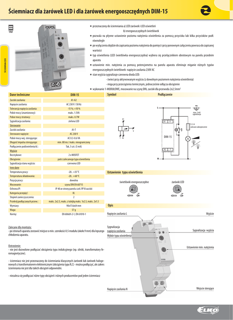 Ściemniacz dla żarówek LED i dla żarówek energooszczędnych DIM-15 przeznaczony do ściemniania a) LED żarówek i LED oświetleń b) energooszczędnych świetlówek ! pozwala na płynne ustawienie poziomu natężenia oświetlenia za pomocą przycisku lub kilka przycisków podł. równolegle ! po wyłączeniu dojdzie do zapisania poziomu natężenia do pamięci i przy ponownym załączeniu powraca do zapisanej wartości ! typ oświetlenia (LED świetlówka energooszczędna) wybiera się przełącznikiem obrotowym na panelu przednim aparatu ! ustawienie min. natężenia za pomocą potencjometra na panelu aparatu eliminuje miganie różnych typów energooszczędnych świetlówek- napięcie zasilania 230V AC ! stan wyjścia sygnalizuje czerowna dioda LED: - świeci przy aktywowanym wyjściu (z dowolnym poziomem natężenia oświetlenia) - miga przy przeciążeniu termicznym, jednocześnie odłącza obciążenie ! wykonanie 1-MODUŁOWE, mocowanie na szynę DIN, zaciski dla przewodu 2x2.5mm2 ŚCIEMNIACZE ! Dane techniczne Zaciski zasilania: Napięcie zasilania: Tolerancja napięcia zasilania: Pobór mocy (znamionowy): Pobor mocy stratowy: Sygnalizacja zasilania: Sterowanie Zaciski zasilania: Sterowane napięcie: Pobór mocy wej. sterującego: Długość impulsu sterującego: Podłączenie podświetlenia kl.: Wyjście Bezstykowe: Obciążenie: Sygnalizacja stanu wyjścia: Inne dane Temperatura pracy: Temperatura składowania: Pozycja pracy: Mocowanie: Ochrona IP: Kategoria przepięć: Stopień zanieczyszczenia: Przekrój podłączanych przew.: Wymiary: Waga: Normy: DIM-15 Symbol A1-A2 AC 230 V / 50 Hz -15 %; +10 % maks. 1.5VA maks. 0.7W zielona LED Podłączenie L max. 5 mA sygnalizacja A1 A1 V T 2.5 A zalecane zabezpieczenie A1-T AC 230 V AC 0.3-0.6 VA min. 80 ms / maks. nieograniczony Tak, 5 szt. (5 mA) V DIM-15 T A2 A2 2 x MOSFET patrz zalecanego typu oświetlenia czerwona LED -20.. +35 0C -20.. +60 0C dowolna szyna DIN EN 60715 IP 40 ze strony panelu czoł./IP10 zaciski III. 2 maks. 2x2.5, maks. z tulejką maks. 1x2.5, maks. 2x1.5 90x17.6x64 mm 57 g EN 60669-2-1, EN 61010-1 T N Ustawienie typu oświetlenia świetlówki energooszczędne żarówki LED Opis Wyjście Napięcie zasilania L A1 Sygnalizacja Zalecane dla montażu: - po stronach aparatu zostawić miejsce o min. szerokości 0.5 modułu (około 9 mm) dla lepszego napięcia zasilania chłodzenia aparatu. Wybór typu oświetlenia V DIM - 15 Sygnalizacja wyjścia Ostrzeżenie: - nie jest dozwolone podłączać obciążenia typu indukcyjnego (np. silniki, transformatory feromagnetyczne). Ustawienie min. natężenia - ściemniacz nie jest przeznaczony do ściemniania klasycznych żarówek lub żarówek halogenowych z transformatorem elektronicznym (obciążenia typu R,C) - można podłączyć, ale zakres ściemniania nie jest dla takich obciążeń odpowiedni. - niezaleca się podłączać różne typy obciążeń i różnych producentów pod jeden ściemniacz A2 Napięcie zasilania N T Wejscie sterujące Ściemniacz dla żarówek LED i dla żarówek energooszczędnych DIM-15 Funkcje Sterowanie: y krótkie naciśnięcie przycisku (< 0.5s) włączy/ wyłączy oświetlenie y długie naciśnięcie (> 0.5s) pozwala na płynna regulację poziomu natężenia oświetlenia. y ustawienie min. natężenia ośw. możliwe jest za pomocą długiego naciśnięcia przycisku Zasilanie A1-A2 <0.5s <0.5s >0.5s <0.5s Ustawienie min. natężenia: „LED żarówka“ : y jeżeli jest oświetlenie wyłączone, krótkie naciśnięcie (< 0.5s) załączy ośw. na ostatnio ustawiony poziom natężenia ośw. V min max max max V min „Energooszczędna świetlówka“ : y jeżeli jest ośw. wyłączone, krótkie naciśnięcie powoduje zwiększenie natężenia ośw. na maks. poziom (kiedy żarówka najpierw nastartuje) i potem ustawi się na odpowiedni poziom natężenia ośw. y ustawienie minimalnego natężenia dla żarówek energooszczędnych służy do określenia progu załączenia Zalecane typy oświetleń Przy naszej produkcji staramy się zawszę dotrzymać maksymalną uniwersalność naszych aparatów– u tego aparatu chodzi o rodzaje obciążeń. Dlatego że ściemnianie ośw. LED i świetlówek energooszczędnych jest nowością i niejest duża ilość producentów takich ośw. będziemy stopniowo testować i następującą tabele poszerzać. Przegląd testowanych typów oświetleń Typ Producent gniazdo BRILUM LED line white (21LED) ilość [ szt ] maks.obc. [W] GU10D 22 29 OSRAM DULUX EL.DIMMABLE LUMILUX Warm White 1230lm E27 11 220 MEGAMAN DIMMERABLE 2700K DEC01 E14 16 144 Ważne: y można ściemniać tylko żarówki LED wyposażone w zasilanie kondenzatorowe y nie można ściemniać energooszczędne świetlówki, które nie mają właściwość ściemniania y błędne usatwienie typu oświetlenia zmieni tylko zakres ściemniania, tzn. nie dojdzie do uszkodzenia ściemniacza lub obciążenia. y maks. obciążalność liczona jest w przypadku zastosowania filtra LC y aktualna lista testowanych oświetleń poszerzana jest i umieszczana na strone www.elkoep.com Przykład podłączenia N L A1 TV DIM - 15 A2 T p ych nia! ędn szcz świetle o o ia o nerg ek e tężen tlów iom na e i w z D i ś i po la LE owiedn d e ac z i ć o d p mni Ście ą u s t a w alaj ozw ŚCIEMNIACZE >0.5s T