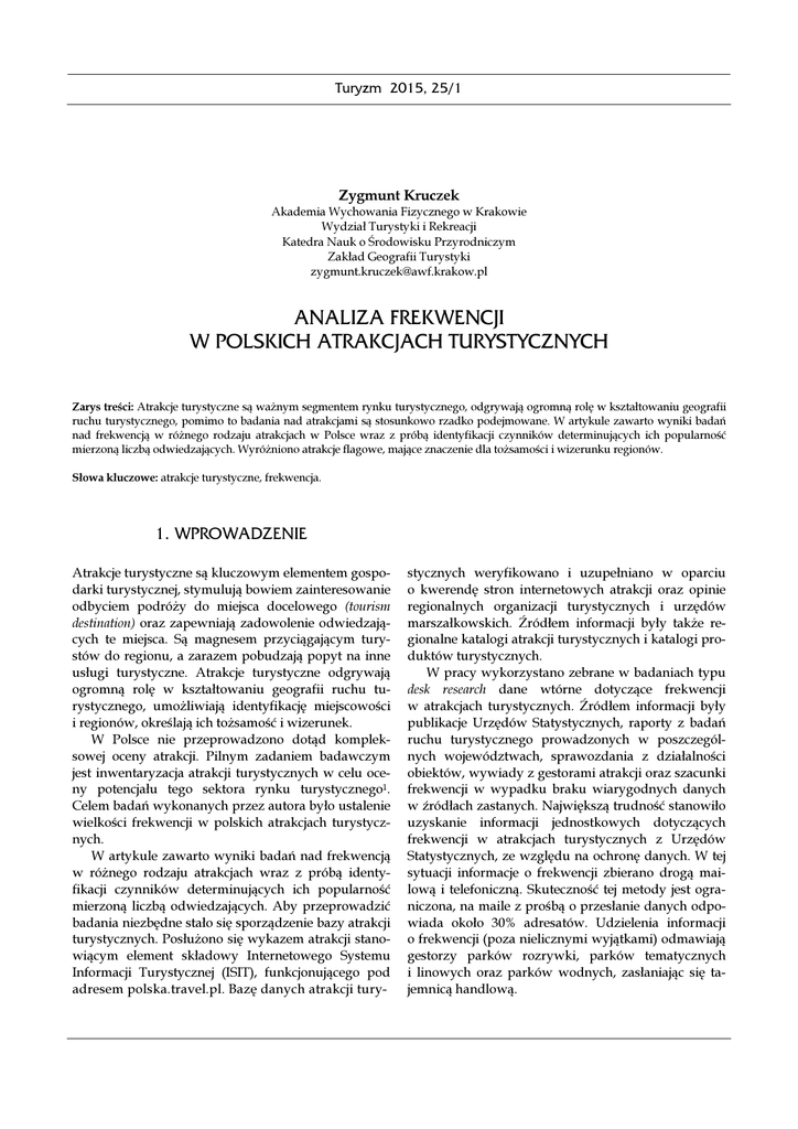 Turyzm 2015, 25/1 Zygmunt Kruczek Akademia Wychowania Fizycznego w Krakowie Wydział Turystyki i Rekreacji Katedra Nauk o Środowisku Przyrodniczym Zakład Geografii Turystyki [email protected] ANALIZA FREKWENCJI W POLSKICH ATRAKCJACH TURYSTYCZNYCH Zarys treści: Atrakcje turystyczne są ważnym segmentem rynku turystycznego, odgrywają ogromną rolę w kształtowaniu geografii ruchu turystycznego, pomimo to badania nad atrakcjami są stosunkowo rzadko podejmowane. W artykule zawarto wyniki badań nad frekwencją w różnego rodzaju atrakcjach w Polsce wraz z próbą identyfikacji czynników determinujących ich popularność mierzoną liczbą odwiedzających. Wyróżniono atrakcje flagowe, mające znaczenie dla tożsamości i wizerunku regionów. Słowa kluczowe: atrakcje turystyczne, frekwencja. 1. WPROWADZENIE Atrakcje turystyczne są kluczowym elementem gospodarki turystycznej, stymulują bowiem zainteresowanie odbyciem podróży do miejsca docelowego (tourism destination) oraz zapewniają zadowolenie odwiedzających te miejsca. Są magnesem przyciągającym turystów do regionu, a zarazem pobudzają popyt na inne usługi turystyczne. Atrakcje turystyczne odgrywają ogromną rolę w kształtowaniu geografii ruchu turystycznego, umożliwiają identyfikację miejscowości i regionów, określają ich tożsamość i wizerunek. W Polsce nie przeprowadzono dotąd kompleksowej oceny atrakcji. Pilnym zadaniem badawczym jest inwentaryzacja atrakcji turystycznych w celu oceny potencjału tego sektora rynku turystycznego1. Celem badań wykonanych przez autora było ustalenie wielkości frekwencji w polskich atrakcjach turystycznych. W artykule zawarto wyniki badań nad frekwencją w różnego rodzaju atrakcjach wraz z próbą identyfikacji czynników determinujących ich popularność mierzoną liczbą odwiedzających. Aby przeprowadzić badania niezbędne stało się sporządzenie bazy atrakcji turystycznych. Posłużono się wykazem atrakcji stanowiącym element składowy Internetowego Systemu Informacji Turystycznej (ISIT), funkcjonującego pod adresem polska.travel.pl. Bazę danych atrakcji tury- stycznych weryfikowano i uzupełniano w oparciu o kwerendę stron internetowych atrakcji oraz opinie regionalnych organizacji turystycznych i urzędów marszałkowskich. Źródłem informacji były także regionalne katalogi atrakcji turystycznych i katalogi produktów turystycznych. W pracy wykorzystano zebrane w badaniach typu desk research dane wtórne dotyczące frekwencji w atrakcjach turystycznych. Źródłem informacji były publikacje Urzędów Statystycznych, raporty z badań ruchu turystycznego prowadzonych w poszczególnych województwach, sprawozdania z działalności obiektów, wywiady z gestorami atrakcji oraz szacunki frekwencji w wypadku braku wiarygodnych danych w źródłach zastanych. Największą trudność stanowiło uzyskanie informacji jednostkowych dotyczących frekwencji w atrakcjach turystycznych z Urzędów Statystycznych, ze względu na ochronę danych. W tej sytuacji informacje o frekwencji zbierano drogą mailową i telefoniczną. Skuteczność tej metody jest ograniczona, na maile z prośbą o przesłanie danych odpowiada około 30% adresatów. Udzielenia informacji o frekwencji (poza nielicznymi wyjątkami) odmawiają gestorzy parków rozrywki, parków tematycznych i linowych oraz parków wodnych, zasłaniając się tajemnicą handlową. 48 Turyzm 2015, 25/1 Atrakcje turystyczne są podstawowym elementem produktu turystycznego. W opracowaniu przyjęto produktową definicję atrakcji i zaproponowano ich klasyfikację, uwzględniającą potrzeby rynku turystycznego. Przeprowadzono ranking atrakcji na podstawie stopnia przyciągania turystów w odpowiednich grupach tematycznych. W badaniach uwzględniono aspekt regionalny, pokazując nasycenie atrakcjami poszczególnych regionów oraz generowany przez nie ruch turystyczny. Wskazano na atrakcje flagowe, ważne dla tworzenia wizerunku regionu oraz takie, które mają duży potencjał rozwoju. 2. PRODUKTOWE UJĘCIE ATRAKCJI TURYSTYCZNYCH Termin „atrakcja turystyczna” jest trudny do zdefiniowania z wielu powodów, np. nie określono dotąd liczby odwiedzających, jaka jest potrzebna, aby dane miejsce uznać za atrakcję turystyczną. Zasady typowania i klasyfikacji są skomplikowane ze względu na złożony charakter całego sektora atrakcji. Pojecie „atrakcja turystyczna” wprowadził do literatury E. COHEN (1972). W swojej rozprawie socjologicznej Towards a Sociology of International Tourism stwierdza, że głównym celem masowej turystyki zagranicznej jest odwiedzanie atrakcji turystycznych. Dzieli je na rzeczywiste – przyciągające turystów ze względu na swoje szczególne cechy, oraz sztuczne – „wymyślone” na użytek turystów. Początkowo określano atrakcje turystyczne jako „cokolwiek, co zaciekawia turystów” (LUNDBERG 1985) albo jako „miejsce charakterystyczne, często unikatowe, np. naturalne środowisko, zabytek historyczny, takie wydarzenia jak festiwale i imprezy sportowe” (GOODALL 1990). W podobny sposób definiują atrakcje turystyczne inni autorzy (LEW 1974, DAVIDSON 1996, RICHARDS 2002). Natomiast N. LEIPER (1990) budując system atrakcji turystycznych wprowadza pojęcie markerów (oznaczników), które motywują turystę do odbycia podróży. Socjologiczną wykładnię rozumienia atrakcji proponuje D. MCCANNELL (1996), który twierdzi, że nowoczesne społeczeństwo samo kreuje odpowiednie dla swoich potrzeb atrakcje. Podobnie P.L. PEARCE (1998), a także J. URRY (2007) sugerują, że „atrakcjami są miejsca i osoby, które są przedmiotem uwagi turystów”. W literaturze anglojęzycznej atrakcje turystyczne często są nazywane visitor attractions – atrakcjami dla odwiedzających (SWARBROOKE 1995), co sugeruje adresowanie atrakcji nie tylko do przyjezdnych, ale i do lokalnej społeczności. Atrakcje turystyczne są zjawiskiem złożonym i w literaturze różnorodnie definio