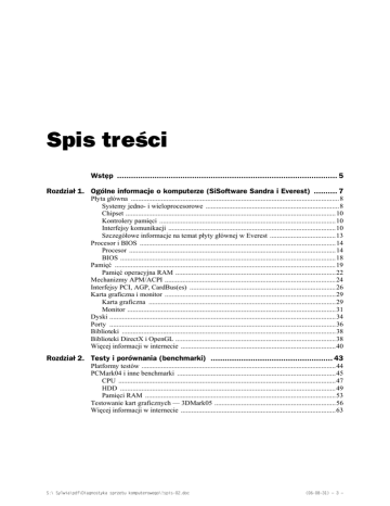Spis treści Wstęp .............................................................................................. 5 Rozdział 1. Ogólne informacje o komputerze (SiSoftware Sandra i Everest) .......... 7 Płyta główna .....................................................................................................................8 Systemy jedno- i wieloprocesorowe ...........................................................................8 Chipset ......................................................................................................................10 Kontrolery pamięci ...................................................................................................10 Interfejsy komunikacji ..............................................................................................10 Szczegółowe informacje na temat płyty głównej w Everest .....................................13 Procesor i BIOS ..............................................................................................................14 Procesor ....................................................................................................................14 BIOS .........................................................................................................................18 Pamięć ............................................................................................................................19 Pamięć operacyjna RAM ..........................................................................................22 Mechanizmy APM/ACPI ................................................................................................24 Interfejsy PCI, AGP, CardBus(es) ..................................................................................26 Karta graficzna i monitor ................................................................................................29 Karta graficzna .........................................................................................................29 Monitor .....................................................................................................................31 Dyski ...............................................................................................................................34 Porty ...............................................................................................................................36 Biblioteki ........................................................................................................................38 Biblioteki DirectX i OpenGL ..........................................................................................38 Więcej informacji w internecie .......................................................................................40 Rozdział 2. Testy i porównania (benchmarki) .................................................... 43 Platformy testów .............................................................................................................44 PCMark04 i inne benchmarki .........................................................................................45 CPU ..........................................................................................................................47 HDD .........................................................................................................................49 Pamięci RAM ...........................................................................................................53 Testowanie kart graficznych — 3DMark05 ....................................................................56 Więcej informacji w internecie .......................................................................................63 S:\ Sylwia\pdf\Diagnostyka sprzetu komputerowego\!spis-02.doc (06-08-31) — 3 — 4 Diagnostyka sprzętu komputerowego Rozdział 3. Monitorowanie i kontrola fizycznych parametrów komputera (SpeedFan) .................................................................................... 65 Co potrafi SpeedFan? ......................................................................................................65 Monitorowanie komputera ..............................................................................................67 Temperatury .............................................................................................................69 Napięcia i prędkości wentylatorów ...........................................................................71 Mechanizm S.M.A.R.T. ..................................................................................................74 Alarmy ............................................................................................................................76 Wykresy ..........................................................................................................................77 Zmiana taktowania zegara płyty głównej ........................................................................78 Więcej informacji w internecie .......................................................................................80 Rozdział 4. Diagnostyka sieci ........................................................................... 83 Połączenie z siecią ..........................................................................................................83 Zabezpieczenie komputera .......................................................................................83 Sygnalizacja braku połączenia ..................................................................................84 Sprawdzanie konfiguracji sieci. Adres IP .................................................................85 Testowanie połączenia. Polecenie PING ..................................................................88 Diagnostyka sieci z wykorzystaniem narzędzi systemu Windows ..................................89 Sieci bezprzewo