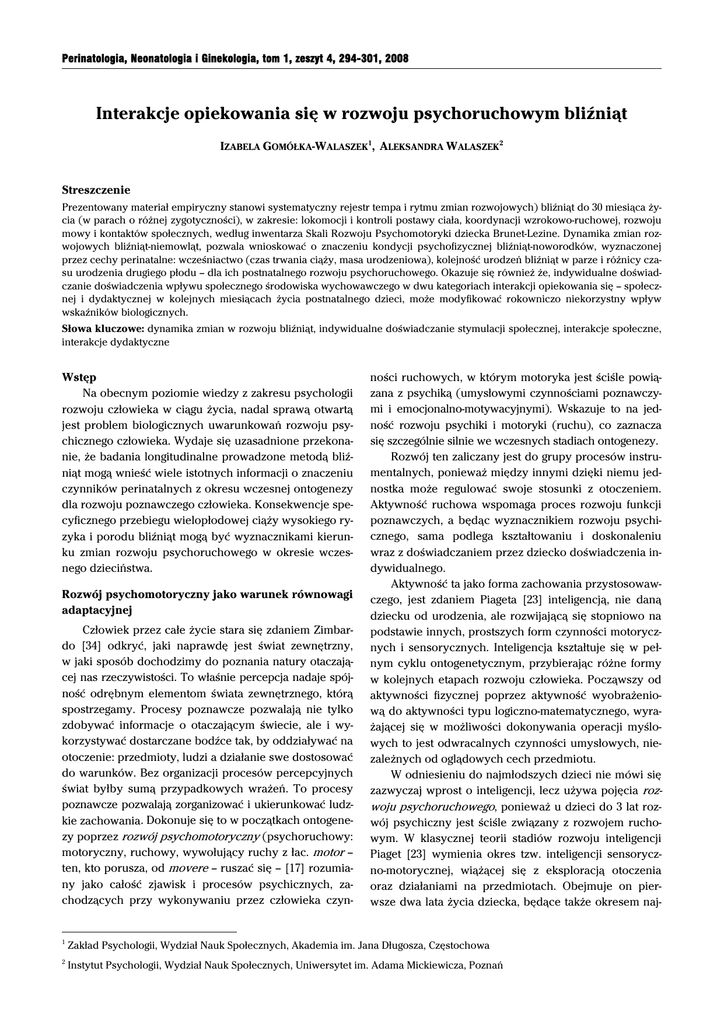 Perinatologia, Neonatologia i Ginekologia, tom 1, zeszyt 4, 294-301, 2008 Interakcje opiekowania się w rozwoju psychoruchowym bliźniąt IZABELA GOMÓŁKA-WALASZEK1, ALEKSANDRA WALASZEK2 Streszczenie Prezentowany materiał empiryczny stanowi systematyczny rejestr tempa i rytmu zmian rozwojowych) bliźniąt do 30 miesiąca życia (w parach o różnej zygotyczności), w zakresie: lokomocji i kontroli postawy ciała, koordynacji wzrokowo-ruchowej, rozwoju mowy i kontaktów społecznych, według inwentarza Skali Rozwoju Psychomotoryki dziecka Brunet-Lezine. Dynamika zmian rozwojowych bliźniąt-niemowląt, pozwala wnioskować o znaczeniu kondycji psychofizycznej bliźniąt-noworodków, wyznaczonej przez cechy perinatalne: wcześniactwo (czas trwania ciąży, masa urodzeniowa), kolejność urodzeń bliźniąt w parze i różnicy czasu urodzenia drugiego płodu – dla ich postnatalnego rozwoju psychoruchowego. Okazuje się również że, indywidualne doświadczanie doświadczenia wpływu społecznego środowiska wychowawczego w dwu kategoriach interakcji opiekowania się – społecznej i dydaktycznej w kolejnych miesiącach życia postnatalnego dzieci, może modyfikować rokowniczo niekorzystny wpływ wskaźników biologicznych. Słowa kluczowe: dynamika zmian w rozwoju bliźniąt, indywidualne doświadczanie stymulacji społecznej, interakcje społeczne, interakcje dydaktyczne Wstęp Na obecnym poziomie wiedzy z zakresu psychologii rozwoju człowieka w ciągu życia, nadal sprawą otwartą jest problem biologicznych uwarunkowań rozwoju psychicznego człowieka. Wydaje się uzasadnione przekonanie, że badania longitudinalne prowadzone metodą bliźniąt mogą wnieść wiele istotnych informacji o znaczeniu czynników perinatalnych z okresu wczesnej ontogenezy dla rozwoju poznawczego człowieka. Konsekwencje specyficznego przebiegu wielopłodowej ciąży wysokiego ryzyka i porodu bliźniąt mogą być wyznacznikami kierunku zmian rozwoju psychoruchowego w okresie wczesnego dzieciństwa. Rozwój psychomotoryczny jako warunek równowagi adaptacyjnej Człowiek przez całe życie stara się zdaniem Zimbardo [34] odkryć, jaki naprawdę jest świat zewnętrzny, w jaki sposób dochodzimy do poznania natury otaczającej nas rzeczywistości. To właśnie percepcja nadaje spójność odrębnym elementom świata zewnętrznego, którą spostrzegamy. Procesy poznawcze pozwalają nie tylko zdobywać informacje o otaczającym świecie, ale i wykorzystywać dostarczane bodźce tak, by oddziaływać na otoczenie: przedmioty, ludzi a działanie swe dostosować do warunków. Bez organizacji procesów percepcyjnych świat byłby sumą przypadkowych wrażeń. To procesy poznawcze pozwalają zorganizować i ukierunkować ludzkie zachowania. Dokonuje się to w początkach ontogenezy poprzez rozwój psychomotoryczny (psychoruchowy: motoryczny, ruchowy, wywołujący ruchy z łac. motor – ten, kto porusza, od movere – ruszać się – [17] rozumiany jako całość zjawisk i procesów psychicznych, zachodzących przy wykonywaniu przez człowieka czyn- ności ruchowych, w którym motoryka jest ściśle powiązana z psychiką (umysłowymi czynnościami poznawczymi i emocjonalno-motywacyjnymi). Wskazuje to na jedność rozwoju psychiki i motoryki (ruchu), co zaznacza się szczególnie silnie we wczesnych stadiach ontogenezy. Rozwój ten zaliczany jest do grupy procesów instrumentalnych, ponieważ między innymi dzięki niemu jednostka może regulować swoje stosunki z otoczeniem. Aktywność ruchowa wspomaga proces rozwoju funkcji poznawczych, a będąc wyznacznikiem rozwoju psychicznego, sama podlega kształtowaniu i doskonaleniu wraz z doświadczaniem przez dziecko doświadczenia indywidualnego. Aktywność ta jako forma zachowania przystosowawczego, jest zdaniem Piageta [23] inteligencją, nie daną dziecku od urodzenia, ale rozwijającą się stopniowo na podstawie innych, prostszych form czynności motorycznych i sensorycznych. Inteligencja kształtuje się w pełnym cyklu ontogenetycznym, przybierając różne formy w kolejnych etapach rozwoju człowieka. Począwszy od aktywności fizycznej poprzez aktywność wyobrażeniową do aktywności typu logiczno-matematycznego, wyrażającej się w możliwości dokonywania operacji myślowych to jest odwracalnych czynności umysłowych, niezależnych od oglądowych cech przedmiotu. W odniesieniu do najmłodszych dzieci nie mówi się zazwyczaj wprost o inteligencji, lecz używa pojęcia rozwoju psychoruchowego, ponieważ u dzieci do 3 lat rozwój psychiczny jest ściśle związany z rozwojem ruchowym. W klasycznej teorii stadiów rozwoju inteligencji Piaget [23] wymienia okres tzw. inteligencji sensoryczno-motorycznej, wiążącej się z eksploracją otoczenia oraz działaniami na przedmiotach. Obejmuje on pierwsze dwa lata życia dziecka, będące także okresem naj- 1 Zakład Psychologii, Wydział Nauk Społecznych, Akademia im. Jana Długosza, Częstochowa 2 Instytut Psychologii, Wydział Nauk Społecznych, Uniwersytet im. Adama Mickiewicza, Poznań Interakcje opiekowania się w rozwoju psychoruchowym bliźniąt intensywniejszych zmian sprawności ruchowej. W tym czasie trudno jest rozdzielić rozwój ruchowy od intelektualnego i można łącznie mówić o rozwoju psychoruchowym – należy jednak pamiętać, że już po trzecim roku życia pojęcie rozwoju psychoruchowego traci aktualność Psychologiczne odniesienie do cech perinatalnych wielopłodowej ciąży wysokiego ryzyka W fazie prenatalnej – jak pisze Kornas-Biela [18] – rozwoju człowieka tworzą się biologiczne podstawy kształtowania niektórych aspektów osobowości, mających swe podłoże w strukturze i funkcji układu nerwowego. Specyficzne, biologiczne cechy perinatalne dla ciąż wysokiego ryzyka i porodów bliźniąt mają swoiste skutki w obrazie długoterminowych zmian rozwoju poznawczego człowieka w okresie postnatalnym. Szczególnym problemem medycyny perinatalnej jest wielopłodowa, 