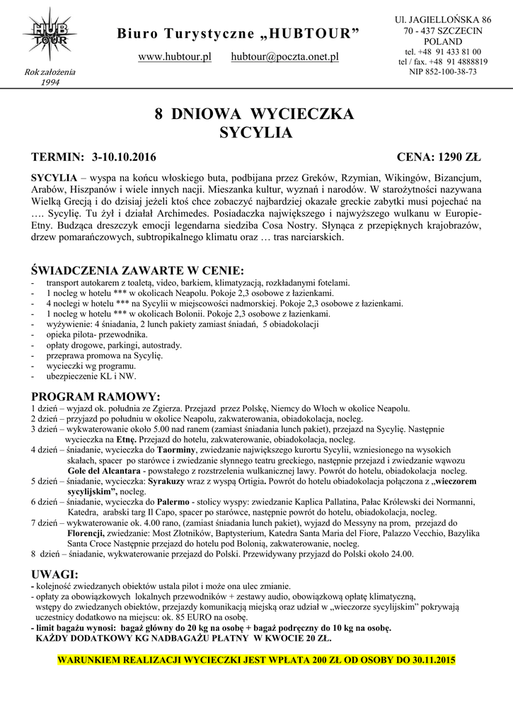 Biuro Tury styczne „HUBTOUR” r www.hubtour.pl [email protected] Rok założenia 1994 Ul. JAGIELLOŃSKA 86 70 - 437 SZCZECIN POLAND tel. +48 91 433 81 00 tel / fax. +48 91 4888819 NIP 852-100-38-73 8 DNIOWA WYCIECZKA SYCYLIA TERMIN: 3-10.10.2016 CENA: 1290 ZŁ SYCYLIA – wyspa na końcu włoskiego buta, podbijana przez Greków, Rzymian, Wikingów, Bizancjum, Arabów, Hiszpanów i wiele innych nacji. Mieszanka kultur, wyznań i narodów. W starożytności nazywana Wielką Grecją i do dzisiaj jeżeli ktoś chce zobaczyć najbardziej okazałe greckie zabytki musi pojechać na …. Sycylię. Tu żył i działał Archimedes. Posiadaczka największego i najwyższego wulkanu w EuropieEtny. Budząca dreszczyk emocji legendarna siedziba Cosa Nostry. Słynąca z przepięknych krajobrazów, drzew pomarańczowych, subtropikalnego klimatu oraz … tras narciarskich. ŚWIADCZENIA ZAWARTE W CENIE: - transport autokarem z toaletą, video, barkiem, klimatyzacją, rozkładanymi fotelami. 1 nocleg w hotelu *** w okolicach Neapolu. Pokoje 2,3 osobowe z łazienkami. 4 noclegi w hotelu *** na Sycylii w miejscowości nadmorskiej. Pokoje 2,3 osobowe z łazienkami. 1 nocleg w hotelu *** w okolicach Bolonii. Pokoje 2,3 osobowe z łazienkami. wyżywienie: 4 śniadania, 2 lunch pakiety zamiast śniadań, 5 obiadokolacji opieka pilota- przewodnika. opłaty drogowe, parkingi, autostrady. przeprawa promowa na Sycylię. wycieczki wg programu. ubezpieczenie KL i NW. PROGRAM RAMOWY: 1 dzień – wyjazd ok. południa ze Zgierza. Przejazd przez Polskę, Niemcy do Włoch w okolice Neapolu. 2 dzień – przyjazd po południu w okolice Neapolu, zakwaterowania, obiadokolacja, nocleg. 3 dzień – wykwaterowanie około 5.00 nad ranem (zamiast śniadania lunch pakiet), przejazd na Sycylię. Następnie wycieczka na Etnę. Przejazd do hotelu, zakwaterowanie, obiadokolacja, nocleg. 4 dzień – śniadanie, wycieczka do Taorminy, zwiedzanie największego kurortu Sycylii, wzniesionego na wysokich skałach, spacer po starówce i zwiedzanie słynnego teatru greckiego, następnie przejazd i zwiedzanie wąwozu Gole del Alcantara - powstałego z rozstrzelenia wulkanicznej lawy. Powrót do hotelu, obiadokolacja nocleg. 5 dzień – śniadanie, wycieczka: Syrakuzy wraz z wyspą Ortigia. Powrót do hotelu obiadokolacja połączona z „wieczorem sycylijskim”, nocleg. 6 dzień – śniadanie, wycieczka do Palermo - stolicy wyspy: zwiedzanie Kaplica Pallatina, Pałac Królewski dei Normanni, Katedra, arabski targ Il Capo, spacer po starówce, następnie powrót do hotelu, obiadokolacja, nocleg. 7 dzień – wykwaterowanie ok. 4.00 rano, (zamiast śniadania lunch pakiet), wyjazd do Messyny na prom, przejazd do Florencji, zwiedzanie: Most Złotników, Baptysterium, Katedra Santa Maria del Fiore, Palazzo Vecchio, Bazylika Santa Croce Następnie przejazd do hotelu pod Bolonią, zakwaterowanie, nocleg. 8 dzień – śniadanie, wykwaterowanie przejazd do Polski. Przewidywany przyjazd do Polski około 24.00. UWAGI: - kolejność zwiedzanych obiektów ustala pilot i może ona ulec zmianie. - opłaty za obowiązkowych lokalnych przewodników + zestawy audio, obowiązkową opłatę klimatyczną, wstępy do zwiedzanych obiektów, przejazdy komunikacją miejską oraz udział w „wieczorze sycylijskim” pokrywają uczestnicy dodatkowo na miejscu: ok. 85 EURO na osobę. - limit bagażu wynosi: bagaż główny do 20 kg na osobę + bagaż podręczny do 10 kg na osobę. KAŻDY DODATKOWY KG NADBAGAŻU PŁATNY W KWOCIE 20 ZŁ. WARUNKIEM REALIZACJI WYCIECZKI JEST WPŁATA 200 ZŁ OD OSOBY DO 30.11.2015