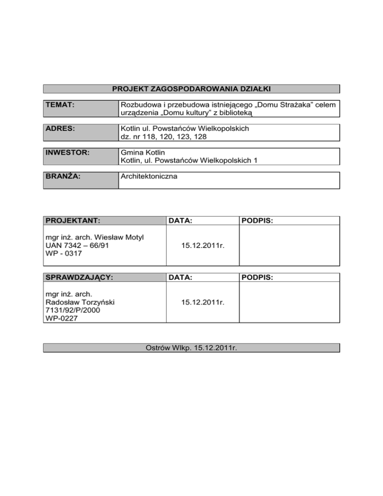 PROJEKT ZAGOSPODAROWANIA DZIAŁKI TEMAT: Rozbudowa i przebudowa istniejącego „Domu StraŜaka” celem urządzenia „Domu kultury” z biblioteką ADRES: Kotlin ul. Powstańców Wielkopolskich dz. nr 118, 120, 123, 128 INWESTOR: Gmina Kotlin Kotlin, ul. Powstańców Wielkopolskich 1 BRANśA: Architektoniczna PROJEKTANT: mgr inŜ. arch. Wiesław Motyl UAN 7342 – 66/91 WP - 0317 SPRAWDZAJĄCY: mgr inŜ. arch. Radosław Torzyński 7131/92/P/2000 WP-0227 DATA: PODPIS: 15.12.2011r. DATA: 15.12.2011r. Ostrów Wlkp. 15.12.2011r. PODPIS: Rozbudowa i przebudowa istniejącego „Domu StraŜaka” celem urządzenia „Domu Kultury” z biblioteką Kotlin, ul. Powstańców Wielkopolskich Działka nr118,120,123,125,128 sekcja 2-B ZAWARTOŚĆ OPRACOWANIA 1.Strona tytułowa. 2.Zawartość opracowania. 3.Opis do planu zagospodarowania. 4.Załączniki formalno-prawne 5.Część graficzna: Nazwa rysunku: • PROJEKT ZAGOSPODAROWANIA TERENU • PRZEKROJE NAWIERZCHNI Pracownia Architektoniczna “Arcus” mgr inŜ. arch. Wiesław Motyl 63-400 Ostrów Wlkp., ul. Krotoszyńska 18 tel. 62 592 42 00, fax. 62 592 42 01 e-mail: [email protected] Skala rys: 1:500 1:10 Nr rys: 1 2 2 Rozbudowa i przebudowa istniejącego „Domu StraŜaka” celem urządzenia „Domu Kultury” z biblioteką Kotlin, ul. Powstańców Wielkopolskich Działka nr118,120,123,125,128 sekcja 2-B ZAŁĄCZNIKI FORMALNO PRAWNE 1. 2. 3. 4. 5. 6. -Decyzja o lokalizacji inwestycji celu publicznego -Zapewnienie dostawy wody -Aktualna mapa do celów projektowych -Zapewnienie dostawy energii elektrycznej -Zapewnienie dostawy gazu -Warunki wykonania przyłącza kanalizacji sanitarnej Pracownia Architektoniczna “Arcus” mgr inŜ. arch. Wiesław Motyl 63-400 Ostrów Wlkp., ul. Krotoszyńska 18 tel. 62 592 42 00, fax. 62 592 42 01 e-mail: [email protected] 3 Rozbudowa i przebudowa istniejącego „Domu StraŜaka” celem urządzenia „Domu Kultury” z biblioteką Kotlin, ul. Powstańców Wielkopolskich Działka nr118,120,123,125,128 sekcja 2-B OPIS TECHNICZNY DO PROJEKTU ZAGOSPODAROWANIA TERENU ROZBUDOWY I PRZEBUDOWY ISTNIEJĄCEGO „DOMU STRAśAKA” CELEM URZĄDZENIA „DOMU KULTURY” Z BIBLIOTEKĄ (DZ. NR 118, 120, 123, 125, 128, SEKCJA 2B) 1.DANE OGÓLNE 1.1.Obiekt: Rozbudowa i przebudowa istniejącego „Domu StraŜaka” celem urządzenia „Domu kultury” z biblioteką 1.2.Adres: 63-220 Kotlin Ul. Powstańców Wielkopolskich dz. nr. 118, 120, 123, 125, 128, SEKCJA 2B 1.3.Inwestor: Gmina Kotlin 63-220 Kotlin Ul. Powstańców Wielkopolskich 1 1.4.Własność terenu: Gmina Kotlin 63-220 Kotlin Ul. Powstańców Wielkopolskich 1 1.5.Jednostka projektująca: Pracownia Architektoniczna „Arcus” mgr inŜ. arch. Wiesław Motyl 63-400 Ostrów Wlkp., ul. Krotoszyńska 18 1.6.Wykonawca: Wyłoniony zostanie w drodze przetargu po uzyskaniu pozwolenia na budowę. 1.7.Podstawa opracowania: -Umowa z Inwestorem. -Koncepcja architektoniczna uzgodniona z Inwestorem -Decyzja o lokalizacji inwestycji celu publicznego -Zapewnienie dostawy wody -Aktualna mapa do celów projektowych -Zapewnienie dostawy energii elektrycznej -Zapewnienie dostawy gazu -Warunki wykonania przyłącza kanalizacji sanitarnej Pracownia Architektoniczna “Arcus” mgr inŜ. arch. Wiesław Motyl 63-400 Ostrów Wlkp., ul. Krotoszyńska 18 tel. 62 592 42 00, fax. 62 592 42 01 e-mail: [email protected] 4 Rozbudowa i przebudowa istniejącego „Domu StraŜaka” celem urządzenia „Domu Kultury” z biblioteką Kotlin, ul. Powstańców Wielkopolskich Działka nr118,120,123,125,128 sekcja 2-B 1.8.Dane techniczne: Wymiary zewnętrzne budynku -szerokość elewacji frontowej -długość elewacji bocznej -wysokość max. Istniejącego budynku 11,56 m Części projektowanej 20,05 m Łącznie po rozbudowie 20,05 m 23,00 m 16,40 m 39,4 m 8,73 m 9,82 m 9,82 m Projektowany poziom posadzki parteru ±0,00 = 126,60 m.n.p.m. Istniejący poziom posadzki parteru ±0,00 = 126,60 m.n.p.m. Powierzchnie -zabudowy -całkowita -netto -uŜytkowa -kubatura Istniejącego budynku 273,99 m2 547,98 m2 469,60 m2 469,60 m2 2712,50 m3 Części projektowanej 296,86 m2 593,72 m2 532,26 m2 532,26 m2 2938,91 m3 Kąt nachylenia dachów w części istniejącej Kąt nachylenia dachów w części projektowanej Łącznie po rozbudowie 520,85 m2 1041,70 m2 1001,86 m2 101,86 m2 5156,41 m3 Dach płaski Dach płaski: ok. 3º 1.9.Liczba kondygnacji: -budynek istniejący: 2 kondygnacyjny, podpiwniczony – piwnice przeznaczone są do likwidacji i zostaną zasypane. -budynek projektowany: równieŜ dwukondygnacyjny powiązany z częścią istniejącą. 1.10.Wysokość pomieszczeń w stanie gotowym: - budynek istniejący: - piwnica - parter - część garaŜowa - I piętro - budynek projektowany: - parter - piętro Pracownia Architektoniczna “Arcus” mgr inŜ. arch. Wiesław Motyl 63-400 Ostrów Wlkp., ul. Krotoszyńska 18 tel. 62 592 42 00, fax. 62 592 42 01 e-mail: [email protected] Projektowana likwidacja piwnicy 2,76 m 4,00 m 3,69 m 2,76 m 3,69 m 5 Rozbudowa i przebudowa istniejącego „Domu StraŜaka” celem urządzenia „Domu Kultury” z biblioteką Kotlin, ul. Powstańców Wielkopolskich Działka nr118,120,123,125,128 sekcja 2-B 2.OPIS DO PROJEKTU ZAGOSPODAROWANIA DZIAŁKI 2.1.Przedmiot inwestycji, zakres całego zamierzenia oraz kolejność realizacji obiektów: Przedmiotem inwestycji jest rozbudowa i przebudowa budynku domu straŜaka (ochotniczej straŜy poŜarnej) w Kotlinie. Zakres zamierzenia obejmuje część nową, dobudowywaną w skład której wchodzą pomieszczenia przeznaczone na bibliotekę wraz z niezbędnym zapleczem, oraz z zapleczem sanitarnym i socjalnym. Przy bibliotece przewidziane zostały pomieszczenia czytelni oraz pomieszczenie przeznaczone na korzystanie z zasobów internetowych wyposaŜone w 6 stanowisk komputerowych. Na piętrze dobudowanej części znajdą się pomieszczenia biurowe wraz z zapleczem socjalnym. Zaprojektowano następujące pomieszczenia: pomieszczenie przeznaczone dla chórz