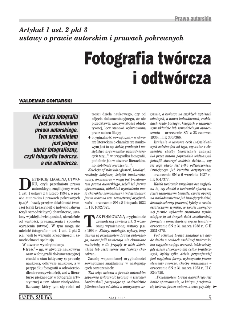 Prawo autorskie Artykuł 1 ust. 2 pkt 3 ustawy o prawie autorskim i prawach pokrewnych Fotografia twórcza i odtwórcza WALDEMAR GONTARSKI Nie każda fotografia jest przedmiotem prawa autorskiego. Tym przedmiotem jest jedynie utwór fotograficzny, czyli fotografia twórcza, a nie odtwórcza. EFINICJĘ LEGALNĄ UTWO− RU, czyli przedmiotu prawa autorskiego, znajdujemy w art. 1 ust. 1 ustawy z 4 lutego 1994 r. o pra− wie autorskim i prawach pokrewnych (p.a.)1 – każdy przejaw działalności twór− czej (czyli kreacyjnej) o indywidualnym (czyli samodzielnym) charakterze, usta− lony w jakiejkolwiek postaci, niezależnie od wartości, przeznaczenia i sposobu wyrażenia (utwór). W tym mogą się mieścić fotografie – art. 1 ust. 2 pkt 3 p.a., jeśli te warunki kreacyjności i sa− modzielności spełniają. W utworze wyodrębniamy: t treść2 – np. w utworze naukowym oraz w fotografii dokumentacyjnej chodzi o stan faktyczny (o prawdę naukową, odkrycie naukowe, a w przypadku fotografii o odzwiercie− dlenie rzeczywistości), zaś w litera− turze pięknej czy w fotografii arty− stycznej o tzw. obraz zindywidua− lizowany, który tym się różni od D treści dzieła naukowego, czy od zdjęcia dokumentacyjnego, że nie przedstawia rzeczywistości obiek− tywnej, lecz stanowi wykreowaną przez autora fikcję; t oryginalność zewnętrzną – w utwo− rze literackim o charakterze nauko− wym jest to np. dobór, gradacja i na− stępstwo argumentów uzasadniają− cych tezę...3; w przypadku fotografii, podobnie jak w utworze literackim, np. dobitność wyrażenia...4. Kolekcja afiszów lub ogłoszeń, katalogi, rozkłady kolejowe, książki kucharskie, wzory, formularze – mogą być przedmio− tem prawa autorskiego, jeżeli ich forma opracowania, układ lub wyjaśnienia ma− ją charakter samodzielny i indywidualny; jest to ochrona tzw. zewnętrznej oryginal− ności – orzeczenie SN z 8 listopada 1932 r., 1 K 1092/325. AK POJMOWANĄ oryginalność zewnętrzną zawiera art. 3 wcze− śniej wymienionej ustawy p.a. z 1994 r.: Zbiory, antologie, wybory, bazy danych są przedmiotem prawa autorskie− go, nawet jeśli zawierają nie chronione materiały, o ile przyjęty w nich dobór, układ lub zestawienie ma twórczy cha− rakter... Zasadę wspomnianej oryginalności zewnętrznej znajdujemy w następują− cych orzeczeniach: Tak więc ustawa o prawie autorskim zapewnia wyłączność twórczą w szerokiej bardzo skali, poczynając np. w dziedzinie piśmienniczej od dzieła o najwyższym ar− T MAJ 2005 tyzmie, a kończąc na zwykłych wypisach szkolnych, a nawet kalendarzach, rozkła− dach jazdy pociągu, księgach o samoist− nym układzie lub samodzielnym opraco− waniu – orzeczenie SN z 23 czerwca 1936 r., I K 336/366. Istnienie w utworze cech indywidual− nych zależne jest od tego, czy autor z ele− mentów choćby powszechnie znanych lub przez autora poprzednio widzianych potrafił stworzyć osobiste dzieło..., czy też jego utwór jest tylko odtworzeniem istniejącego już kształtu artystycznego – orzeczenie SN z 6 września 1937 r., I K 651/377. Każda twórczość umysłowa bez względu na to, czy chodzi o twórczość opartą na ściśle samoistnym pomyśle, czy też opartą na naśladownictwie już istniejących dzieł, doznaje ochrony prawnej, byleby w swoim ostatecznym wyniku, w swojej zewnętrz− nej formie wykazała znamiona wyróż− niające ją od innych dzieł osobliwością pomysłu i umiejętnością ujęcia tematu – orzeczenie SN z 31 marca 1938 r., C II 2531/378. Pod ochroną prawa znajduje się każ− de dzieło o cechach osobliwej twórczości bez względu na jego wartość, także wtedy, gdy dzieło stworzono dla celów praktycz− nych, byleby tylko dzieło przynajmniej pod względem formy, wykazywało pewne elementy twórcze, choćby minimalne – orzeczenie SN z 31 marca 1953 r., II C 834/529. ...Przedmiotem prawa autorskiego jest każde opracowanie, w którym przejawia się twórcza praca autora, a wiec gdy dzię− 9 Prawo autorskie ki pomysłowości i indywidualnemu ujęciu dzieło uzyskało oryginalną postać. Wymie− nione... cechy posiadać może także in− formator o porcie, zawierający dane tech− niczno−handlowe..., jeśli autor jego opra− cował w sposób twórczy zebrane przez siebie materiały – orzeczenie SN z 27 marca 1965 r., I CR 39/6510. Natomiast nie ma charakteru twórczego działalność organizacyjno−techniczna polegająca na realizacji określonego programu... według przyjętych zasad... – orzeczenie SN z 10 lutego 1970 r., II CR 606/6911. Odnośnie do fotografii w kontekście prawa autorskiego – orzecznictwo za− uważa: t O zakwalifikowaniu fotografii jako dzieła sztuki decydują cechy, które należy stwierdzić na niej samej. Cho− dzi mianowicie o to, czy wykazują one inwencję i samodzielność arty− styczną – orzeczenie SN z 12 marca 1958 r., II CR 347/5712. t Utwór fotograficzny, który nosi cechy osobistej twórczości jego autora oraz czyni zadość przepisowi art. 2 § 1 ustawy o prawie autorskim, jest przedmiotem prawa autorskiego i podlega ochronie przewidzianej w tej ustawie. Nie podlega takiej ochronie fotografia, która spełnia funkcję wyłącznie rejestracyjną (np. jest wykonana według wyraźnie dla autora określonego sposobu, przy za− stosowaniu ściśle określonych norm itp.), gdyż pozbawiona jest cech twór− czości osobistej – wyrok SN z 5 paź− dziernika 1976 r., IV CR 127/7613. t Mimo, że powód wykonywał fotogra− fie miejsc wskazanych przez autorkę tekstu i stosowanie do jej wskazówek mających w zamierzeniu autorki za− pewnić sporządzenie zdjęć−dokumen− tów, to nie były to instrukcje tak szczegółowe, by wyłączały inwencję powoda. W każdym bądź razie od po− woda zależało, które fragmenty kra− jobrazu czy wnętrza znajdą się na pierwszym planie i będą dzięki temu eksponowane i jak będzie po